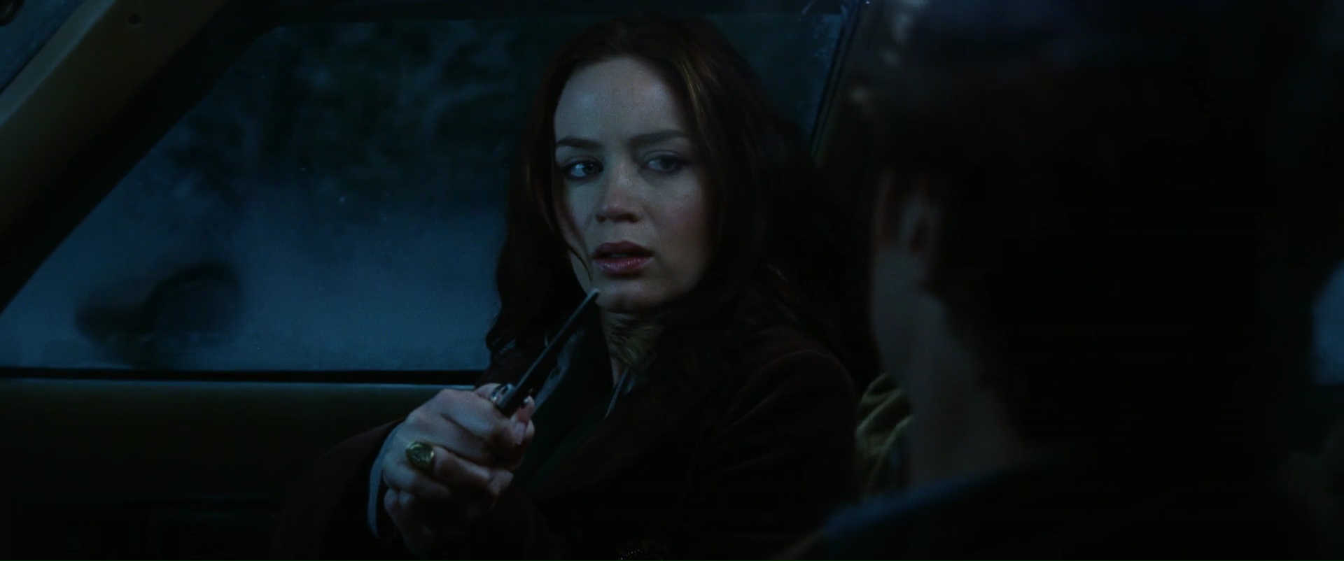 Wind Chill est un film qui divise. On adhère aux choix du film, ou pas du tout. Car j’aurais vu pas mal de monde se plaindre que le film ne raconte rien, que son scénario tient sur un post-it. Dois-je rappeler que dans le fond, Wind Chill est comme ces nombreux huis clos, il choisit un lieu pour son action, et s’y tient, jouant alors beaucoup plus sur l’ambiance que sur les rebondissements ou autres péripéties. Et puis moi, rien qu’un petit coup d’œil à l’équipe du film, et j’étais presque vendu. Emily Blunt (Edge of Tomorrow, La Fille du train) dans le rôle principal, Gregory Jacobs à la réalisation, lui qui est d’habitude producteur, en producteurs les gens qu’il produit habituellement (Steven Soderbergh et George Clooney), Clint Mansell à la musique. En gros, tout pour me fournir un film d’horreur différent. C’est un peu ça d’ailleurs, dans son ambiance, et sa mise en scène lente et fluide, j’ai plus eu l’impression de voir un film de genre comme si Soderbergh avait été à la barre. Et pour ceux qui l’ignorent encore, j’adore Soderbergh (sauf Full Frontal, comme j’aime le rappeler à chaque fois). Bref, Wind Chill, c’est l’histoire de deux étudiants, sans noms (donc, une fille et un homme, basta) qui se font un petit trajet de 6h en voiture pour rejoindre un autre coin de l’Amérique et leurs familles pour les fêtes de fin d’année. Eux au moins en Amérique ils ont de la chance, ils ont de la neige pour les fêtes, car en France ce n’est plus trop ça. Bref bref. Je ne vais pas mentir, Wind Chill ne commence pas forcément bien.