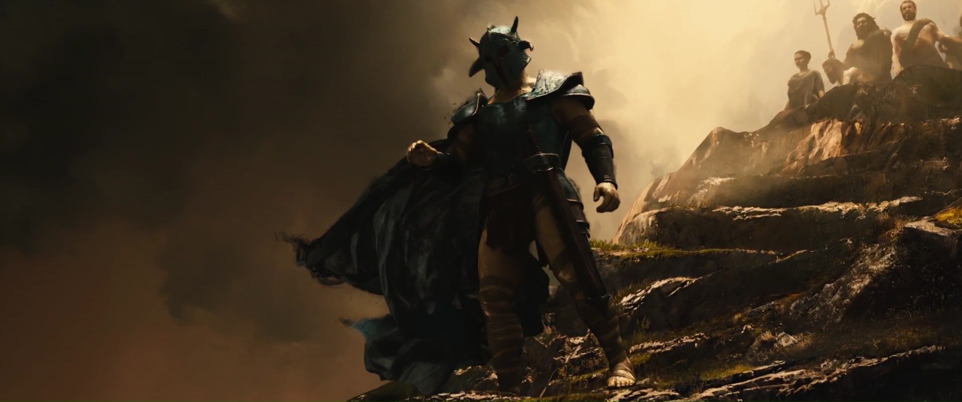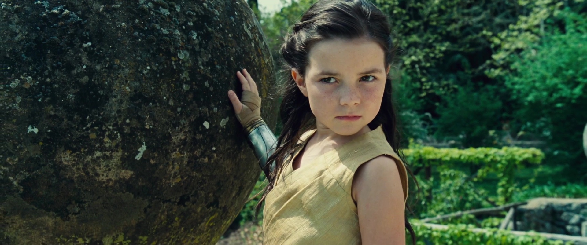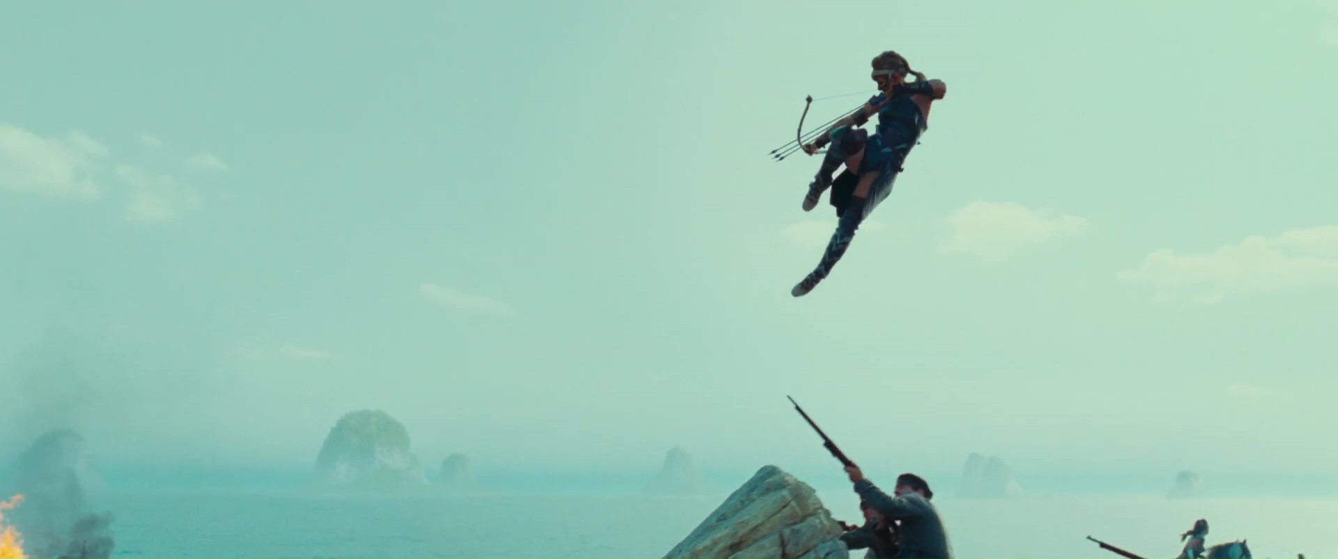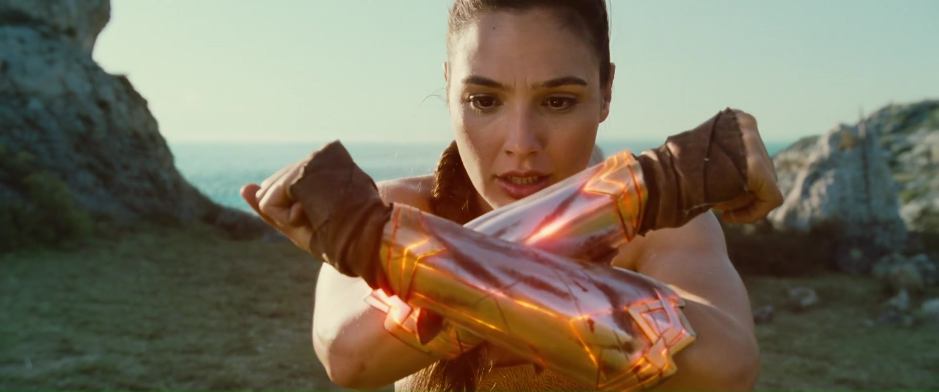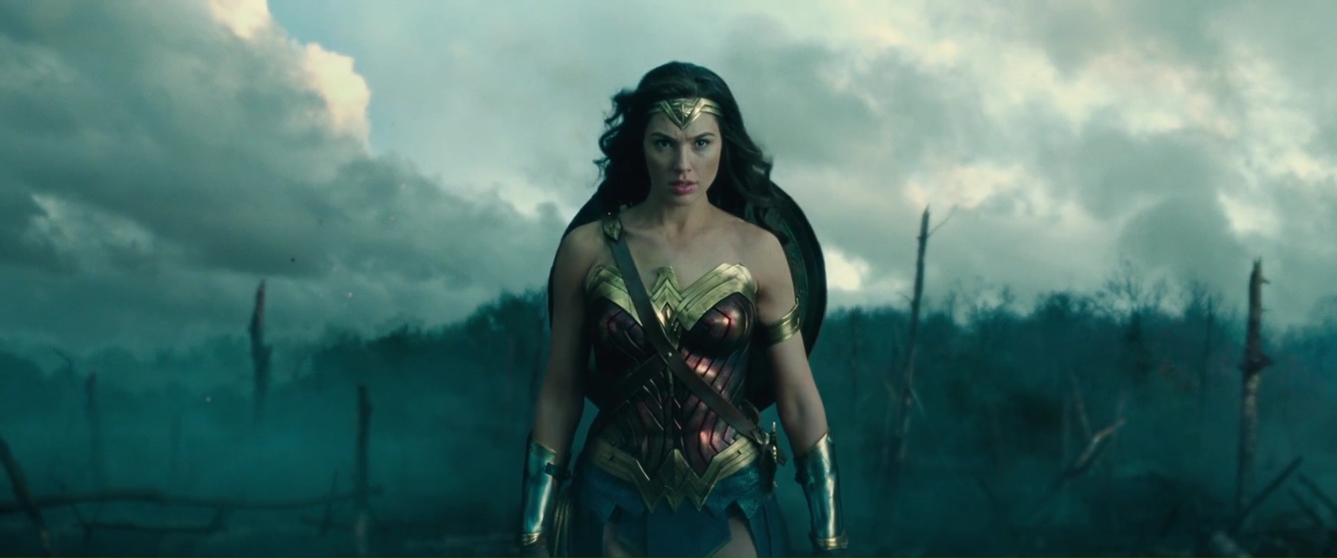 Après cette introduction inutile et surtout inutilement longue, passons donc au vif du sujet, Wonder Woman, le seul film de l’univers qui était susceptible de m’intéresser. Depuis combien de temps n’avons nous pas vu une héroïne au premier plan dans ce genre de films ? Je veux dire bien entendu au cinéma, dans le rôle principal, et en étant convaincante ! Non donc, rayez Catwoman avec Halle Berry ou Supergirl des années 80. Avoir enfin une super héroïne dans cet univers hyper macho, ça fait du bien. Wonder Woman commence même d’ailleurs plutôt bien, évitant de coller à l’univers des précédents films DC d’après ce que j’ai pu lire. Après tout, Bruce Wayne est un type devenu super héros par vengeance, tout ça tout ça. Wonder Woman elle, qui n’est d’ailleurs jamais appelée Wonder Woman de tout le film (et tant mieux), ne vit pas pour la vengeance, pour une raison égoïste, ne veut pas protéger son peuple contre l’envahisseur ou autre (sauf une scène certes), non, Wonder Woman fait ce qu’elle fait car c’est ce qu’elle veut faire, ce en quoi elle croit. Du coup, pas la peine de sortir les violons, les filtres gris, et commençons l’histoire sur une île paradisiaque pendant 30 minutes. 30 minutes ma foi plutôt bonnes, voir excellentes, avec des décors magnifiques, une photographie ensoleillée fort réussie, une Gal Gadot charismatique, des explications qui vont vite et ne sont jamais larmoyantes. Le film évite même certains pièges qu’il aurait été facile pourtant d’insérer dans le métrage et de foncer dedans à pieds joints. Oui c’est une île avec seulement des femmes, oui ce ne sont que des guerrières. Et ça passe bien, le film n’appuie pas son message, le film ne fait pas des femmes des personnages supérieurs et intouchables. Non, ce n’est pas le film féministe que j’ai pu entendre un peu partout.