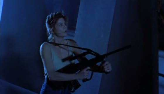 De la campagne anglaise, on passe à un laboratoire souterrain au Canada, d’acteurs inconnus et de Maryam d’Abo toute nue, on passe à Jan-Michael Vincent (Supercopter) et Tara Buckman (Douce Nuit Sanglante Nuit, Cannonball) et des militaires pas très doués. Le pitch ? Une équipe est envoyée dans un monde lointain via un passage (on dira que c’est du Stargate du pauvre avant l’heure), mais tout contact est rompu. Une des femmes envoyées refait surface, salement amochée, mais malheureusement, elle n’est pas revenue seule, et après une bien belle explosion d’estomac (fallait pas se gaver au macdo !), voilà qu’un super gros monstre est là ! Mais petit budget oblige, la base est évacuée, ne laissant que quelques scientifiques et militaires en proie au monstre. Et nous voilà devant un petit mix entre Alien 1 et Aliens le retour. Un gros monstre (tellement gros que ses déplacements sont lourds et peu effrayants), une base sombre qui déconne (les portes ne s’ouvrent pas, il faut passer par des conduits), des armes lourdes (dont une pompée sur Aliens), un méchant scientifique (comme dans les Aliens encore) et puis… ah non, c’est tout ! Oui, Xtro 2 est un film qui baigne constamment dans son manque d’originalité et d’ambition.