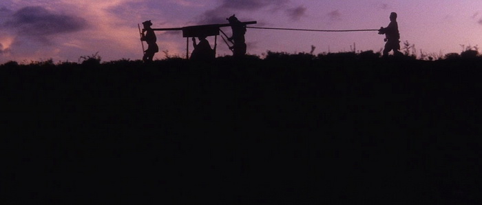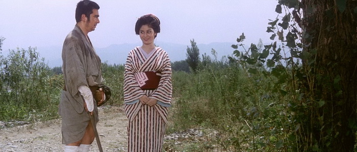 Dans la lignée de l’épisode précédent, ZATOICHI AND THE DOOMED MAN laisse moins de place à la comédie en dehors des scènes avec le « side-kick » crétin décidant d’usurper l’identité d’Ichi pour se remplir les poches. Un ton qui convient parfaitement à l’état d’esprit du masseur, de plus en plus las d’être sans cesse plongé dans la violence, la haine et la trahison. Un destin auquel il tentera bien d’échapper en refusant de se mêler des histoires du condamné à mort mais qui finit toujours par le rattraper, quelle que soit la route qu’il emprunte. Ichi attire les ennuis au point qu’il semble poursuivi d’une malédiction : il veut juste se restaurer et voilà qu’un gamin le mène vers un repaire de truands dépouillant les voyageurs, il s’amuse au tir à l’arc et voilà qu’un arnaqueur se met en tête de faire équipe avec lui et finit par usurper son identité, il évite de se rendre dans une ville où des dangers l’attendent et le voilà obligé d’y aller pour secourir un homme blessé rencontré en chemin. Aussi, si Ichi accepte de risquer à nouveau sa vie pour secourir les innocents, on ressent que le cœur n’y est plus vraiment, qu’il n’aspire désormais qu’à un peu de repos pourtant plus que mérité. Deux scènes reflètent particulièrement son aigreur et sa répulsion de plus en plus grande vis à vis de cette existence : celle où il marche volontairement sur le pied d’une femme qui s’est servie de lui pour échapper aux yakuzas, une attitude qui contraste avec sa réaction vis à vis de la pickpocket lui réclamant une tape sur la main dans l’opus 8, et surtout durant la bataille finale où il supplie ses agresseurs de cesser de l’attaquer afin de ne plus avoir à tuer.