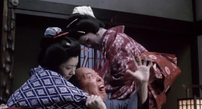 La galerie de personnages est une des premières réussites du titre. La sobriété de la mise en scène en est une autre. Le travail sur le son également. Entre les musiques de Suzuki Keiichi, le design sonore, lors des combats pour les coups de sabre, ou tout bêtement, pour les jeux de dés dans lesquels Zatoichi excelle grâce à son ouïe exceptionnelle, ou comme je le citais, l’alchimie entre les images et le son de manière générale, avec ses paysans en arrière plan qui travaillent dans les champs et le font en rythme, créant leur propre musique. Ce genre d’événement intervient d’ailleurs à plusieurs reprises dans le métrage, juste avant un final grandiose sous forme de spectacle musical, claquettes à l’appuie, et qui m’a donné envie à l’époque d’apprendre à faire des claquettes (véridique !). Mais voilà, Zatoichi, c’est un chanbara musical presque, où les sabres font eux aussi de la musique, de celle qui amène la mort et les gerbes de sang, en CGI pas très jolies, mais malgré tout là. Car Zatoichi alterne entre des moments légers (le voisin qui passe son temps à crier et courir autour de la maison, l’entraînement au combat avec des bouts de bois entre villageois), des moments plus durs (le background de certains personnages, à coup de trahisons, meurtres et j’en passe) et d’autres carrément brutaux lors d’affrontements, où les lames tranchent, transpercent, voir découpent les corps parfois, séparant les mains de leurs corps. Après, n’ayant pas vu l’intégralité de la saga Zatoichi, je ne pourrais confirmer ou démentir sur les éventuels ajouts clairs et nets que Kitano a pu ajouter, ou non, à l’univers, mais en l’état, il signe un film souvent enchanteur, malgré quelques faux pas évidents. Pas que le faux sang en CGI, mais avec forcément une multitude de personnages qui se croisent encore et toujours, certains sont moins bons que d’autres. Mais il soigne son métrage et le maitrise sur presque 2h sans temps morts.