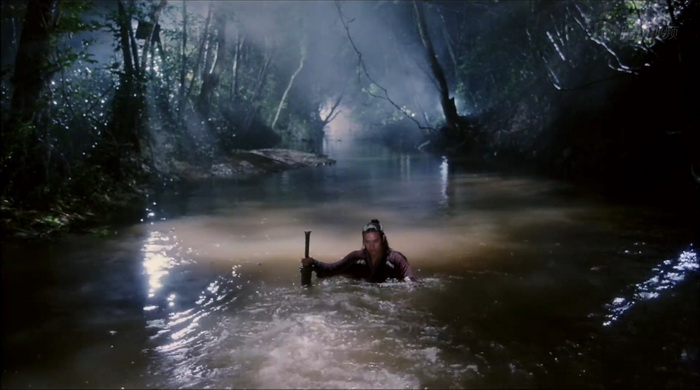 Nous sommes ici dans du pur wu xia pian fantastique, avec des personnages qui font des bonds hors normes, voire qui volent littéralement dans les airs, et un côté complètement frénétique des affrontements. Les combats sont très punchy et les chorégraphies de Phillip Kwok très réussies, le bougre arrivant même à rendre Waise Lee crédible dans les fights alors que ce dernier n’est pas du tout un artiste martial. Certains combats sont très inventifs à l’instar de celui où il se battent avec un arbre entier tout en étant très virevoltants, ou ce final complètement explosif et délirant avec membres coupés, magie et corps qui explose. Le wire-fu est assez impressionnant, imaginatif, et bien que certaines scènes pourraient paraitre kitch pour les non-initiés, comme ces moines aux techniques très tournoyantes, les amateurs apprécieront car Phillip Kwok fait clairement ici du bon boulot. Certaines scènes sont assez violentes, et même surprenantes comme cette petite fille coupée en deux qu’on ne voit pas venir. Visuellement, l’ensemble est assez travaillé. Entre les très beaux paysages, la photographie soignée pour les mettre en valeur, et le joli travail sur les éclairages, Zen of Sword a plutôt belle allure. Le réalisateur sait choisir ses cadres afin de régulièrement donner une ambiance mystérieuse, poétique pour d’autres, à ses scènes et certains plans sont tout simplement superbes. Même chose au niveau des costumes et il suffit de voir celui de Kara Hui, tout de plumes orné pour s’en convaincre. Pourtant, on sent bien que le budget ne devait pas être énorme et quasiment tout le film se passe dans cette forêt mystérieuse. Mais ce n’est à aucun moment gênant car le réalisateur utilise très bien cet espace.