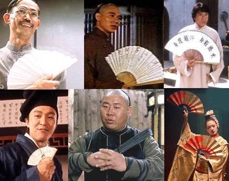 Parmi les apparitions non martiales de l’éventail dans le cinéma hongkongais, on peut aussi retenir l’éventail du général vietnamien machiavéliquement pittoresque joué par Yuen Wah dans Eastern Condors, et les éventails utilisés par Jackie Chan et Jet Li dans leurs films sur Wong Fei-hong : Drunken Master II et Once Upon A Time In China et sur lesquels ont été inscrits des messages patriotiques ou édifiants. Stephen Chow a utilisé à quelques reprises un éventail à des fins comiques dans ses comédies historiques (Justice My Fool, Flirting Scholar, King Of Beggars). Le second loubard à être bastonné par Zhang Ziyi dans la fameuse scène de l’auberge de Crouching Tiger, Hidden Dragon est armé d’un éventail fer mais n’a pas le temps de s’en servir, juste de faire une pose. Zhang Ziyi elle-même fait une danse de geisha avec éventails dans la production américaine Memoirs Of A Geisha.