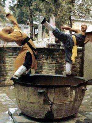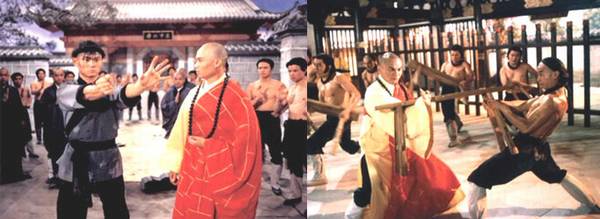 La première épreuve est d’ordre philosophique, historique et religieux. La seconde se composent de combats à mains nues et avec armes contre plusieurs adversaires. Voir la scène de L’irrésistible où Jackie Chan affronte ses frères armés de bâtons longs, avec de simples tonfas. La troisième et dernière épreuve est le passage dans la 36eme chambre qui est « gardée » par 108 mannequins de bois. Voir la trilogie de Liu Chia Liang et L’impitoyable de Chen Chi Hwa. Si le disciple réussit à passer, il doit encore déplacer à l’aide de ses avant-bras un chaudron de 250 kg, remplit de braises. Les bas reliefs du tigre et du dragon situés sur les flans du chaudron laisseront des marques indélébiles sur le plan physique mais aussi « psycholoqique ». L’élève est ainsi marqué par l’esprit de Shaolin. Cette fameuse 36ème chambre semble appartenir plus au folklore qu’à la réalité historique.
