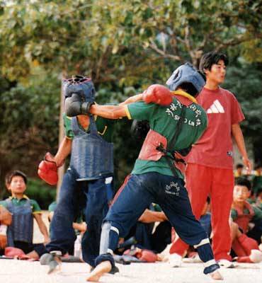 Le Sanda (« frappes aléatoires ») est également appelé Sanshou (« mains aléatoires »). C’est une forme de combat libre ; on peut aussi le qualifier de Kung-fu sportif ou de sport de combat ; par opposition au kung-fu traditionnel qui est un art martial. Le Sanda se caractérise par l’utilisation des poings, de jambes et des projections. Dans les années 70, le gouvernement chinois commence à promouvoir le Sanda pour mettre fin aux combats sans catégorie de poids et autorisant presque tous les coups, qui sont organisés dans les villes et les villages. Ces combats se gagnaient par K.O. ou par abandon. Les premiers tournois prennent leur essor dans les années 80. On peut même espérer voir un jour le Sanda comme discipline olympique. Un combat se compose de deux ou trois rounds de deux minutes chacun avec un arbitre central et quatre arbitres de coins comptabilisant les points. La tenue du combattant se compose d’un casque, d’un plastron, d’une paire de gants, d’une paire de protège tibia, d’une coquille et d’un protège dents.