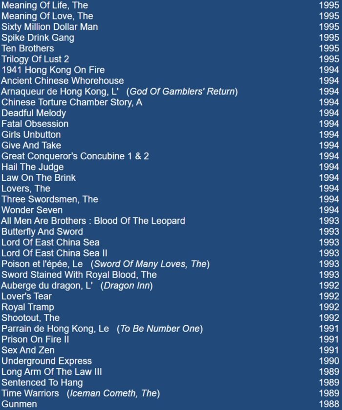 Tous ces films, il ne les renie pas, pourtant son souhait le plus fort serait de travailler avec des metteurs en scène comme Lawrence Ah Mon ou Ann Hui… lui le pape de la Catégorie 3 de l’horreur et du Soft Porn réunis !!!