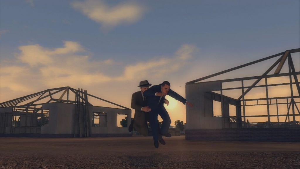 Si conduire dans le Los Angeles des années 40 est appréciable surtout que les nombreux véhicules sont très maniables, on pourra reprocher à ces entre deux de nous assister souvent. Poursuivre un véhicule suspect ne se fera que de deux façons différentes, et ce sera ultra scripté. Une filature se fera le plus simplement du monde si l’on a aucun accident et que l’on ne s’approche pas trop, tandis que les courses poursuites se déroulent toujours de la même manière, puisqu’elles sont scriptées. Dommage. Il en sera de même pour les fusillades, souvent assez répétitives, et avec une visée assistée qui pointera vers l’ennemi le plus proche de là où vous visez, retirant une partie de la difficulté. Quelques fusillades sortiront du lot en proposant un cadre ou une mise en scène plus intéressante, comme celle dans la salle de cinéma ou dans le décor de cinéma. Il faut croire que les développeurs ne voulaient pas franchement croire en ces parties tant le gameplay est simplifié. Pire, si l’on échoue trois fois à l’une de ses phases, une option nous permet de les passer tout simplement… Mais peu de chance pour que l’on échoue aussi souvent, entre les scripts et l’assistance à la visée. On notera également de temps en temps des phases de plate forme, simplifiée également, puisque notre personnage, le détective Cole Phelps, sautera tout seul si l’on est dans la bonne direction, grimpera tout seul les échelles et les gouttières d’une simple pression du joystick dans leur direction.