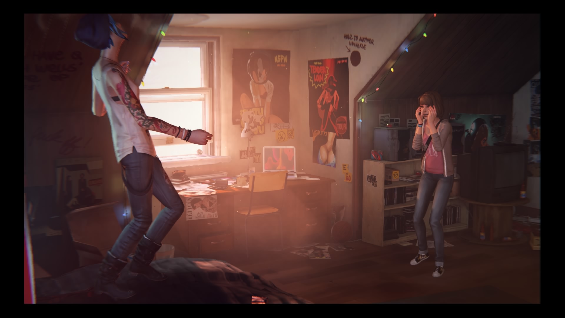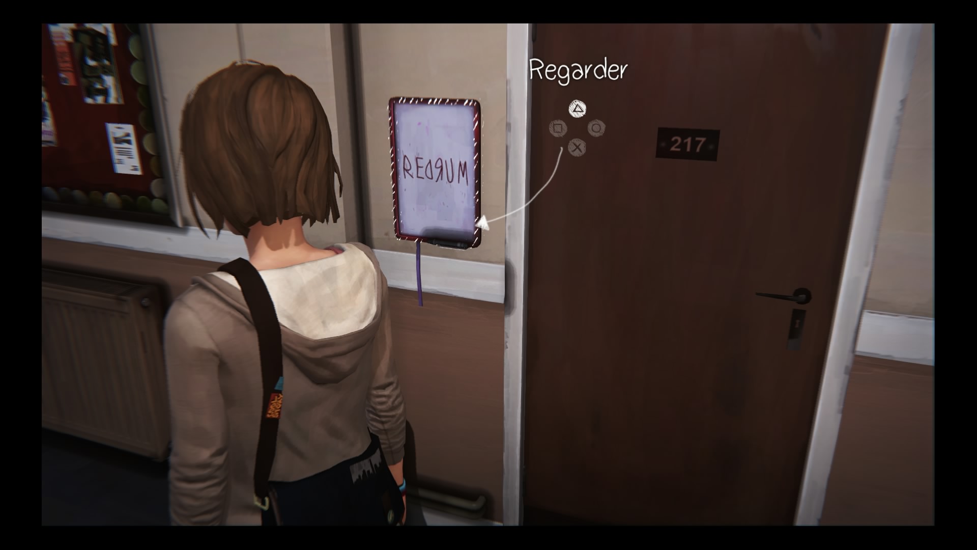 Premier point en commençant l’aventure, Life is Strange ne se fait pas extrêmement beau, loin de là. Si les décors sont soignés et que le sens du détail est bien présent, en soit, ce n’est pas top, les personnages et leur visage manquant de finesse, les lèvres manquent de mouvements lors des dialogues (ce qui apporte un effet étrange si on y prête trop attention). Mais DontNod se focalise bien plus sur le sens du détail et l’ambiance qu’ils veulent créer, et de ce côté, c’est une réussite. Ce premier épisode nous montre surtout l’école, le dortoir, puis la maison de notre meilleure amie, et l’ensemble regorge de petits détails pour donner vie à tout ça. L’ambiance quand à elle nous rappelle des petits films indé comme par exemple Brick pour le côté lycée qui a ses secrets et l’enquête et Donnie Darko pour l’asepct retour dans le temps. On notera par ailleurs de nombreux hommages à des films de genre, entre notre meilleur ami qui nous demande de regarder des films comme Cannibal Holocaust ou Nekromantic (oui oui) ou encore en voyant le mot Redrum écrit à côté de la chambre 217 du dortoir !