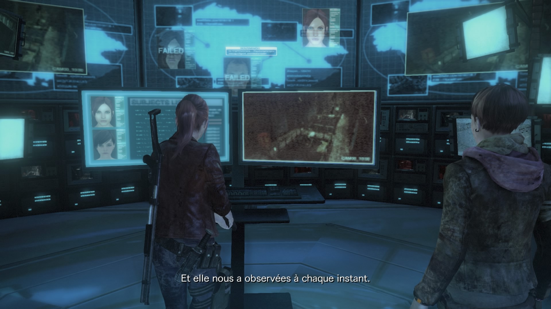 Il faut véritablement attendre l’épisode 2 pour que Revelations 2 décolle et nous offre de bons moments, et que l’on retrouve un minimum l’ambiance des vrais Resident Evil, malgré les clins d’oeil un peu trop appuyés. Ne cherchez donc pas trop d’innovation dans les lieux, puisqu’on aura une prison, un petit village de pêcheurs (Resident Evil 4), des égouts (Resident Evil 2, 6 et d’autres). Pourtant, à quelques moments, Revelations 2 parvient à se trouver une vraie ambiance prenante, ce qui est assez surprenant vu les énormes défauts du jeu, et son lot de bugs (collisions et autres). L’épisode 2 regorgera de bonnes idées, que ce soit avec Claire et Moira ou Barry et Natalia. Et comme le jeu est découpé en épisodes eux-mêmes découpés en chapitres, Capcom se fait plaisir au niveau des rebondissements de fin. Si certains fonctionnent, d’autres peuvent carrément plomber un retournement de situation, comme celui de fin d’épisode 2, nous faisant penser que Capcom n’a vraiment plus d’idées (oui, ça y parle encore de Wesker bordel !). D’autres heureusement fonctionneront parfaitement, comme celui de fin d’épisode 3, qui annonçait vraiment de belles choses pour la suite de l’aventure.
