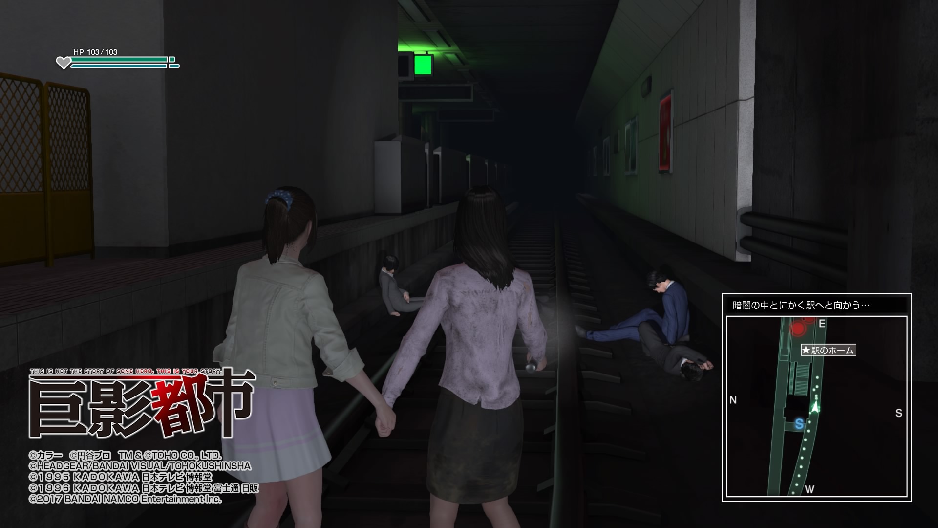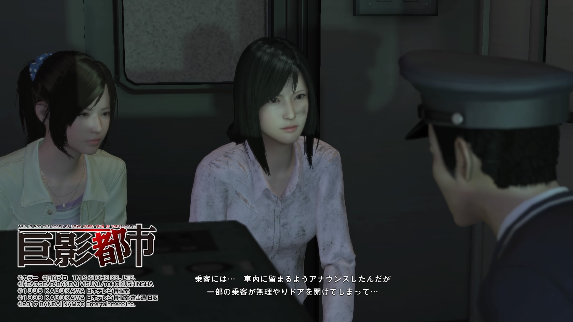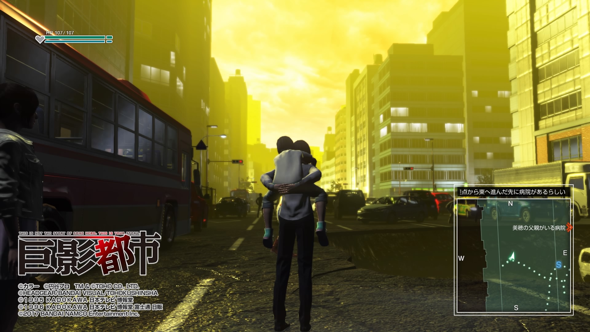 Alors dans les faits, au cours d’une dizaine de chapitres, le jeu va nous proposer de survivre. Oui, City Shrouded in Shadow n’est pas un jeu d’action, nous ne pouvons combattre les monstres, et il faudra fuir. Donc, en gros, courir très souvent en trouvant son chemin, et éviter quelques attaques ou débris avec la touche carré. En soit le jeu est plutôt simple. Plusieurs raisons à cela, plus ou moins habiles, plus ou moins glorieuses. Le chemin à suivre est souvent assez linéaire, sauf si vous voulez débloquer les petits secrets et aider la majorité des survivants sur votre route, ce qui est possible. Mais oui, le chemin est tout tracé, on ne dévie que rarement, et les checkpoints sont relativement nombreux, ce qui permet de ne jamais reprendre trop loin en arrière en cas d’échec. L’autre élément rendant le jeu simple, c’est malheureusement le côté assez simpliste de son gameplay. Le chemin est tout tracé, et si des débris, attaques, ou même des yakuza qui sont à nos trousses sont des éléments à prendre en compte, le jeu ne nous propose qu’une touche pour esquiver. Oui, la fameuse touche Carré, la touche à tout faire. Un morceau de plafond qui nous tombe dessus, la queue de Godzilla ou de King Ghidraoh qui va s’abattre au sol, le sol qui s’effondre, un coup de pied retourné de la part de Kiryu…euh je veux dire d’un Yakuza, et la touche magique s’affiche à l’écran. Cela donne finalement un petit côté vieillot au gameplay du jeu, et c’est dommage. Très dommage, car si le jeu a quelques autres défauts, il n’en demeure pas moins sympathique.