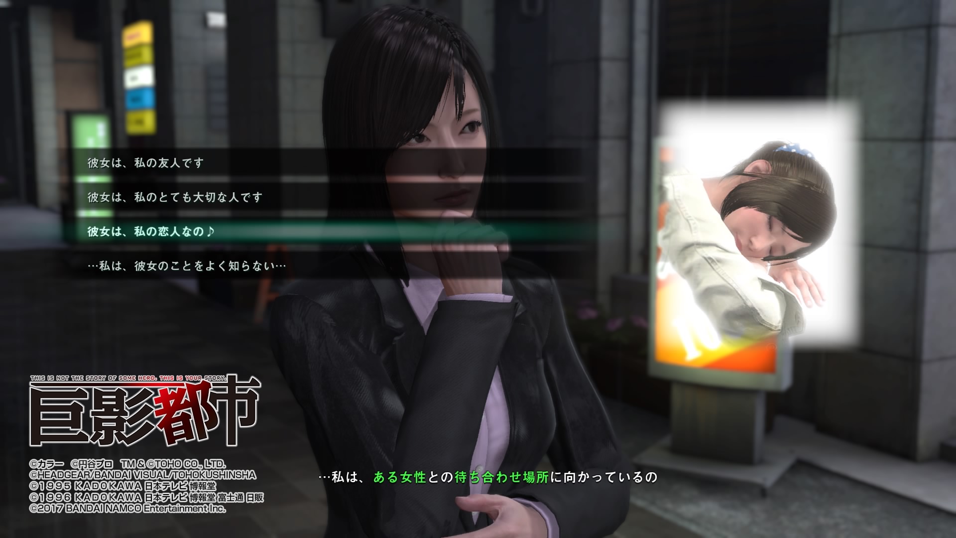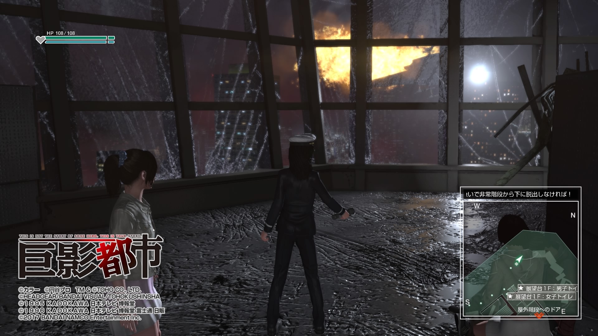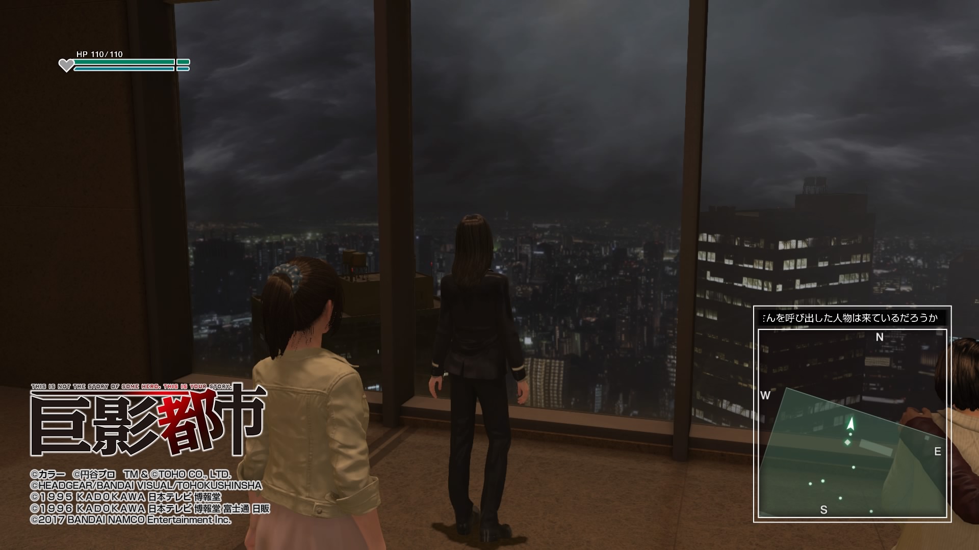 Alors dans les faits, au cours d’une dizaine de chapitres, le jeu va nous proposer de survivre. Oui, City Shrouded in Shadow n’est pas un jeu d’action, nous ne pouvons combattre les monstres, et il faudra fuir. Donc, en gros, courir très souvent en trouvant son chemin, et éviter quelques attaques ou débris avec la touche carré. En soit le jeu est plutôt simple. Plusieurs raisons à cela, plus ou moins habiles, plus ou moins glorieuses. Le chemin à suivre est souvent assez linéaire, sauf si vous voulez débloquer les petits secrets et aider la majorité des survivants sur votre route, ce qui est possible. Mais oui, le chemin est tout tracé, on ne dévie que rarement, et les checkpoints sont relativement nombreux, ce qui permet de ne jamais reprendre trop loin en arrière en cas d’échec. L’autre élément rendant le jeu simple, c’est malheureusement le côté assez simpliste de son gameplay. Le chemin est tout tracé, et si des débris, attaques, ou même des yakuza qui sont à nos trousses sont des éléments à prendre en compte, le jeu ne nous propose qu’une touche pour esquiver. Oui, la fameuse touche Carré, la touche à tout faire. Un morceau de plafond qui nous tombe dessus, la queue de Godzilla ou de King Ghidraoh qui va s’abattre au sol, le sol qui s’effondre, un coup de pied retourné de la part de Kiryu…euh je veux dire d’un Yakuza, et la touche magique s’affiche à l’écran. Cela donne finalement un petit côté vieillot au gameplay du jeu, et c’est dommage. Très dommage, car si le jeu a quelques autres défauts, il n’en demeure pas moins sympathique.