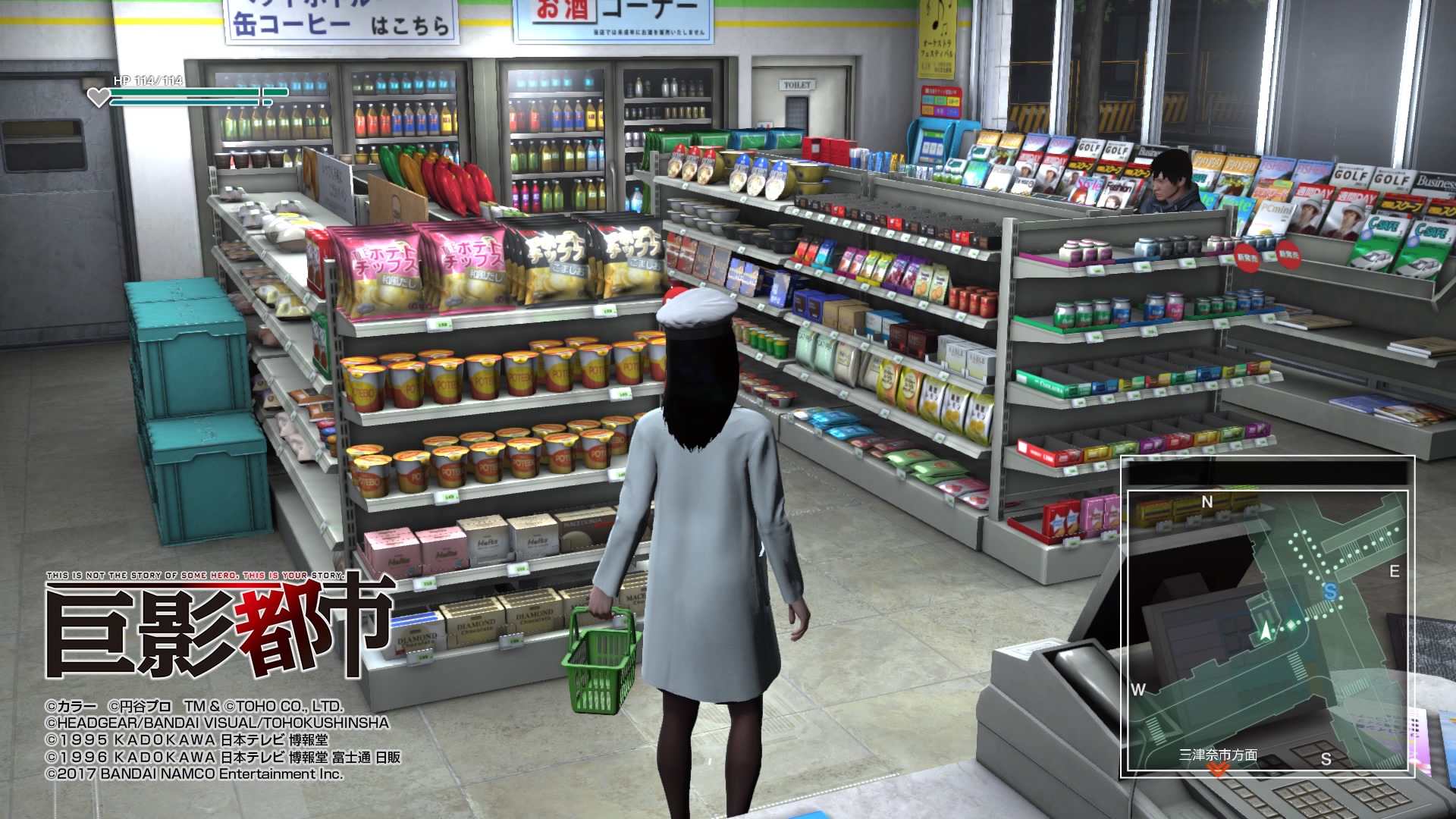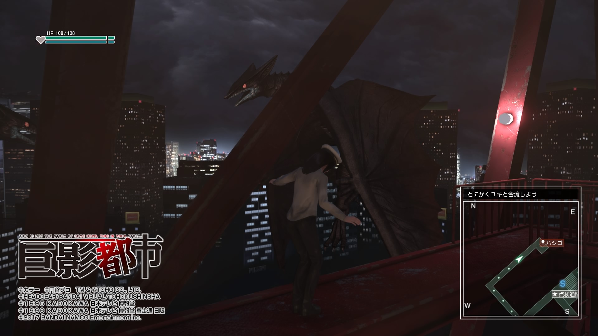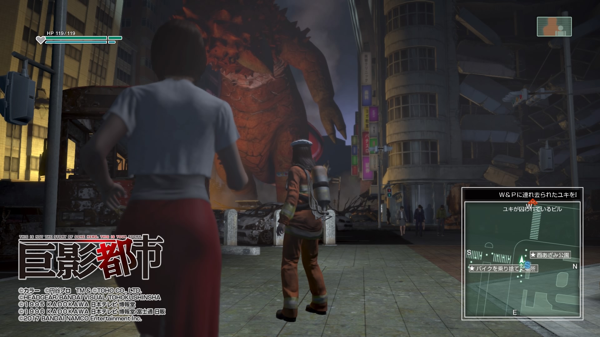 Imaginez un peu le concept de Disaster Report, mais avec dans le jeu Ultraman, Godzilla, Mothra, Gamera, un mecha Evangelion, Patlabor et j’en passe. Ça ne vous vend pas du rêve ? Moi si ! Et dès les premiers instants, on retrouve un peu la magie de ces anciens titres de la Playstation 2. Avec les défauts qui vont avec. Au lancement, nous voilà directement dans la ville, de nuit, et nous faisons quelques choix pour mieux « créer » notre personnage. Des choix simples, comme le fait d’être un homme ou une femme, lui donner un nom, une raison d’être là (rentrer du travail, d’un entretien) et la nature de la jolie demoiselle que l’on va rencontrer (amie, petite amie, connaissance). Quelques pas dans la rue et on se rend compte que le jeu fonctionne comme un Disaster Report. On peut courir (mais attention à la barre de stamina), s’accroupir, ramper, ramasser des objets, sauvegarder à des points fixes comme à la bonne époque, faire des achats dans quelques supermarchés. Puis après à peine quelques pas au bout de la rue, le désastre, une explosion, la panique, les PNJ qui courent dans tous les sens, les flics qui sont débordés, et notre première menace qui arrive juste devant nous. Ah ça, le jeu ne perd pas une seconde pour nous mettre dans le bain, contrairement à Raw Danger et son long prologue (que j’adore hein, me prendre pour un serveur dans une grande réception, c’était fun). Là, Ultraman est devant nous, se fight direct. Et pour ceux qui pensent qu’ils ne font que de la figuration en arrière plan, oh détrompez vous, j’aurais testé, en m’approchant… et aurait eu en quelques secondes un beau game over. Oui, se faire écraser par Ultraman, ça fait mal.