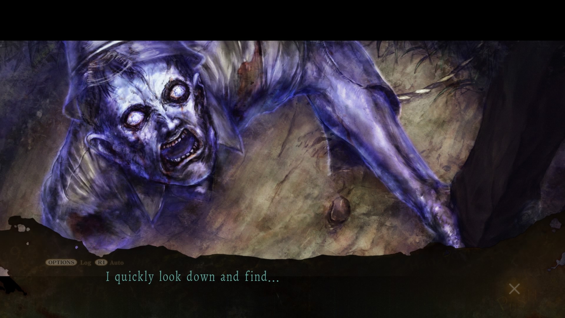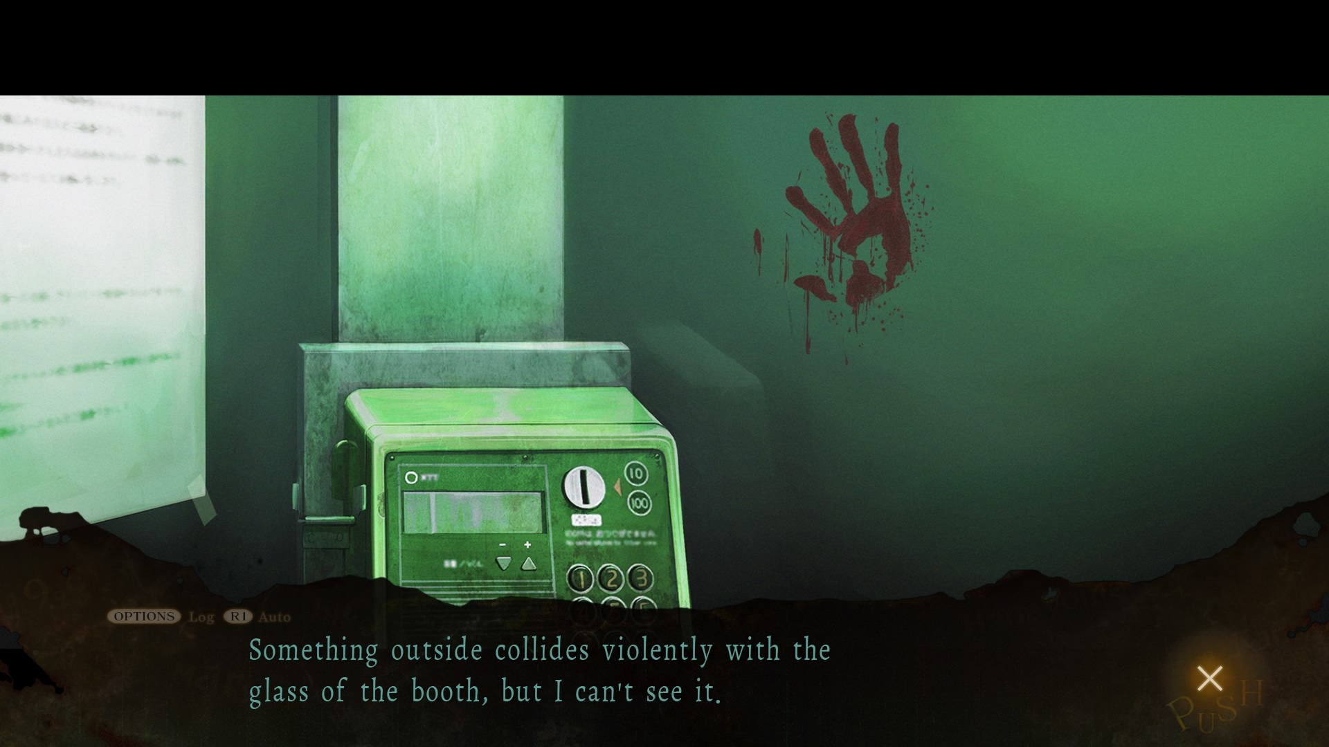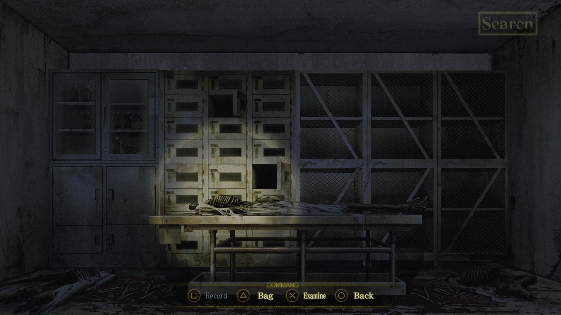 Si au final, cela ne reste que des choix à faire en fonction de la logique ou des notes lues auparavant, l’effort est louable. Surtout que certains éléments vont en effet faire dévier le jeu. Il est possible de sauver tous les personnages dans l’aventure… mais également de perdre quasiment tout le monde. Au delà de ça, Death Mark ressemble bel et bien à un Visual Novel, avec les personnages qui parlent qui s’affichent à l’écran, sur un fond souvent unique par lieu. Notons d’ailleurs malheureusement que si le jeu a été traduit en Anglais pour les sous titres (pas de Français, comme toujours), les dialogues sont pour la plupart uniquement écrits, et non parlés. Petite déception à ce niveau. Niveau sonore, ça se limitera souvent à quelques cris, ou quelques phrases types comme un « Konnichiwa » en début de journée. Beaucoup de texte, des choix, et aussi de l’exploration donc. Le joueur va devoir explorer à chaque chapitre un nouveau lieu (une école, une forêt, un bunker abandonné, un hôtel) pour trouver des indices. Cette partie reste en soit très limitée mais plutôt prenante. À savoir que l’on se servira de la croix directionnelle pour choisir là où l’on ira sur la carte (salle de gauche, de droite, ou tout droit), et que l’on se sert du stick analogique pour déplacer le viseur à l’écran et inspecter ce qui se trouve dans la pièce actuelle. Rien de bien compliqué. De l’inspection, des dialogues, quelques énigmes et des objets à utiliser, rien qui ne va, en soit, marquer le joueur. Sauf que Death Mark a une ambiance assez pesante qui fonctionne très bien.