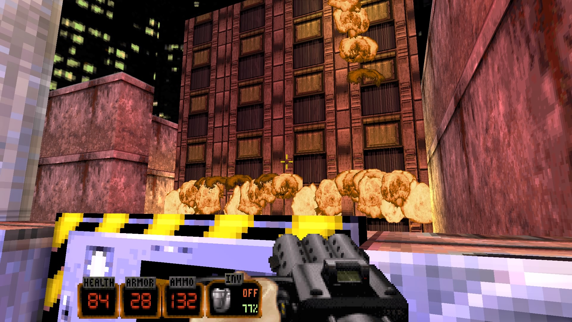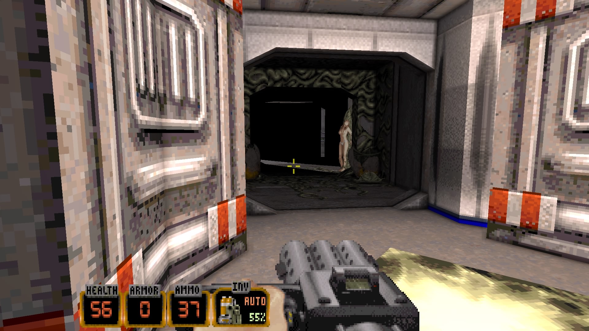 À l’image de Doom, Duke Nukem 3D aura changé la face des FPS et des jeux vidéo en général. Enfin, FPS… à l’époque, cela était toujours du Doom-Like. Un tel phénomène qu’encore aujourd’hui, le jeu bénéficie encore de sorties sur de nouvelles consoles, avec du contenu additionnel, nouveaux niveaux, nouvelles musiques, liftage HD. Oui, un phénomène encore actuel, ce qui étonne d’ailleurs, à l’heure où Doom, ayant le même statut de jeu culte, n’aura pas eu autant de ressortie, mais aura tout simplement à la place eu un reboot (et bientôt une suite). Duke Nukem 3D est indémodable, mais accessoirement, ne semble pas vouloir vraiment se refaire une vraie santé. Il faut dire que comparé à Doom, les suites de ce Duke Nukem 3D ne furent pas glorieuses, et ce jusqu’au récent Duke Nukem Forever avec ses quelques 12 années de production, sans doute la pire arlésienne du monde du jeu vidéo. Mais revenons en à Duke Nukem 3D donc, un jeu multi support, même à l’époque, sortant sur tous les supports informatiques possibles et imaginables, sur Saturn, Mega Drive, puis la première Playstation, avant même de débarquer dans une version légèrement différente sur Nintendo 64. Oui, la console de Nintendo, qui une fois de temps en temps, voulait attirer un nouveau public, un public plus mature, avec du Duke, mais également Resident Evil 2 ou Turok (Nintendo refera le même coup sur la Game Cube avec Resident Evil 0 et Rebirth, puis sur Wii avec Silent Hill Shattered Memories, puis finalement sur Wii-U et la Switch avec les jeux Project Zero). Une version d’ailleurs plutôt sympathique, car si quelques changements peuvent faire grincer des dents, de manière plus globale, il s’agît là d’un excellent portage, avec quelques ajouts, de nouvelles armes, et un mode multi-joueurs plutôt fun en local, comme tous les jeux de l’époque.