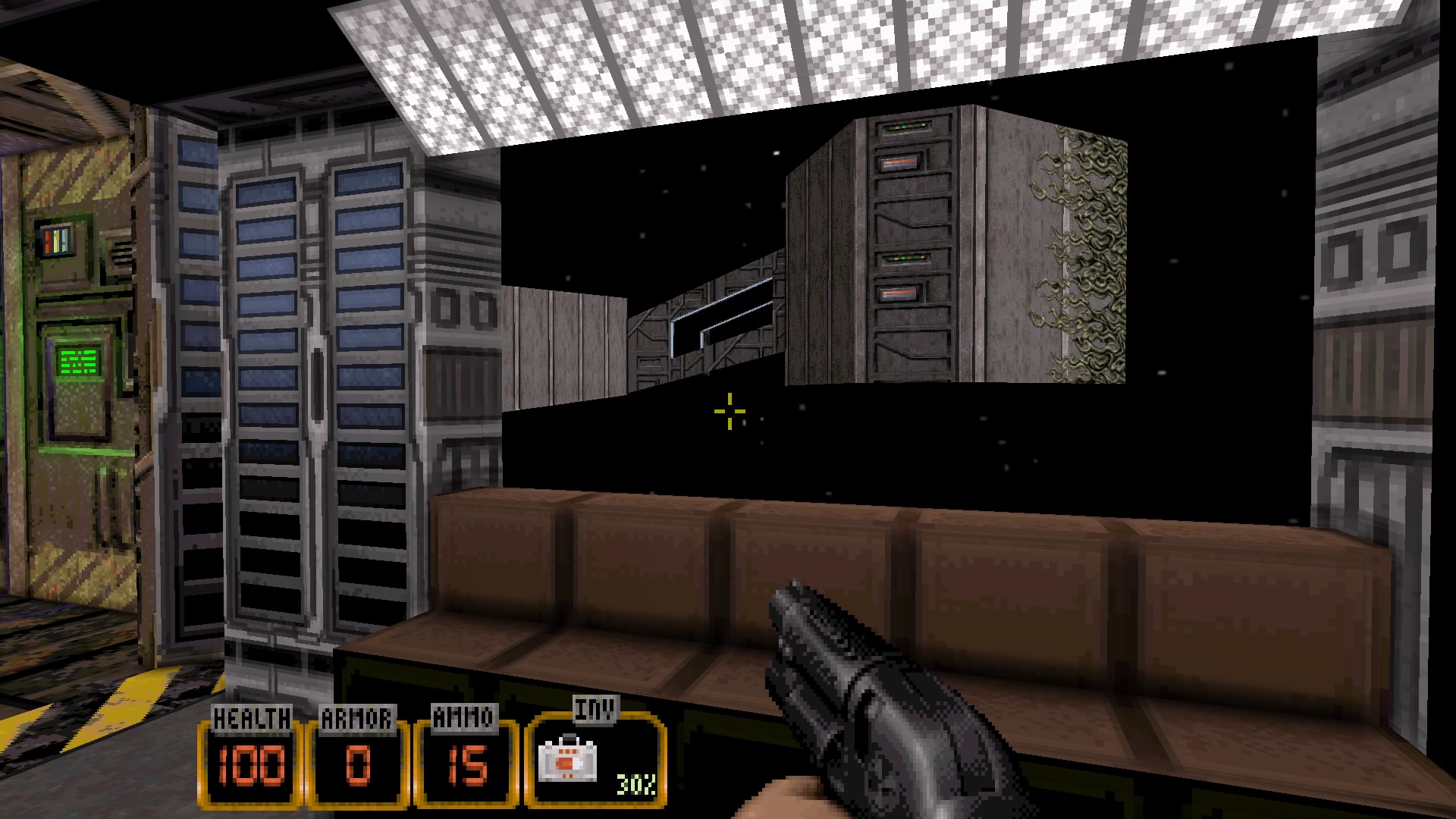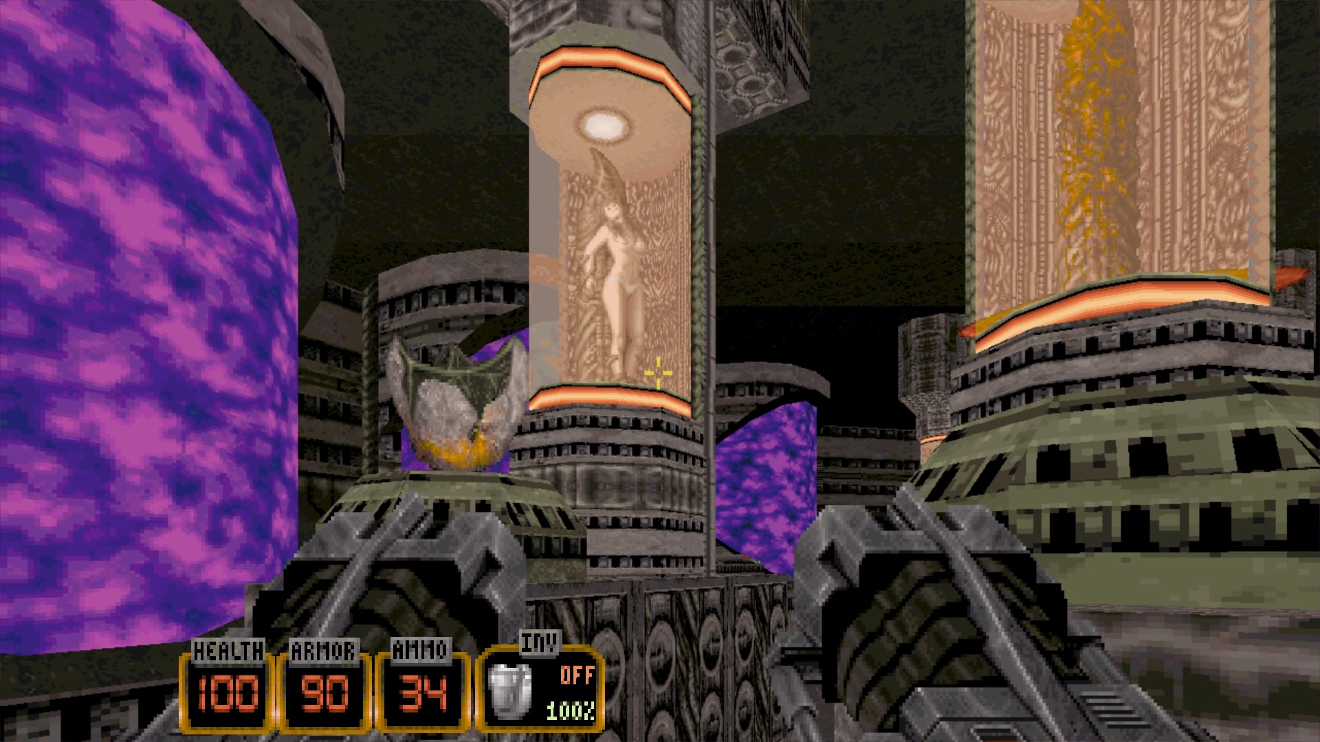 Les développeurs de chez 3D Realms ont en effet tout fait pour que l’expérience soit plaisante et surtout inoubliable. Entre divers niveaux variés et pas forcément reliés entre eux (d’où le bouton d’autodestruction à la fin des niveaux, amenant l’écran des scores), des graphismes sublimes pour l’époque, l’équipe fait fort a bien d’autres niveaux. Notamment en terme de level design. Si jusque là, les Doom-Like ne nous faisant qu’avancer dans des niveaux de gauche à droite, ou vers l’avant, voir retourner parfois en arrière, Duke Nukem 3D s’affranchit de tout ça grâce à deux ajouts de gameplay, deux ajouts qui paraissent simples sur le papier, mais qui changent totalement la conception même des niveaux. Ces deux ajouts, ce seront le jet pack, permettant à Duke de s’envoler, et donc d’atteindre des bâtiments cachés, des passerelles, voir des lieux auquel il doit absolument aller pour compléter le niveau, et de l’autre côté le tuba, permettant à Duke de respirer sous l’eau et donc de se taper quelques phases sous marines étonnement maniables (la 3D et le gameplay marin, c’est rarement ça), pour trouver de nouveaux chemins, de nouveaux bonus. Avec ces ajouts, le joueur ne fait pas qu’aller de l’avant, il doit aussi prendre des hauteurs, ou inversement, descendre. Une verticalité plaisante.