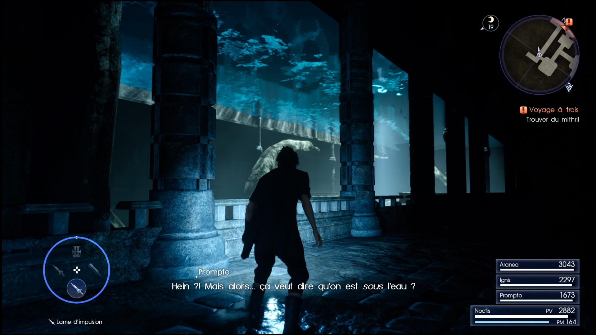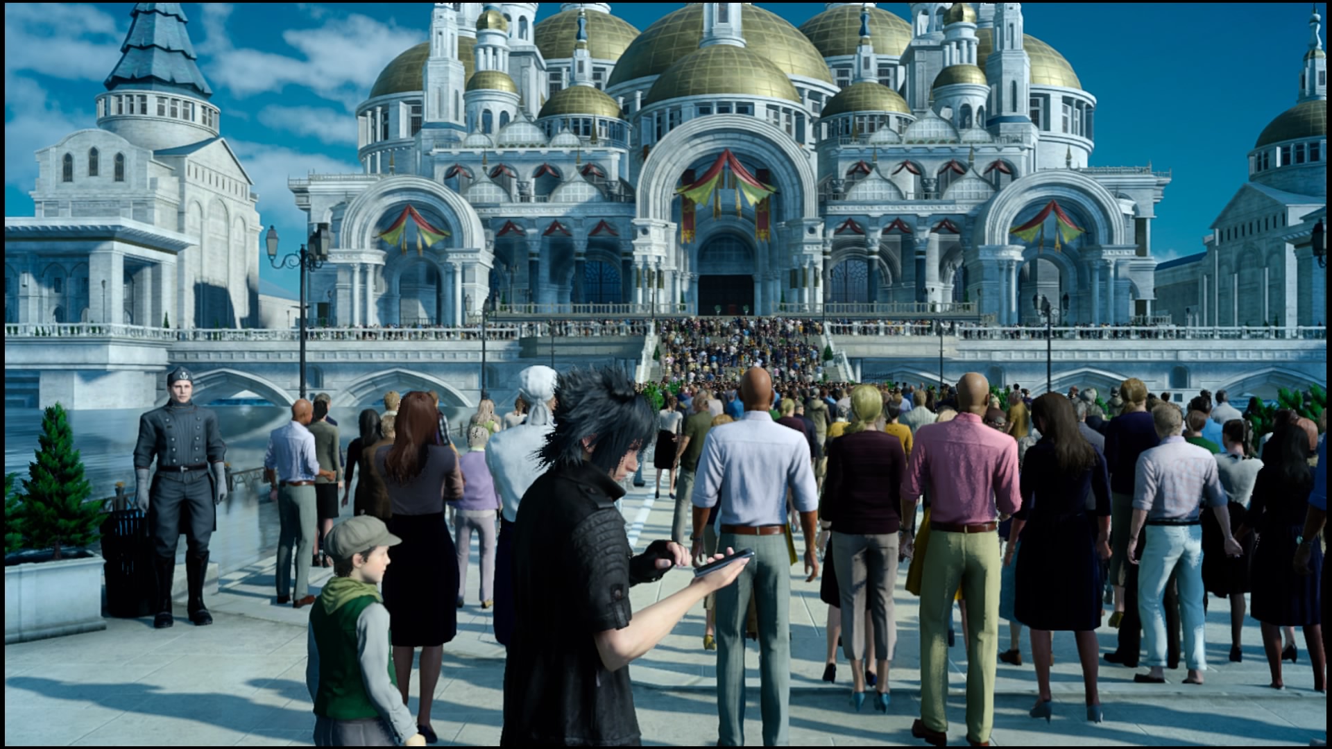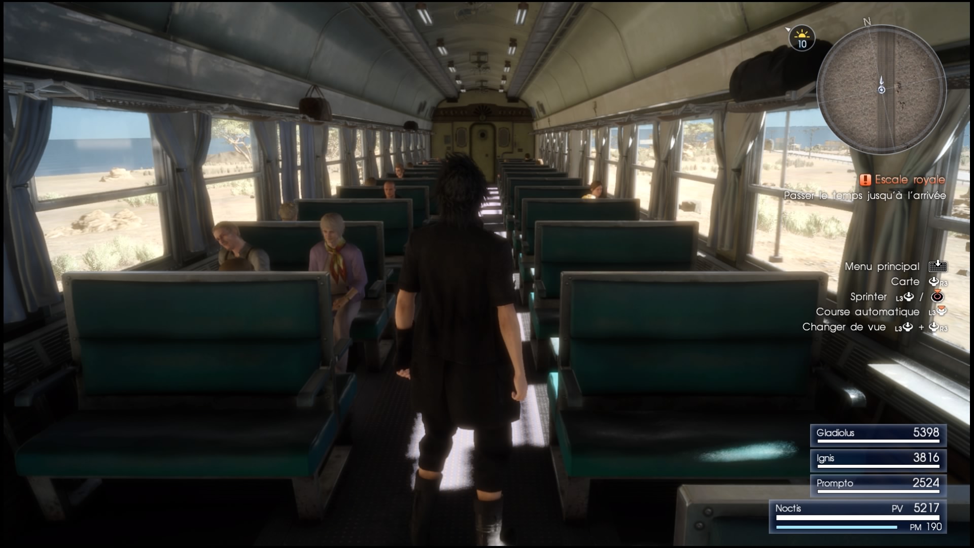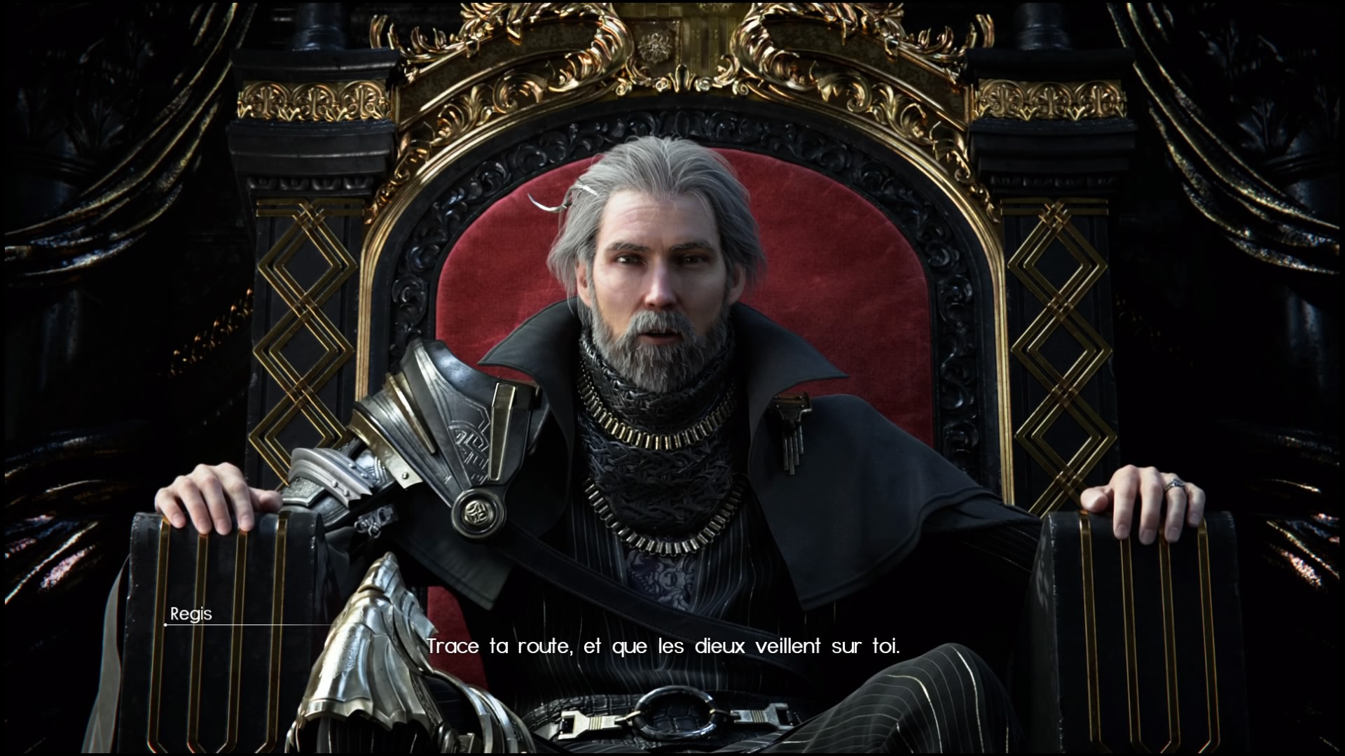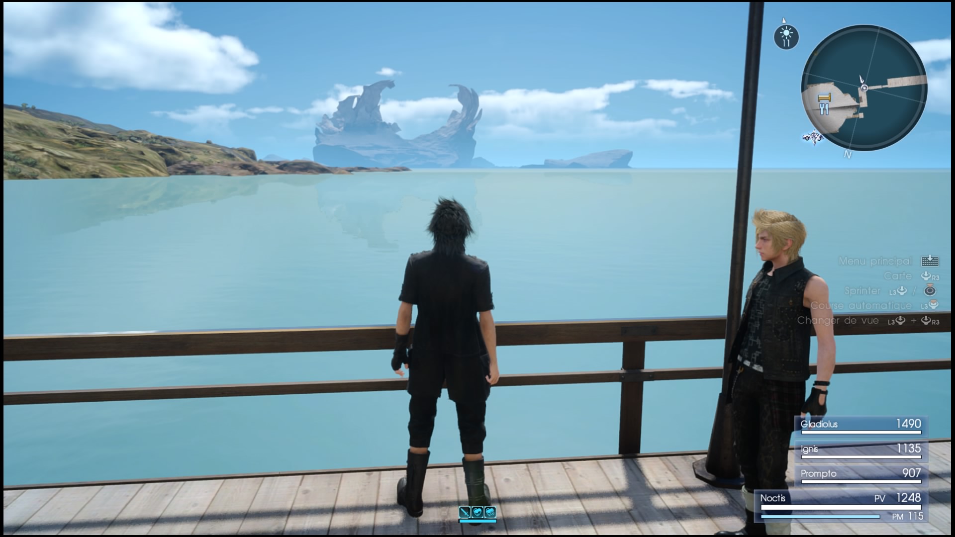 Et avant toute chose, parlons peu mais parlons bien. 10 ans de développement ? De quoi donc concurrencer Duke Nukem Forever et Aliens Colonial Marines. Sauf que, qualité mise à part, comme ces derniers jeux, il faut savoir se modérer puisque en 10 ans, on change forcément de génération de console, de matériel, de moteur graphique, et donc dans le fond, on repart quasiment de zéro passé un stade (et donc, on perd beaucoup d’argent, aussi). Du coup, Final Fantasy XV comme on le connaît aujourd’hui, on peut plutôt dire que ça a commencé en 2013, pour une sortie en 2016. Bref, du détail du détail. Mais du gros détail, car entre son annonce en 2006 et sa sortie en 2016, outre un changement graphique, un changement de génération de consoles, on notera de gros changements dans l’histoire, et de gros changements ailleurs, jusqu’à un changement de réalisateur, ce qui n’est pas rien. Final Fantasy XV nous met donc ce coup-ci dans la peau du prince Noctis. Premier constat, oui, tous les personnages semblent être des jeunes émos accros au gel dans les cheveux. Oui, c’était inutile de le dire, mais il faut bien préciser que l’idée que Square (et le Japon) se fait du cool à l’occidental est légèrement étrange (rappelez vous dans le même ordre d’idée le jeune emo dans le remake de DMC). Et si pour certains personnages, ça passe, il y en a un chez qui je bloque : Prompto ! Alors en terme d’histoire, FF XV se découpe en 15 chapitres, la moitié (le début du jeu, les huit premiers) en monde ouvert, la suite en jeu couloirs forcément beaucoup plus rythmé, donnant une aventure plus courte que d’habitude dans les faits, en ce qui concerne la trame principale. L’histoire a au départ quelques atouts pour apporter un peu de neuf dans la franchise. On joue en effet un prince et très rapidement dans le jeu, notre père, le roi, meurt suite à un assaut de l’empire (sans Darth Vader), point scénaristique sur lequel le jeu était vendu, et donc connu de tous. À partir de là, notre héros part en quête pour récupérer des armes fantômes et obtenir l’approbation des dieux, récupérer le trône qui nous revient de droit, et foutre une bonne raclée à l’empire.