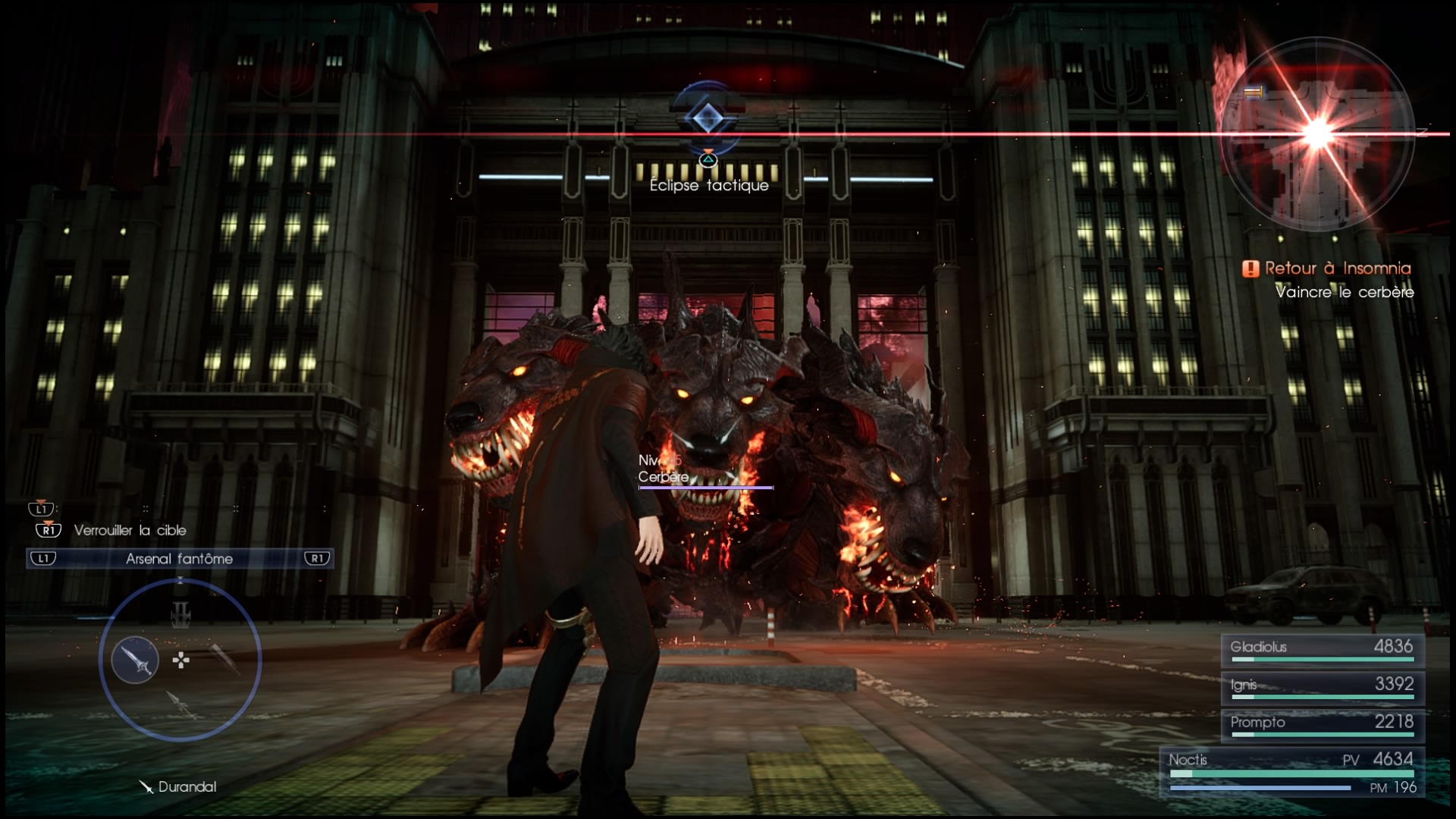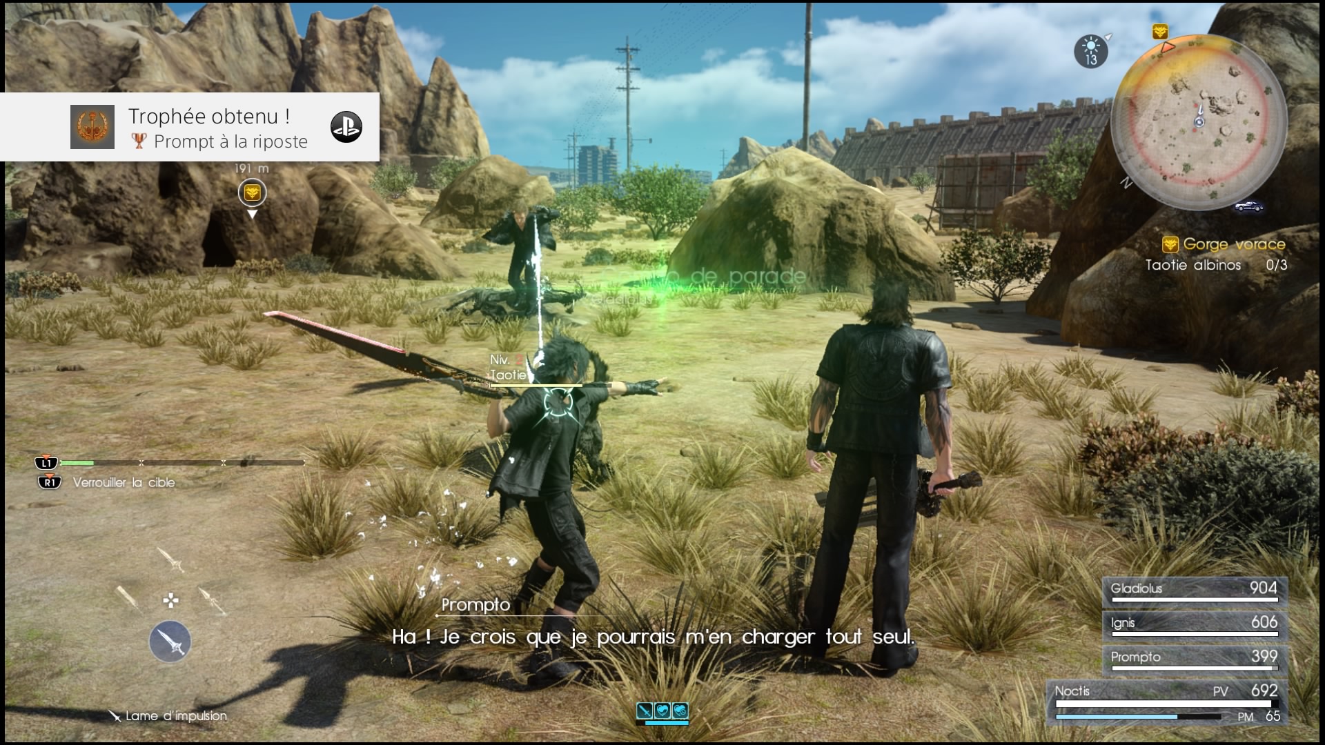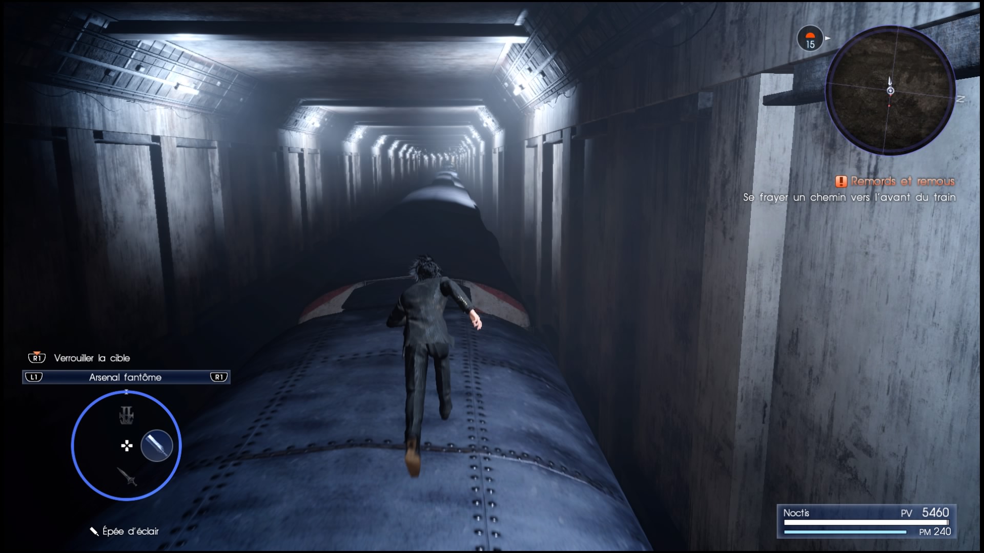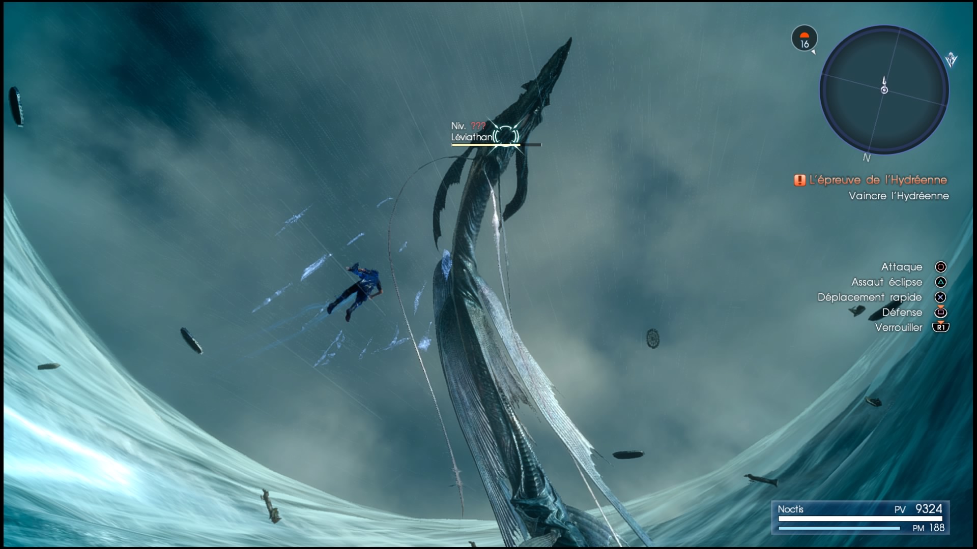 Et à côté, il y a les autres quêtes, à savoir les quêtes de chasse. Bon ok, et la pèche, mais on s’en fou. Là, simple, il faudra aller à tel endroit, éliminer tant d’ennemis, et revenir au restaurant de la quête pour obtenir de précieux gils. Car oui, les gils, il en faut, pour rouler car notre voiture fonctionner à l’essence, pour dormir car l’hôtel, c’est pas gratuit, et pour acheter armes et soins, forcément. Et parfois pour acheter des ingrédients aussi, sinon, pas de cuisine. En fait, Final XV se fait hyper répétitif dans tout son contenu annexe, mais malgré son intrigue simple, plutôt prenant et intéressant dans sa quête principale, qui peut techniquement se terminer en 25 heures (voir moins en rushant, mais j’aime explorer un minimum moi). Surtout que la quête principale nous offre quelques moments épiques, comme un combat dans une base ennemi contre un redoutable ennemi (pas dur hein, mais redoutable dans les faits), qui va nous faire enchaîner les combos et coups spéciaux, le tout en virevoltant dans les airs. Un passage court mais que j’aurais adoré pour le coup. Dans le même ordre d’idées, un boss lors du chapitre 9 aura été tout simplement mon moment préféré du jeu. Un combat de bien 15 minutes absolument épique, dans ces idées, sa narration, et sa musique (signée Shimomura Yoko, qui avait bossé sur Parasite Eve 1). Et sur ce, il est temps de parler du système de combat avant d’aborder pour moi le vrai gros souci du jeu. Le tour par tour, c’est démodé il paraît. Bon, Persona 5 est juste à mes yeux le meilleur JRPG depuis bien 5 ans et se joue au tour par tour, mais passons. FF XV décide lui de passer au temps réel pour dynamiser tout ça. Et pour se faire, et bien c’est simple, on pique le système de combat de Star Ocean, et c’est dans la poche. Des coups, des contres, et voilà. Mais là où Star Ocean pouvait être technique (comme dans The Last Hope, avec un principe d’esquive ultra précis où il fallait gérer la direction de l’esquive en fonction de l’attaque ennemie, la possibilité de jouer tous les personnages présents), Final XV fait dans la simplicité. Un bouton pour frapper que l’on doit spammer, un autre pour des attaques qui nous téléportent, et un bouton de contre qui donne toujours quasi le même contre, et voilà, dans la poche.