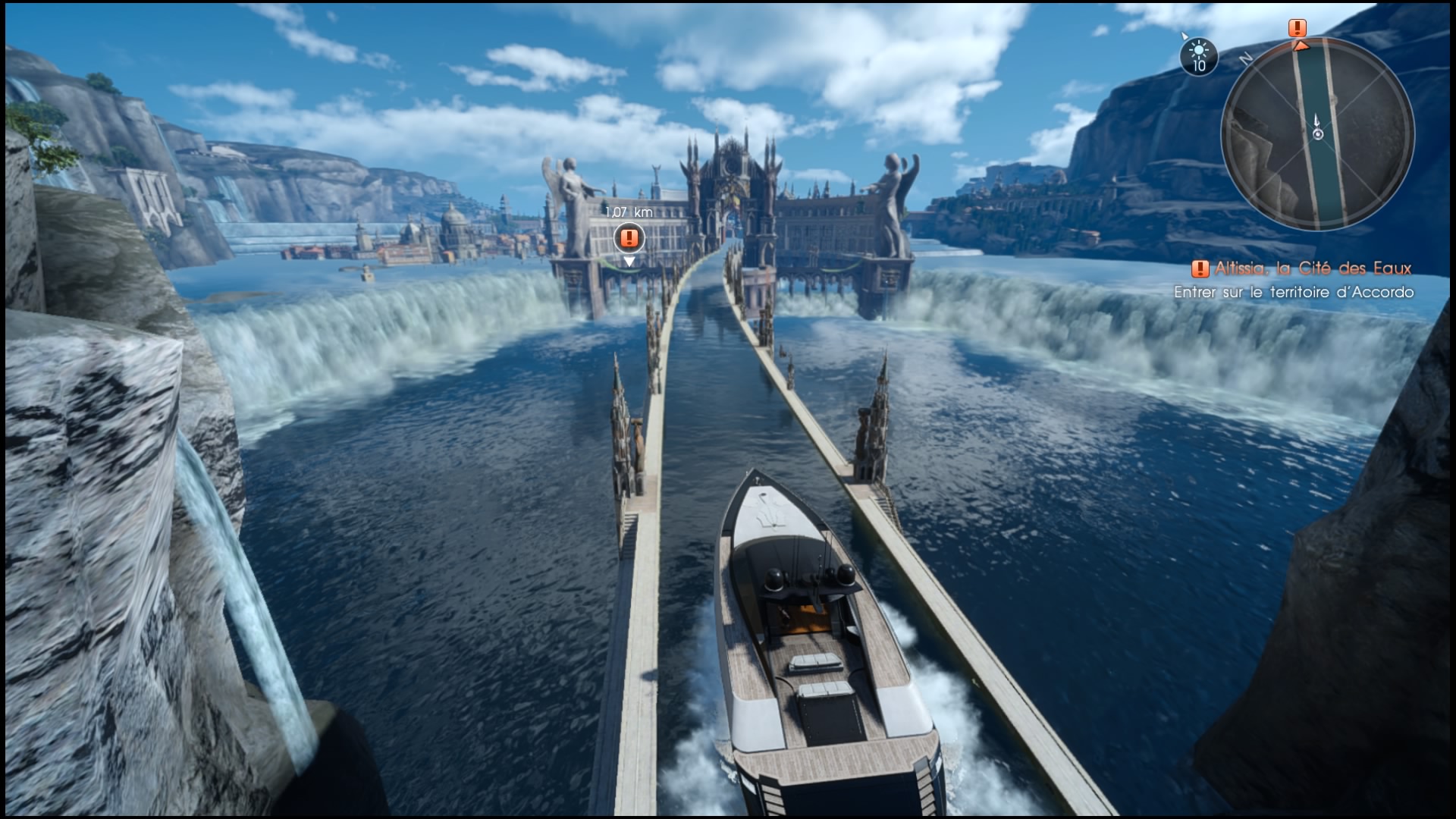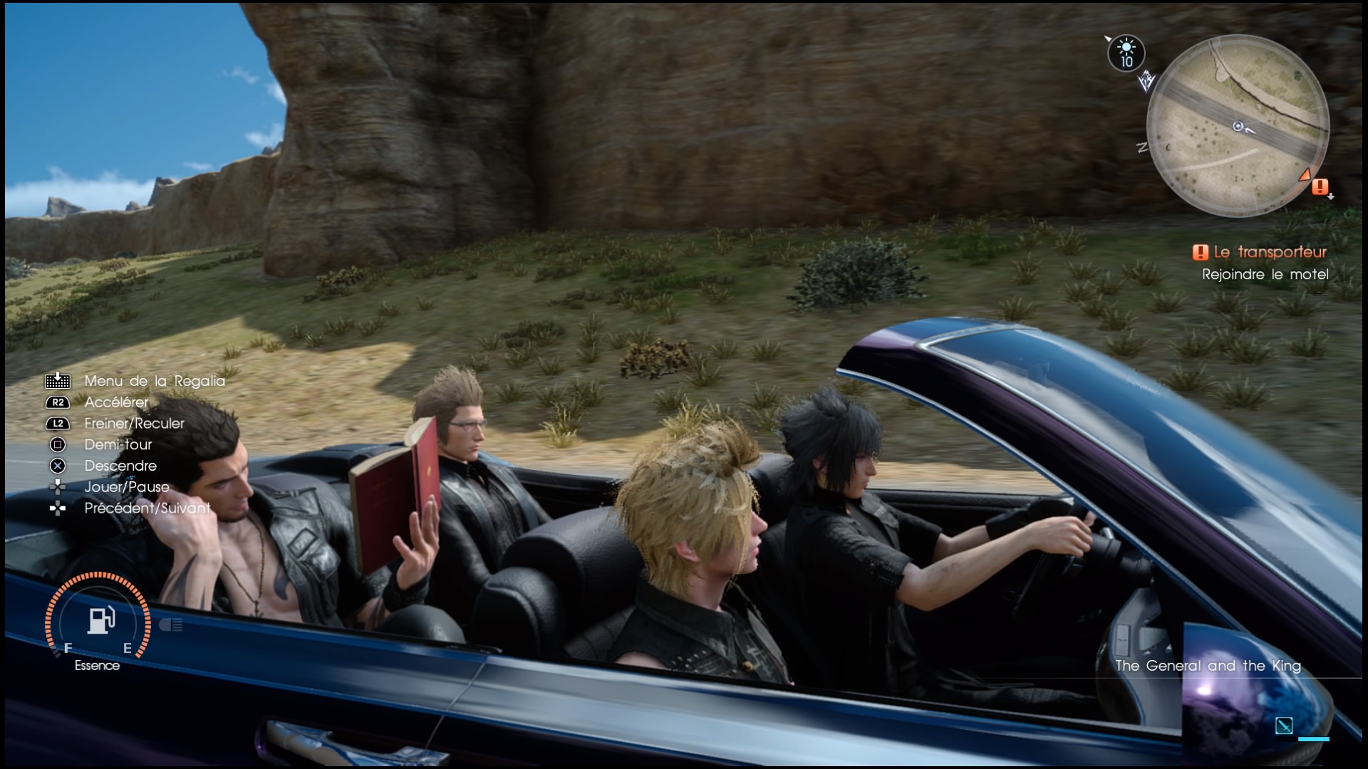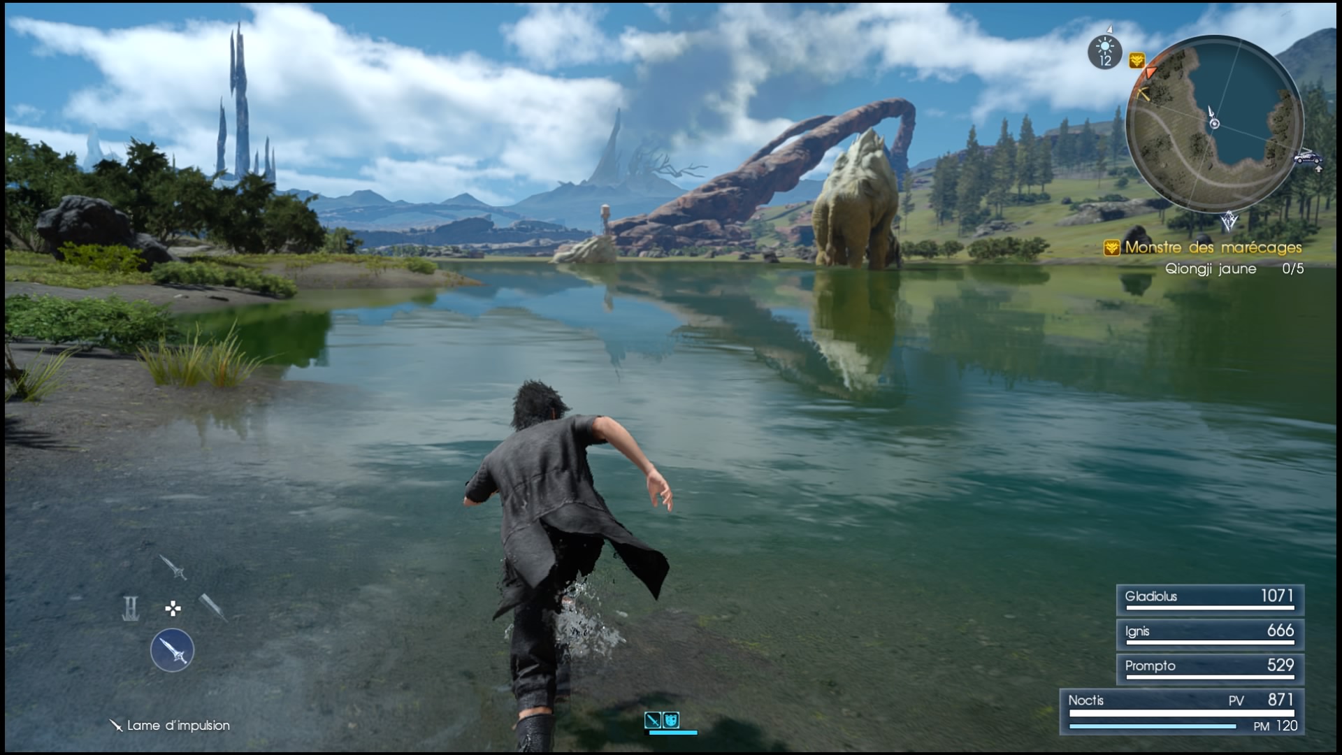 Pour dire, la cinématique à la fin du premier chapitre a un montage fort étrange, comme s’il s’agissait d’une bande annonce. Bon depuis, j’aurais regardé le film Kingsglaive, se déroulant juste avant, et je comprends mieux. Cette cinématique est un montage ultra cut d’événements du film. Voilà. Bon maintenant, ça n’excuse pas tout, car le film ne développe pas les personnages qui nous sont introduits en 2 secondes dans le jeu avant de disparaître presque totalement. Un manque de finition ? Sans doute oui, car même plus tard dans le jeu, on se tapera parfois des fondus au noir avec pour simple indication « quelques semaines plus tard ». Car ce côté là, on le retrouve ce manque de finition dans le fameux monde ouvert que l’on nous vends, mais également dans le nouveau système de combat. Alors parlons donc du monde ouvert. Une map énorme qui se débloque au fur et à mesure, et nous vend du rêve, des panoramas, de l’exploration, des quêtes annexes. Alors niveau panorama, c’est réussi, certains sont fort réussies, et on évite le système Far Cry 5 : on peut avancer dans la map et faire 5 pas sans se faire agresser par l’empire et la faune et flore de cet environnement. Par contre, il faut bien avouer que traverser cette map n’est pas toujours la chose la plus excitante du monde. Au début, lorsque l’on découvre, on est émerveillé, car c’est beau, ça nous promet d’être libre. Puis rapidement, on se heurte à deux petits soucis. Cette map, jolie et semblant vivante, avec ses lacs, ses monstres vivants dedans et qui parfois font juste leur vie et ne nous attaquent pas, traversant la route, et bien elle est aussi parfois un peu vide. Surtout lorsque l’on veut aller quelque part et que l’on se rends compte qu’il y a en réalité une grosse montagne sur notre route, et qu’il faudra en réalité faire un gros détour, nous ramenant au chemin principal, à savoir la route. Et on en vient au gros souci du jeu à mes yeux, à savoir, la conduite. La map est grande, vaste, parfois un peu vide avec beaucoup de prairies et de forêts entre deux petits villages minuscules ne contenant qu’une boutique et une station service, et il va donc falloir soit courir un max, soit utiliser la voiture.