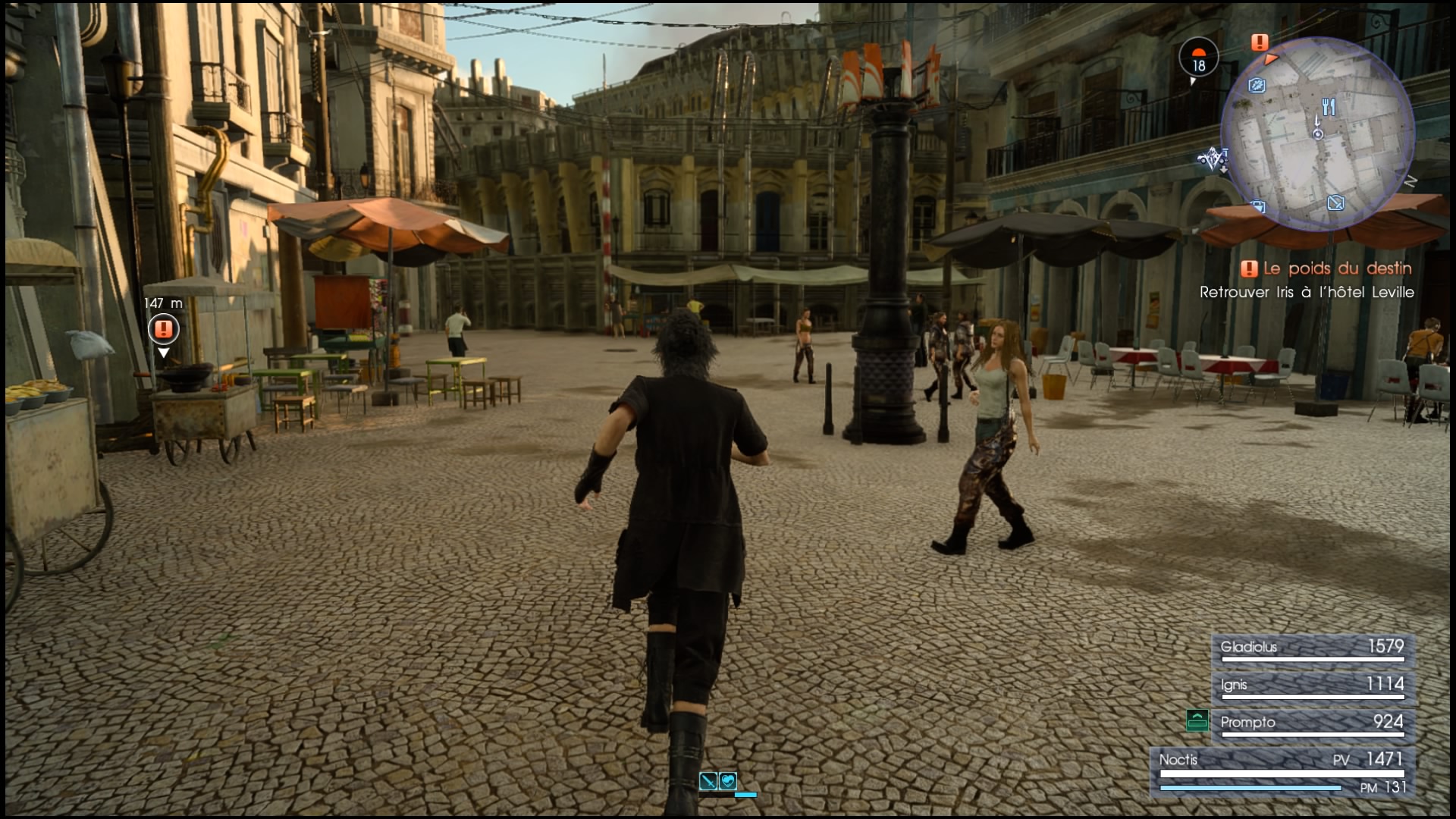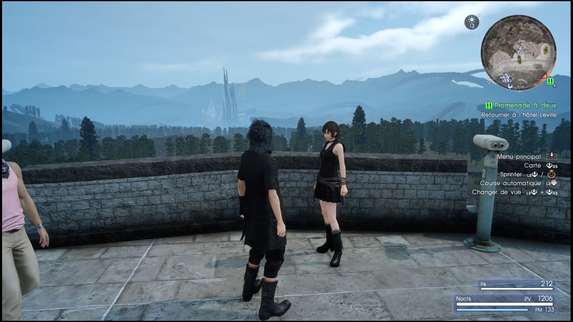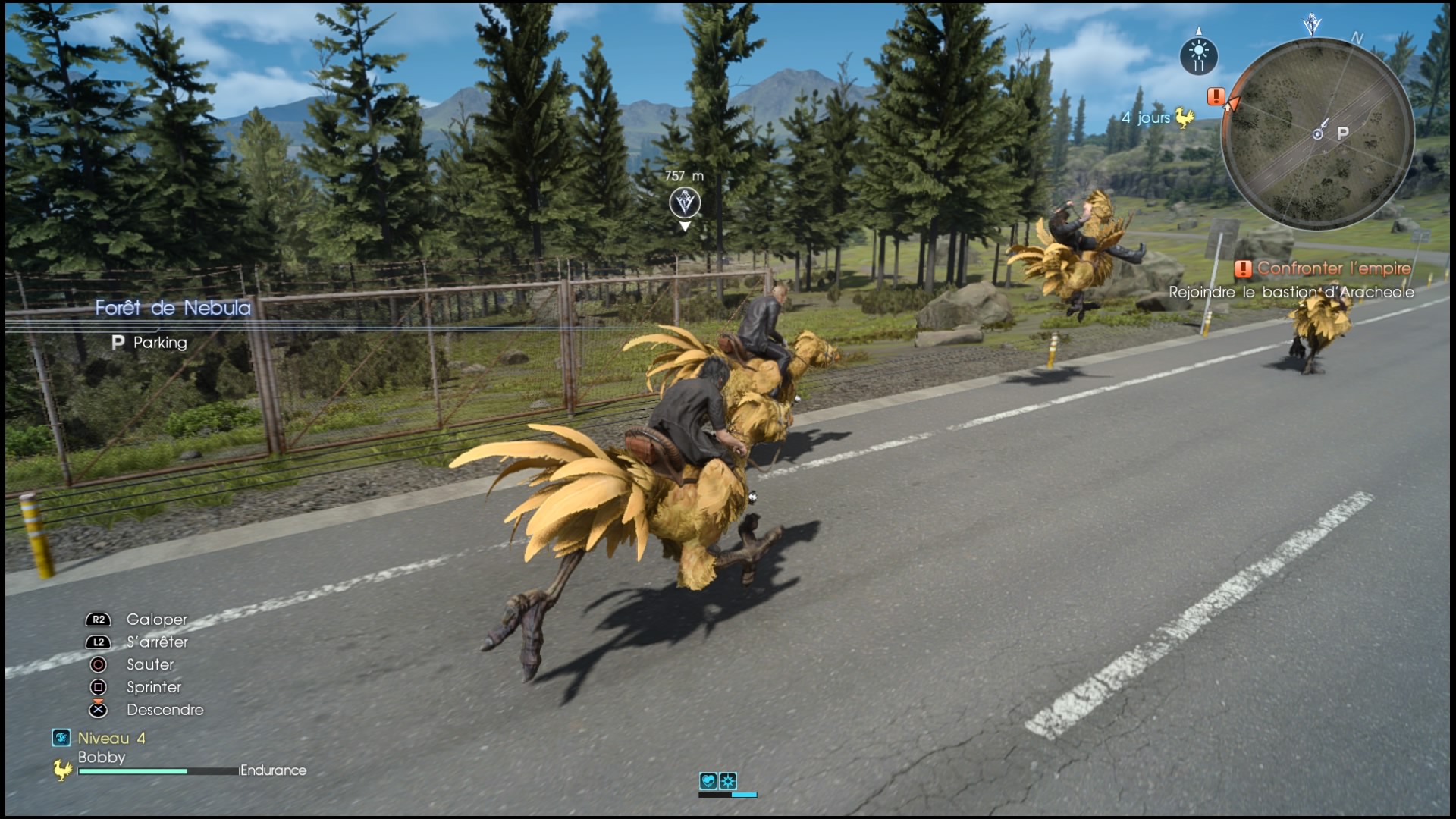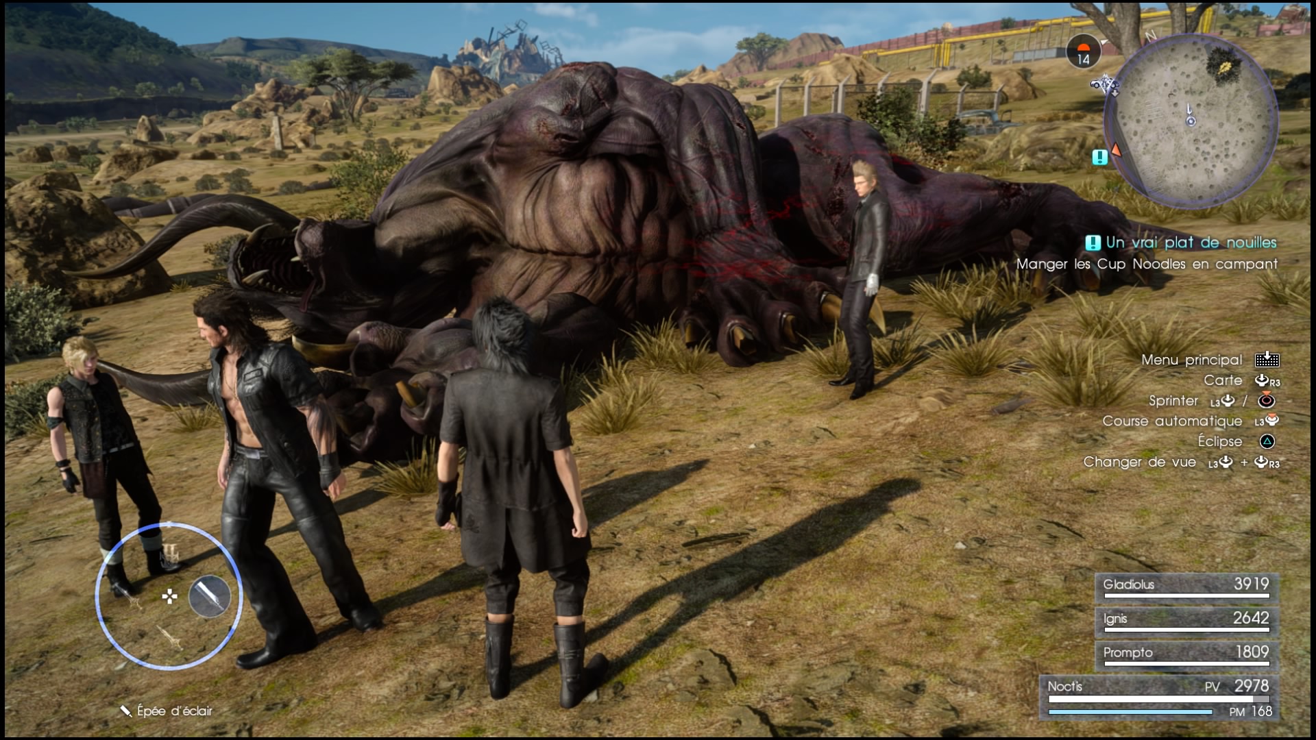 Au-delà de son monde ouvert donc, grand mais parfois vide, et de sa conduite peu palpitante, ce Final n’a pas de grande nouveauté, à l’exception de son système de combat. Le reste, on le connaît. Des compétences à développer, de l’expérience au fur et à mesure des combats et des quêtes, et des quêtes annexes en pagaille. Niveau expérience et compétence, la seule vraie nouveauté sera qu’il faudra dormir pour assimiler toute l’expérience accumulée jusque là et donc monter de niveau. Un procédé frustrant mais sympathique, permettant de récupérer de la vie, de se reposer, de manger pour avoir des bonus le jour suivant, de voir les photos prises par notre compagnon fan de photos, puis au réveil, de profiter de notre récente expérience pour repartir à l’aventure. Les quêtes annexes, il faut bien en parler. Elles sont nombreuses. Et souvent répétitives et pas bien palpitantes. Elles sont découpées en deux catégories. Il y a celles que l’on récupère auprès de PNJ, et basiquement, il y aura trois types de quêtes qui seront déclinées à l’infini. Récupérer des plaques de chasseurs, qui va se résumer à aller à une zone, tuer les ennemis, trouver la plaque et la rapporter. Il y aura les quêtes où les gens vont nous faire « hey wesh, t’es le roi, va me cueillir tel truc », et comme un bon larbin, on y va, pour un peu d’expériences et d’argent. Cueillir des fleurs, récolter des légumes. Oui oui, passionnant ! Et il y aura quelques quêtes plus « originales », à base de récupération d’échantillons (ou de grenouilles, grrrr), et de destruction de bases ennemis, sans doute les missions les plus longues et hard du jeu, puis que je me serais frotté vers le chapitre 7 à une base par hasard en me baladant sur le map, sans avoir le bon niveau, face à de gros méchas qui font bien mal (oui, une quête level 50, j’étais level 29).