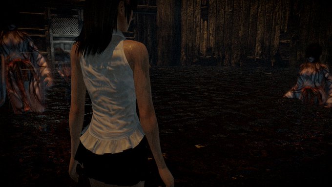 Par contre, le jeu ajoute deux éléments à son gameplay. Le premier, absolument génial, permet, une fois un fantôme vaincu, et s’y l’on se rapproche rapidement de lui, de toucher l’esprit afin d’avoir droit à une petite vidéo qui nous montrera les derniers instants de cet esprit, de son parfois lointain vivant. Nous offrant donc des vidéos façons vieille VHS, lugubre à souhait. Le second ajout, primordial dans les faits, concerne l’eau, omniprésente, dans le gameplay, dans l’intrigue, dans les lieux visités. En effet, l’eau a un effet néfaste sur nous. Si notre héroïne, ou héros lorsque l’on joue Ren, est trempé, il prendra plus de dégâts face aux esprits, et sera plus susceptible d’être attaqué également. En contre partie, on fera également plus de dégâts avec notre appareil photo. L’ajout est intéressant, et parfois fonctionne, surtout au début. Lors du chapitre 6 par exemple, à la fois ma pire et meilleure expérience dans le jeu, alors que l’on doit fuir les lieux, voilà t’y-pas qu’il se met à pleuvoir à verse, et que notre trajet étant bloqué, que le joueur doit s’aventurer vers des tunnels abandonnés. Bel hommage d’ailleurs à Inunaki, puisque le tunnel semble vouloir quelque peu reproduire le vrai, avec en prime une belle cabine téléphonique lugubre à l’entrée. C’est lors de ce chapitre que le procédé de l’eau a trouvé sa limite. Car autant, lors de ma fuite, ça a fonctionné un peu malgré lui, grâce surtout à la découverte de nouveaux environnements, autant après m’être perdu dans le lieu principal du chapitre pendant carrément une heure, à me faire souvent attaquer, et à devoir traverser des lieux à moitié inondé, et bien, je me suis retrouvé trempé en permanence, sans forcément voir de différence niveau gameplay. On me dira que ceci peut s’expliquer du fait que de toute façon, je suis nul avec le GamePad dans les mains, mais bon.