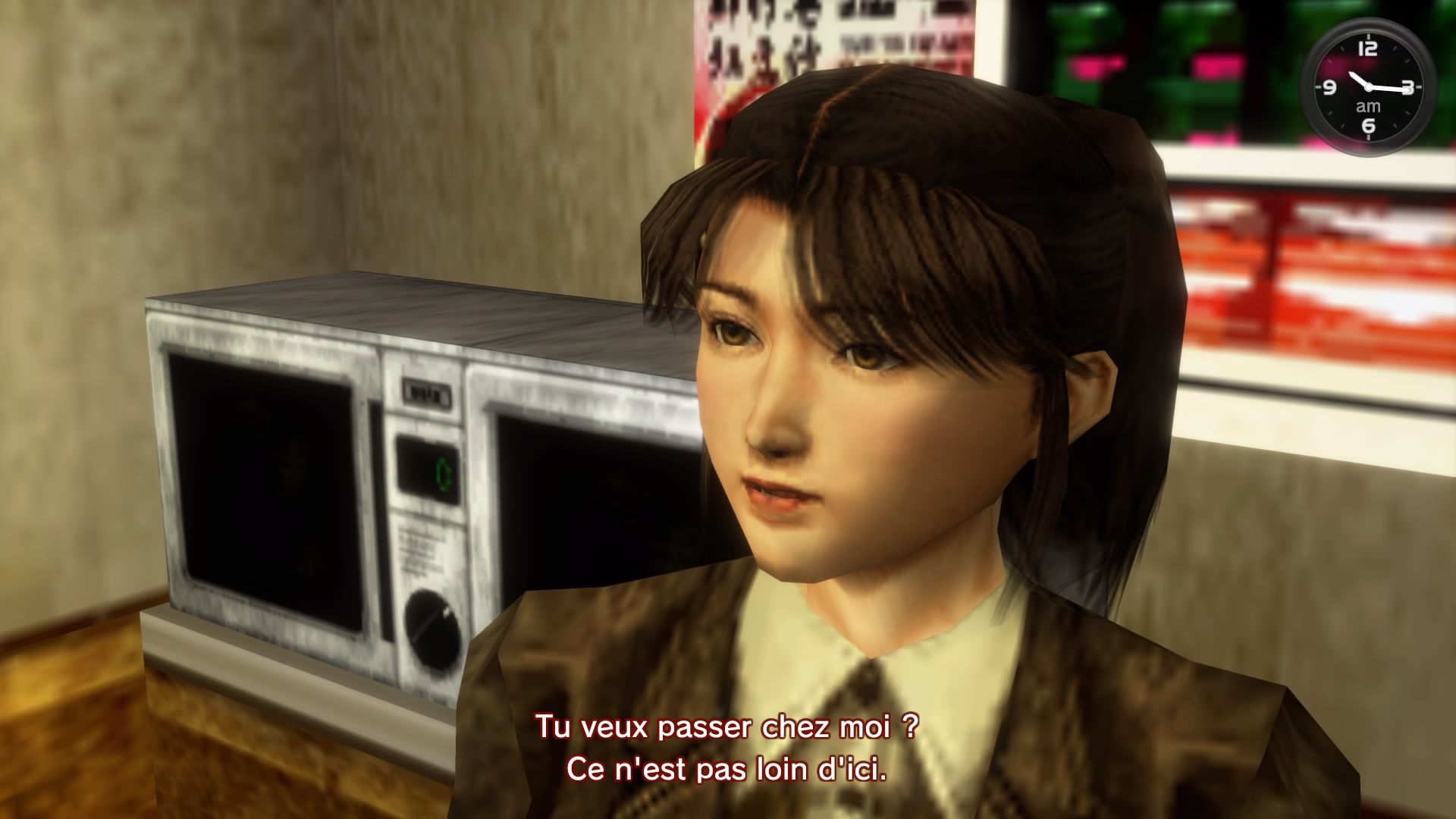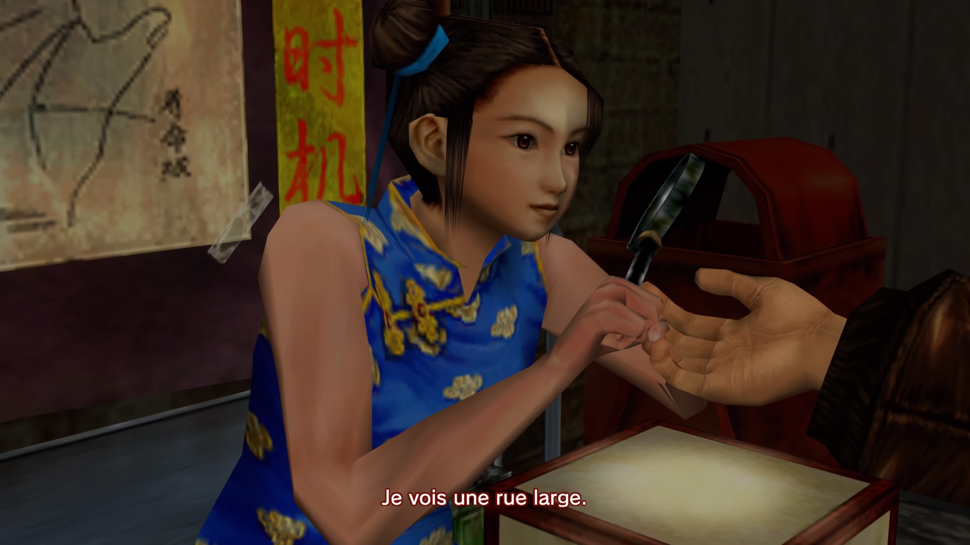 Les combats eux se déroulent comme dans le premier jeu, en étant calqués sur le système de Virtua Fighter, et ça fonctionne bien. Dommage que les endroits pour s’entrainer à maitriser des coups sont beaucoup plus rares, comparé au premier jeu, où il était parfois possible de passer le temps en s’entrainant une demi-heure dans un parking vide. Shenmue II propose toujours autant de contenu en tout cas, optionnel souvent, avec des rencontres aléatoires, ou des PNJ qui nous proposeront carrément des pans d’intrigues secondaires bienvenues. Oui, en allant totalement par hasard dans un magasin d’alimentation dans un quartier d’Hong Kong, j’aurais rencontré une caissière à mi-temps, étudiante Japonaise, qui craquait quelque peu pour moi. Totalement inutile, mais amusant, voir plaisant, si bien que j’y retournais dés que je passais dans ce quartier, quitte à perdre une demi-heure de mon précieux temps. Et si Ryo est seul au début de l’aventure, lâché dans un nouvel environnement, une nouvelle galerie de personnages va vite l’entourer, comme Joy qui débarque toujours avec sa moto en écoutant du rock, Ren le gangster qui nous arnaque toujours, ou le jeune Wong, pro pour crocheter des serrures. Ils sont tous attachants, et utiles pour le cheminement général du jeu.