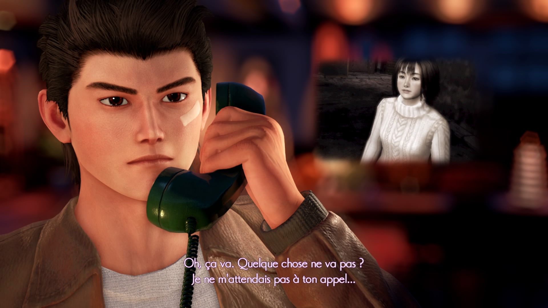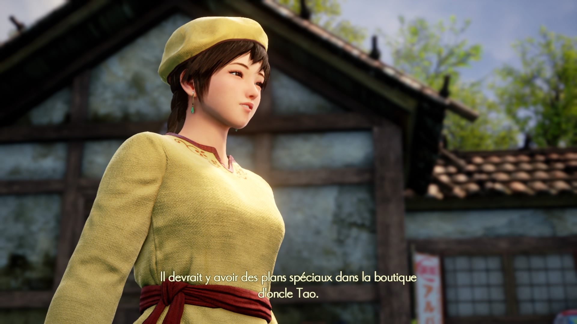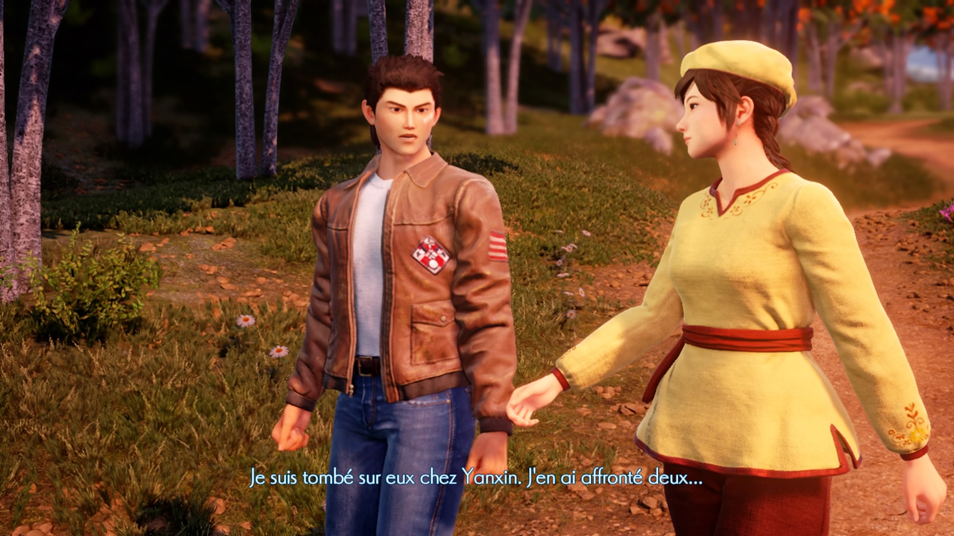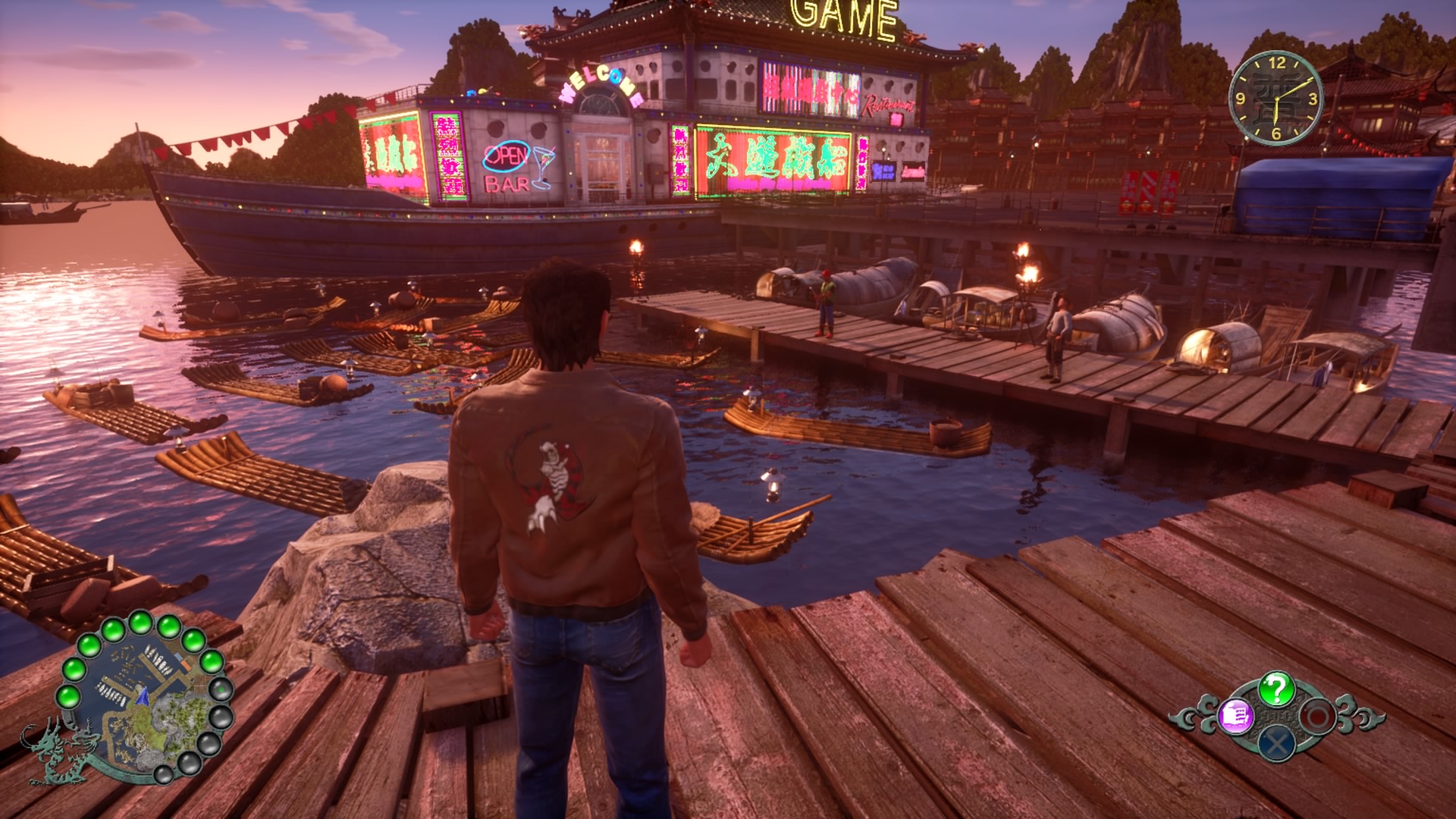 Car Shenmue 3, c’est comme les deux premiers, une invitation au voyage, une invitation à explorer, à prendre notre temps. Chaque jour, on se lève, à 7h, on part en direction du village, on peut s’arrêter du dojo pour s’entrainer dans nos postures ou nos coups, affronter un ennemi, ou bien continuer et s’arrêter à une boutique pour demander à couper du bois et ainsi gagner un peu d’argent, ou bien aller directement à notre objectif, interroger les villageois. Ou aller au lac pour pêcher, et aussi gagner de l’argent. Ou aider des enfants ou d’autres villageois pour quelques quêtes secondaires. Si l’envie nous prend, on peut aller au stand pour jouer à des jeux de hasards, comme des jeux de dés ou autres, ou aller à la toute petite salle d’arcade, qui, malheureusement, Shenmue 3 n’étant plus un jeu Sega, ne contient plus les jeux cultes du studio, développés par Suzuki pourtant, mais que l’on retrouve dans les jeux Yakuza. Et puis en sortant de la salle, on peut faire nos courses au marché, acheter de la nourriture, ou échanger des jetons contre des prix, et s’arrêter en haut d’une colline pour admirer le coucher de soleil, avant de cueillir quelques herbes pour les vendre à un herboriste le lendemain, et rentrer à la maison de Shenhua, pour lui parler, apprendra à la connaître, et aller se coucher. Shenmue 3, c’est prendre son temps, vivre à son rythme, explorer, vivre en Chine en 1987. Ce dernier point d’ailleurs, discuter avec Shenhua, aura été ironiquement un de mes moments préférés du jeu, tant sa relation avec Ryo semble sincère, réaliste et touchante. Si l’on passe outre un aspect très daté dans la manière de mettre en scène ses dialogues, et outre des sous titres très étranges, donnant des situations extrêmement comiques (ce que quelqu’un connaissant un minimum le Japonais pourra passer outre). Oui, les sous titres font parfois n’importe quoi, font passer Ryo pour un con même des fois, ou un être insensible, et le forcera à toujours dire bonjour quand il parle à quelqu’un, même quand il lui a déjà parlé 4 fois dans la même journée, alors que le dialogue oral commence clairement par « Shenhua » et non pas par « Konnichiwa ». Des choix de sous titres très étranges donc, présents tout le long, et ça ne s’améliore pas. Quand Shenhua nous conseille de nous coucher tôt car une longue journée (une longue quête donc) nous attend le lendemain, Ryo confirme, oralement, ce choix. Mais le sous titre, lui, à la ramasse, dira un « je te remercie »…