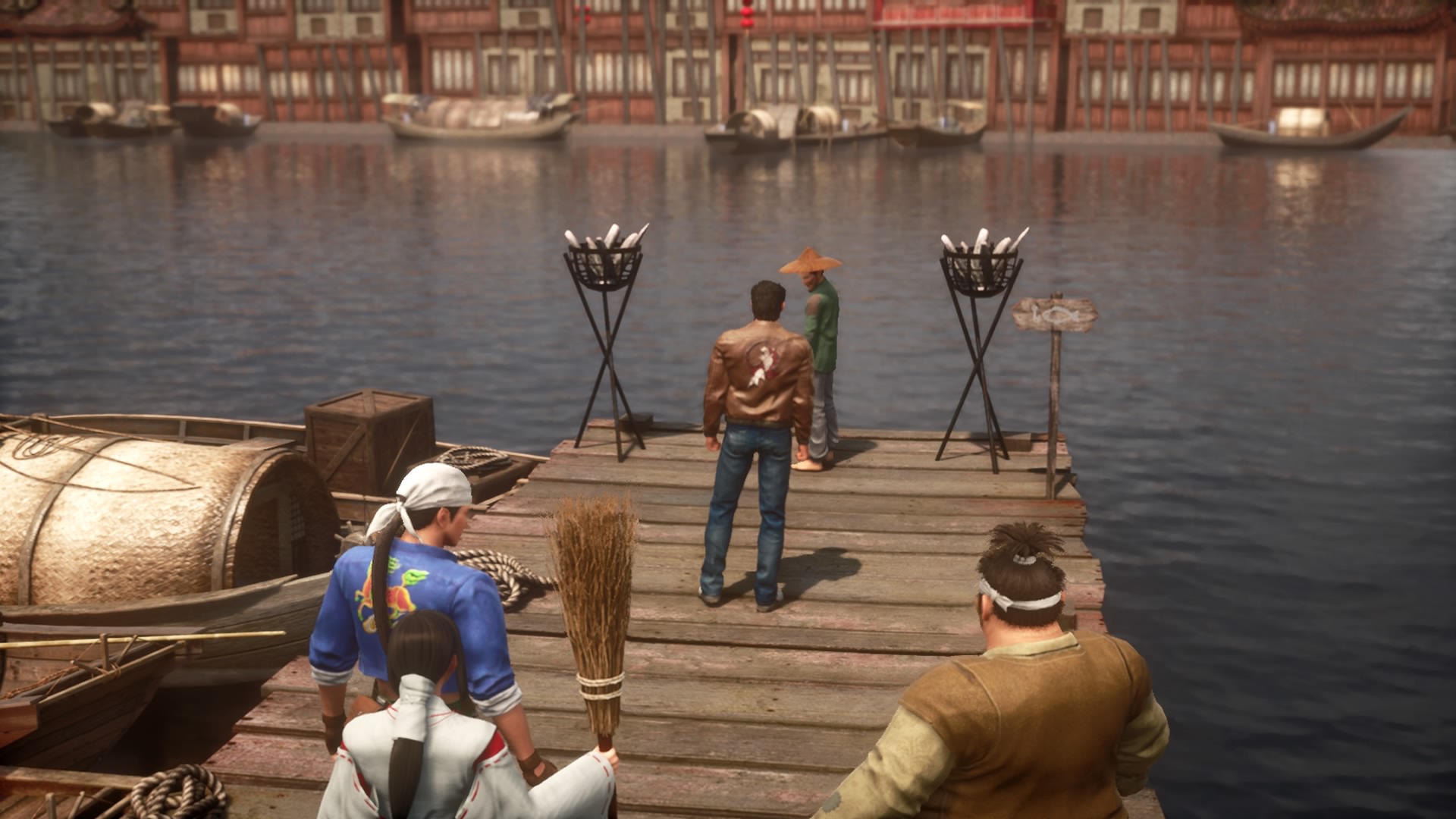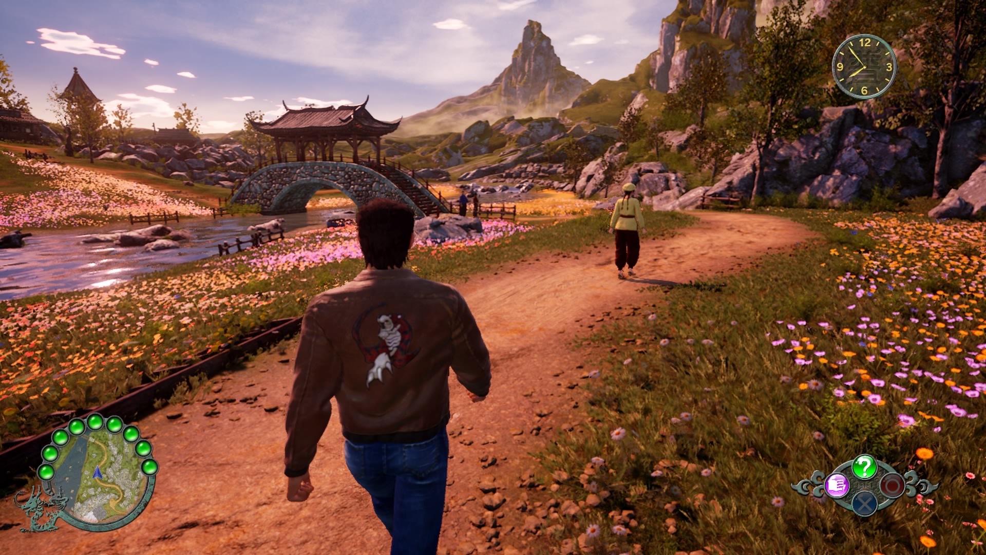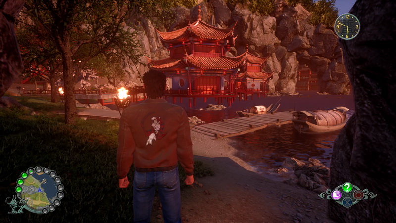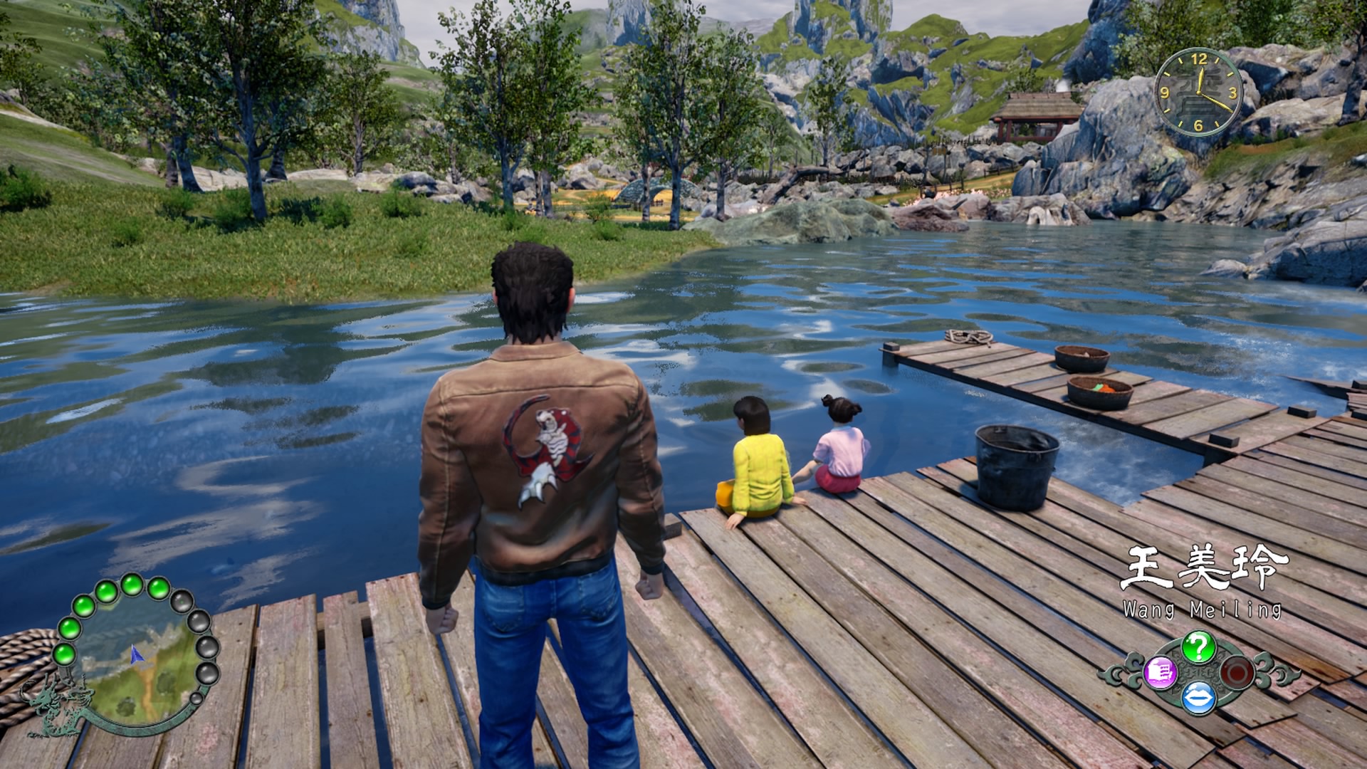 Car Shenmue 3, c’est comme les deux premiers, une invitation au voyage, une invitation à explorer, à prendre notre temps. Chaque jour, on se lève, à 7h, on part en direction du village, on peut s’arrêter du dojo pour s’entrainer dans nos postures ou nos coups, affronter un ennemi, ou bien continuer et s’arrêter à une boutique pour demander à couper du bois et ainsi gagner un peu d’argent, ou bien aller directement à notre objectif, interroger les villageois. Ou aller au lac pour pêcher, et aussi gagner de l’argent. Ou aider des enfants ou d’autres villageois pour quelques quêtes secondaires. Si l’envie nous prend, on peut aller au stand pour jouer à des jeux de hasards, comme des jeux de dés ou autres, ou aller à la toute petite salle d’arcade, qui, malheureusement, Shenmue 3 n’étant plus un jeu Sega, ne contient plus les jeux cultes du studio, développés par Suzuki pourtant, mais que l’on retrouve dans les jeux Yakuza. Et puis en sortant de la salle, on peut faire nos courses au marché, acheter de la nourriture, ou échanger des jetons contre des prix, et s’arrêter en haut d’une colline pour admirer le coucher de soleil, avant de cueillir quelques herbes pour les vendre à un herboriste le lendemain, et rentrer à la maison de Shenhua, pour lui parler, apprendra à la connaître, et aller se coucher. Shenmue 3, c’est prendre son temps, vivre à son rythme, explorer, vivre en Chine en 1987. Ce dernier point d’ailleurs, discuter avec Shenhua, aura été ironiquement un de mes moments préférés du jeu, tant sa relation avec Ryo semble sincère, réaliste et touchante. Si l’on passe outre un aspect très daté dans la manière de mettre en scène ses dialogues, et outre des sous titres très étranges, donnant des situations extrêmement comiques (ce que quelqu’un connaissant un minimum le Japonais pourra passer outre). Oui, les sous titres font parfois n’importe quoi, font passer Ryo pour un con même des fois, ou un être insensible, et le forcera à toujours dire bonjour quand il parle à quelqu’un, même quand il lui a déjà parlé 4 fois dans la même journée, alors que le dialogue oral commence clairement par « Shenhua » et non pas par « Konnichiwa ». Des choix de sous titres très étranges donc, présents tout le long, et ça ne s’améliore pas. Quand Shenhua nous conseille de nous coucher tôt car une longue journée (une longue quête donc) nous attend le lendemain, Ryo confirme, oralement, ce choix. Mais le sous titre, lui, à la ramasse, dira un « je te remercie »…