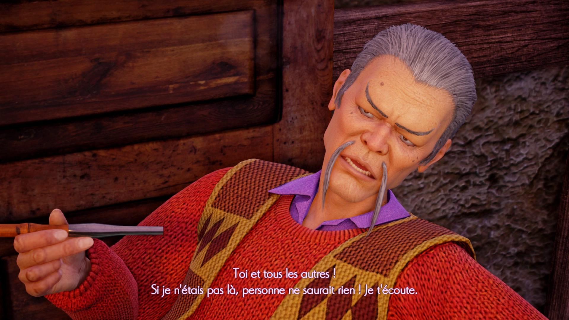 Mais c’est très bien. Shenmue n’a pas besoin d’un monde énorme et vide, mais préfère le faire à taille humaine, un petit village rural donc, et peupler ce petit monde de PNJ qui ont leur petite vie, vont travailler le matin, rentrent chez eux le soir. Rien de novateur, juste… et bien, du Shenmue. Ou dans un style néanmoins plus rythmé et blindé de combats, du Yakuza. Par la suite, une seconde carte s’ouvre à nous, avec la ville portuaire de Niaowu, bien plus grande, mais malgré tout risible si on la considère comme un open world. Beaucoup auront crachés sur Shenmue 3, et notamment, sa patte graphique, allant jusqu’à qualifier le jeu, au choix, de moche, ou de jeu venant de la génération précédente. C’est autant vrai que faux. Vrai car on ne peut le nier, il y a un retard technique. Vrai car on ne peut le nier, ces animations sont parfois rigides, parfois ratées. Et que finalement, tout semble venir d’un lointain passé, entre ces cinématiques en champ et contre champ, ses dialogues parfois maladroits, ses soucis de collisions dans de nombreuses zones, certaines animations faciales à côté de la plaque, une grosse rigidité générale, quelques éléments qui popent au dernier moment si l’on s’amuse à passer le jeu à courir. Mais oui, c’est aussi faux, car en l’état actuel (jeu joué en 2021 donc), le jeu est fluide, son visuel est charmant, ses décors sont vivants (l’exploration de certaines maisons par exemple respire le réalisme, explorer la maison d’un tailleur de pierre fourmille de détails si bien que l’on croit clairement à l’endroit où l’on évolue), certains panoramas et effets de lumières flattent la rétine, et le design de certains personnages est réussi. Shenmue 3 donne l’impression étrange en réalité d’être un jeu en retard, fidèle à ses origines, mais malgré tout amélioré. Car il n’y a pas photo, si Shenmue 1 et 2 étaient des claques à l’époque, Shenmue 3 est plus beau, mais malgré tout en retard. Sans que cela ne soit catastrophique.