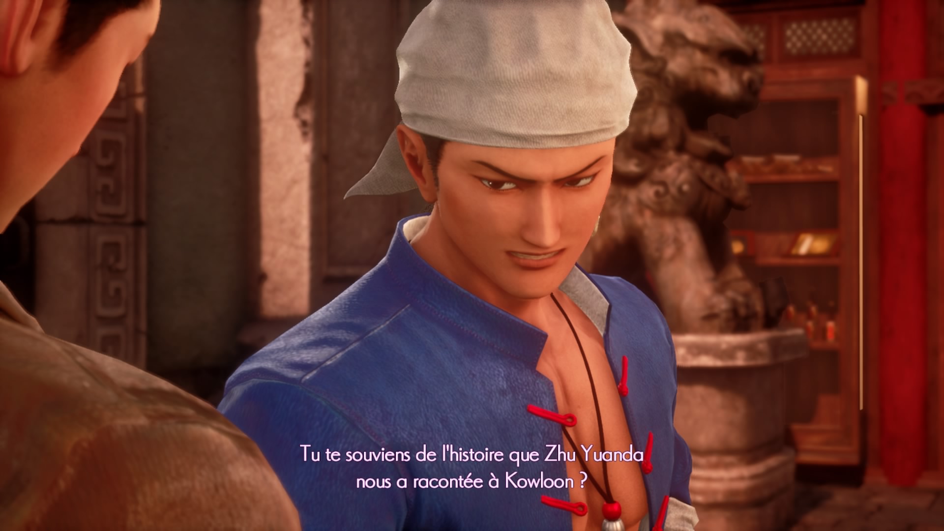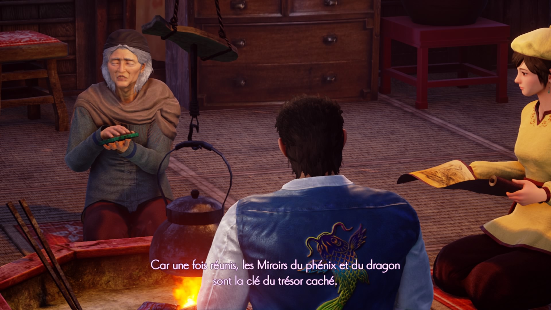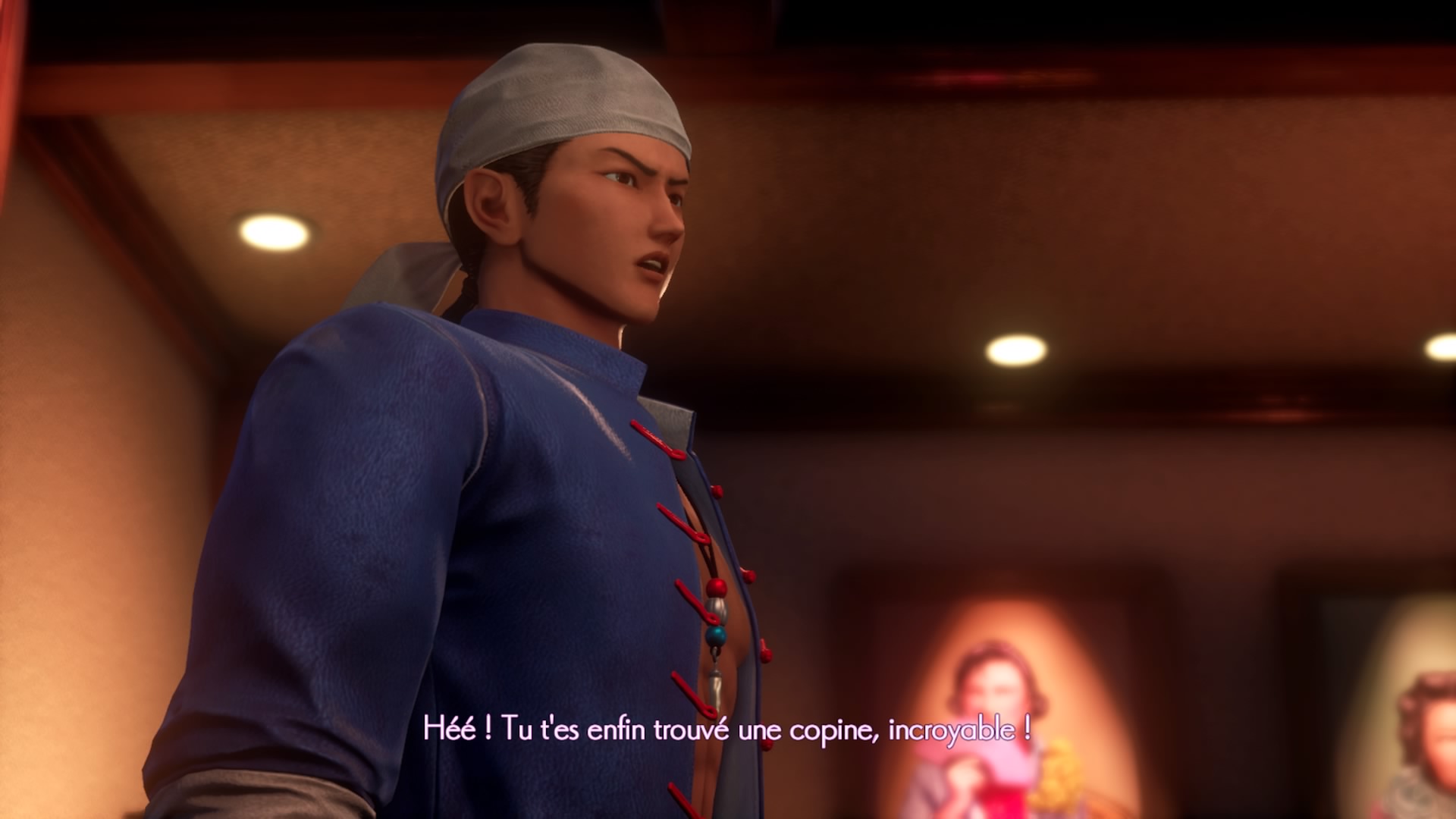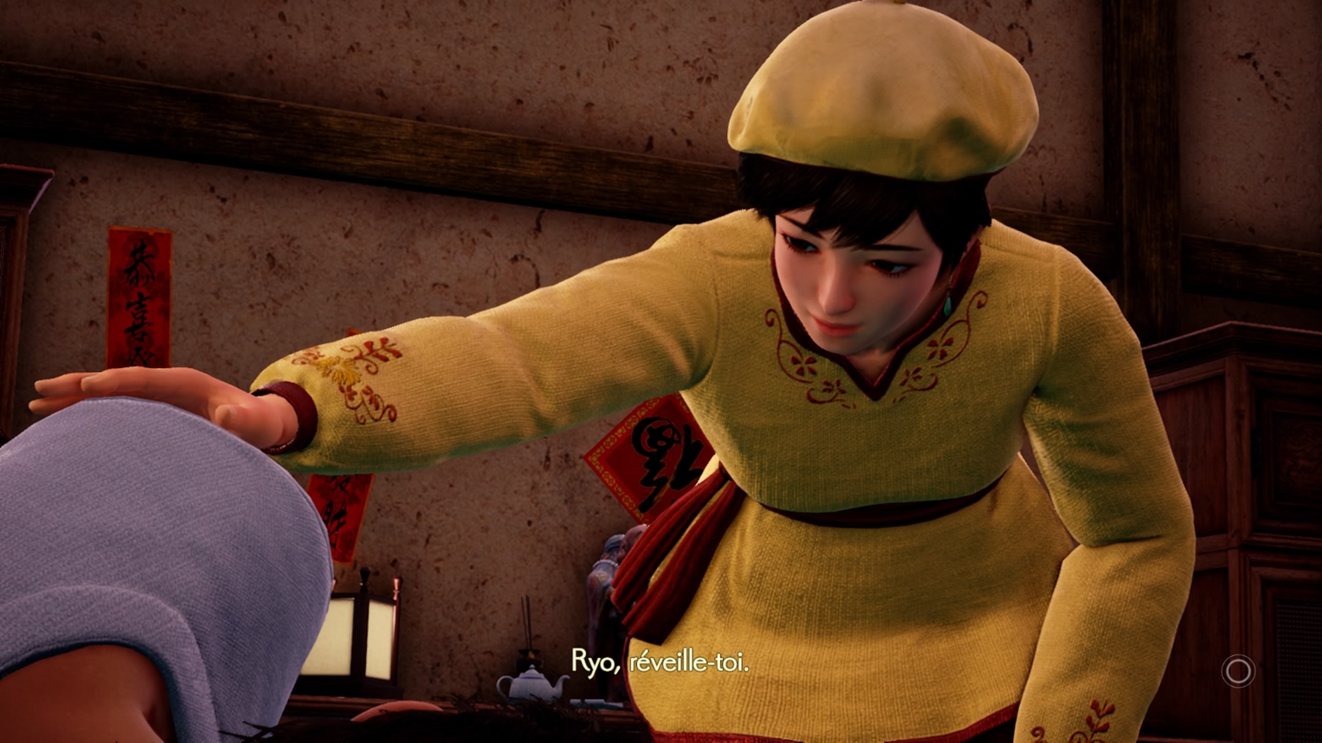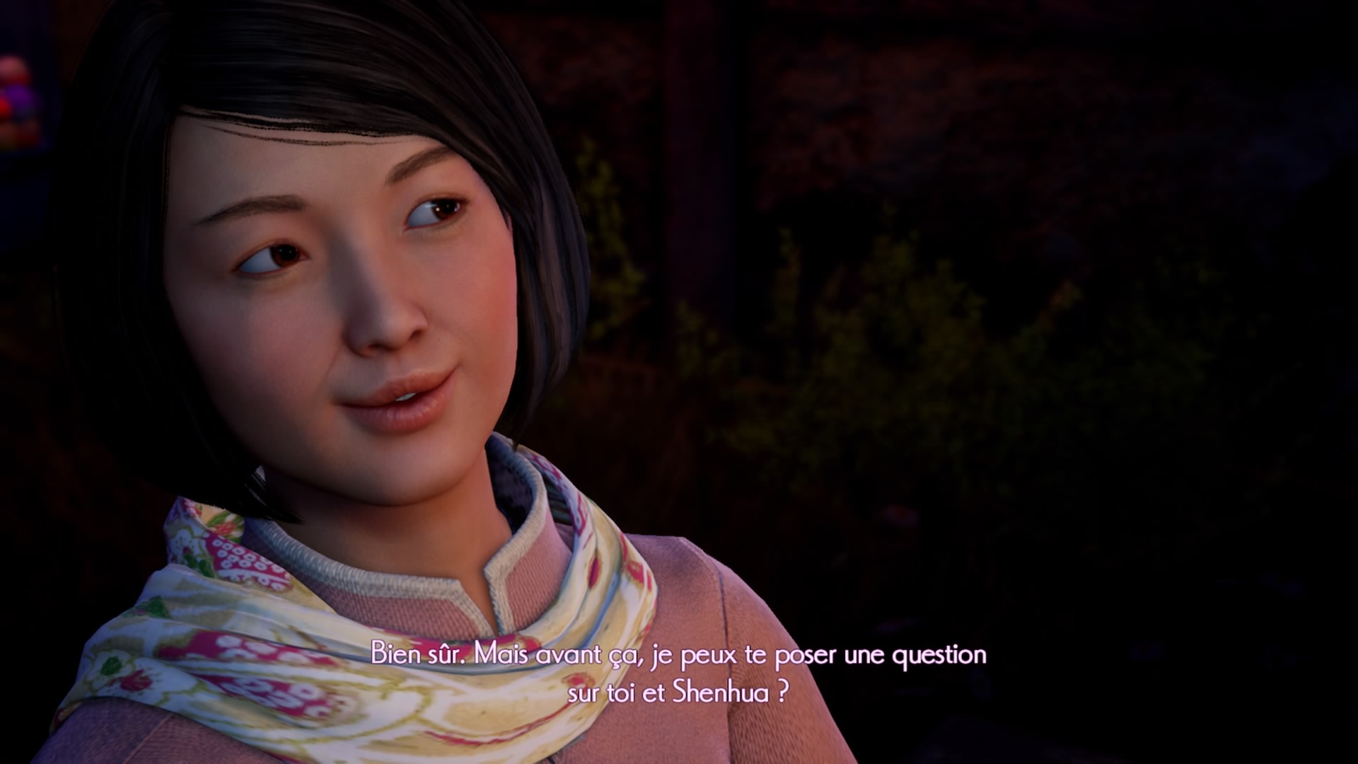 Même si certains défauts et lourdeurs auraient pu être corrigées, clairement ! Un autre défaut souvent cité est, finalement, le scénario de l’aventure. Car on dit souvent haut et fort que Shenmue 3 ne fait absolument pas avancer l’intrigue générale. Eeeeeeetttt… c’est le cas oui. Mais ne dit-on pas parfois que le cheminement compte plus que la destination ? Surtout que la destination, je la vois à des kilomètres, à savoir un duel contre Lan Di, soit gagné, soit abandonné (le développement scénaristique quoi), et un Ryo retournant au Japon, permettant la plus grosse nostalgie possible en revoyant tous les personnages rencontrés durant son périple durant son retour. Shenmue 3 ne rapproche pas Ryo de son objectif en tout cas, c’est vrai. MAIS Shenmue 3 a malgré tout un atout, c’est qu’en terme de background, il est bien plus chargé que les deux précédents. On en apprend énormément sur les miroirs, leur origine, leur création, leur lien avec le village de Bailu, ce que Lan Di cherche, introduit quelques nouveaux personnages importants, amis comme ennemis, et surtout, au cœur de cette aventure, il y a Shenhua. Shenmue 3 est clairement son jeu. Et cela se remarque, et se dévoile, de manière subtile. Parler à Shenhua tous les soirs en rentrant, lui poser des questions, en apprendre plus sur son passé, et finalement, lui répondre, s’ouvrir à elle en dévoilant notre propre passé, cela va développer Shenhua, va développer la relation entre les deux personnages, et petit à petit, amener quelques moments subtils et mystérieux. Car Shenhua a clairement un pouvoir, peu importe sa nature, psychologique, psychique, mystique, peu importe. Cela est mit en avant durant plusieurs passages du jeu, et donne clairement de l’épaisseur au personnage, et finalement, de la vie à l’ensemble. Elle est la plus grande réussite du titre.