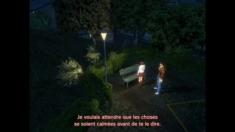 Ce qui rend par exemple les combats aussi bons et prenants dans Shenmue, c’est qu’ils sont très rares. Et puis, il y a les QTE aussi, Shenmue étant un des premiers jeux à populariser ce gameplay, mais sans nous noyer dedans comme chez Capcom quelques années plus tard (oui, je te regarde Resident Evil 6). Les QTE sont là, ils sont parfois logiques (un obstacle à éviter venant de la droite, il faudra logiquement appuyer sur la touche gauche), ils interviennent parfois dans des cinématiques, et ils fonctionnent, car le jeu n’en abuse pas. Si ces moments viennent donner un coup de boost au gameplay, voir à l’intrigue, Shenmue reste pourtant un jeu posé, un jeu qui prend son temps, un jeu qui nous force un peu au début à la contemplation, avant que ce ne soit le joueur qui le fasse de lui-même, par réflexe, alors habitué à l’aventure et à son rythme particulier, vivant l’aventure. Oui, passé un stade, alors que le joueur saura où aller, à qui parler, il ne pourra s’empêcher, en se levant le matin, d’aller nourrir un petit chaton, d’échanger quelques mots avec Nozomi, d’acheter une figurine à la boutique du coin, ou d’aller s’entraîner sur un parking désert afin d’être sûr de maitriser une technique dévastatrice en combat, qui pourrait s’avérer utile par la suite. Car si dans sa globalité, Shenmue n’est pas un jeu difficile, les deux derniers combats eux montent le niveau de difficulté d’un cran. Shenmue, c’est un jeu d’aventure, mais aussi en quelque sorte un simulateur de vie, mais parfois, lors de quelques rares séquences, c’est aussi un jeu de baston, ou bien un jeu de course, avec ces courses tous les matins avant le travail, ou avec la séquence de l’autoroute à moto, avec son chrono hyper serré.