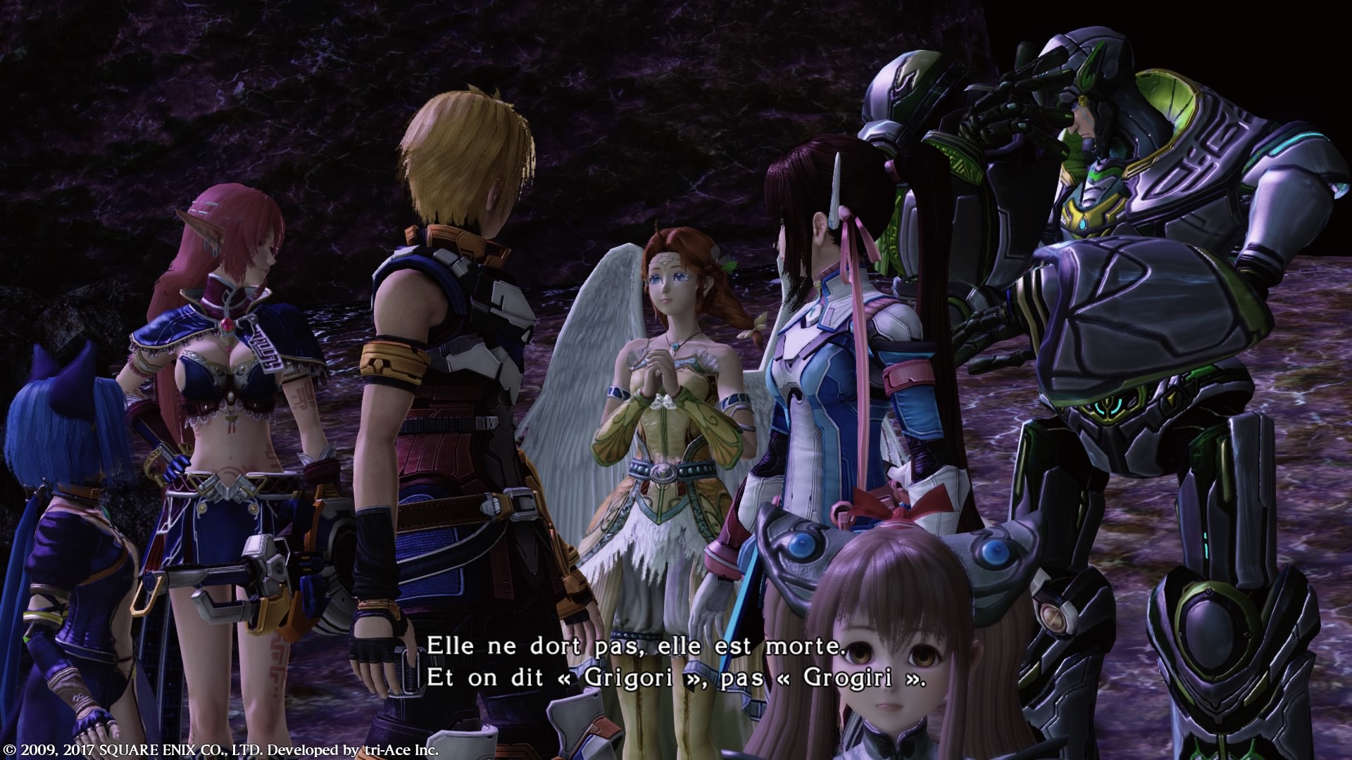 The Last Hope a donc un fond plutôt sympathique. Et par moment fort prenant. Pour preuve, j’y aurais passé un grand nombre d’heures. Mais au-delà de ça, ça vaut quoi niveau gameplay, graphismes et tout ça ? Graphiquement, si je ne peux pas comparer avec le jeu original, et bien pour un remaster d’un jeu qui a 10 ans maintenant, ça a plutôt de la gueule. L’exploration des lieux extérieurs flatte parfois la rétine, avec une belle distance d’affichage, des lieux variés et soignés. On ne pourra certes pas toujours en dire autant des donjons, mais bon. D’ailleurs, en parlant de donjons, il est de bon ton de revenir dessus une bonne fois pour toute. The Last Hope faisant dans la démesure, les donjons ne sont pas en reste, et certains sont sacrément longs, avec des points de sauvegardes bien éloignés, et il faudra parfois un certain temps (pas loin de deux heures pour certains donjons) pour en venir à bout, à condition de ne pas mourir bêtement face aux boss. Mais voilà, graphiquement, si l’on adhère au design des personnages, ça a plutôt de la gueule, et surtout le jeu reste fluide en toute circonstance. Sur toutes les heures de jeux, je n’aurais eu une baisse de framerate que sur un boss (celui du sanctuaire). Mais voilà, The Last Hope est beau, et fourmille de petits détails pour rendre son monde vivant. Sur certaines planètes, des petits insectes inoffensifs et à peine perceptibles volent autour de nous par exemple. Mieux, l’eau est plutôt jolie, Fallout 76 datant de 2018 pourrait en prendre de la graine. Bon tout n’est pas parfait, surtout en terme d’animation pure, et il faut aussi reconnaître certaines fautes de goût, comme par exemple ces lapins roses qui renvoient aux chocobos de Final Fantasy. Un bon fond, des personnages attachants, un équipage complémentaire, de beaux graphismes, un jeu fluide.