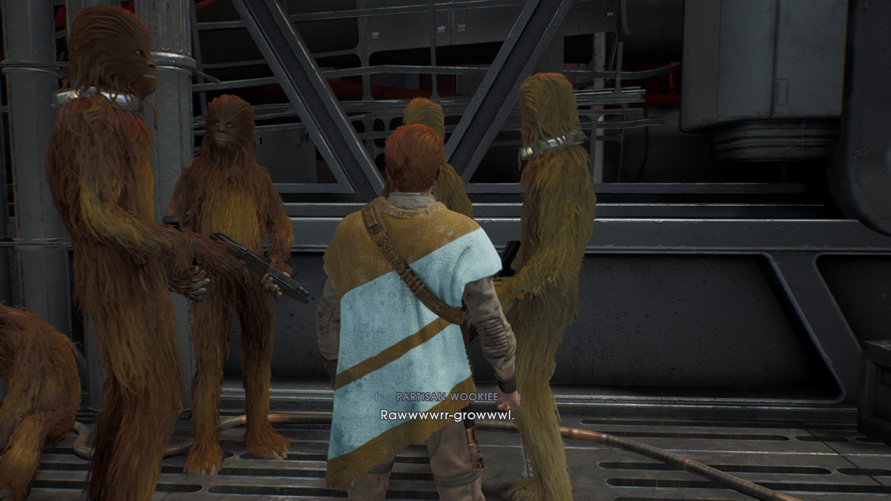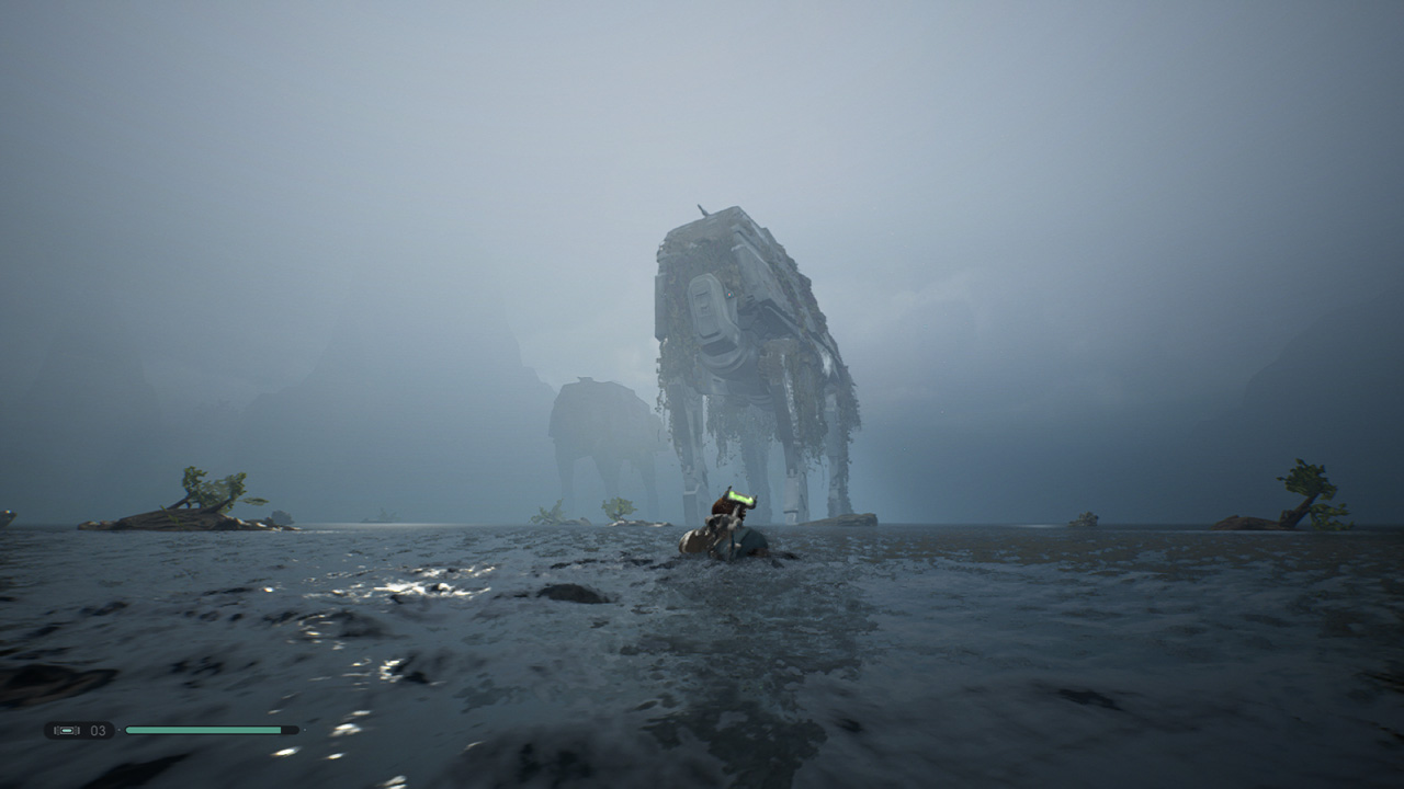 Les effets de lumières sont très jolis et flattent la rétine. On pourra regretter que sur chaque planète, l’on devra à un moment donné explorer des grottes lugubres, encore et toujours, mais rien de bien grave. Mais il y a le 5% restant visuellement. Et ce 5% concerne les Wookies, ignobles et risibles à l’écran. Pourquoi tant de soin sur tout le reste mais un tel carnage pour cette pauvre espèce qui n’a rien demandé à personne ? Aucune idée, demandez à Chewbacca. C’est dommage, mais heureusement, présent sur une seule mission. En terme de gameplay, l’ensemble répond bien et se fait plutôt instinctif. Les QTE en combats sont d’ailleurs plutôt rares, n’étant là que pour quelques rares finish moves, ou quelques moments clés en combat de boss. On saluera également l’initiative du studio d’avoir tenté de diversifier l’intrigue et donc son gameplay. Dés le début, on aura une fuite à bord d’un train, visuellement impressionnante. En arrivant sur une planète, nous voilà à escalader un gigantesque AT-AT avant d’en prendre le contrôle. Des séquences visuellement splendides, mais pas toujours ultra passionnantes à jouer. La séquence de shoot à bord de l’AT-AT n’est par exemple pas bien passionnante (mais très courte). Notons également, en dehors des combats, des commandes qui répondent bien pour les phases de plateformes, mais une caméra qui décide de se coller juste derrière notre personnage pour des phases de glissades, beaucoup trop près donc, et qui m’auront valût plus d’une fois la mort. Heureusement, contrairement à Dark Souls, le jeu n’est pas aussi pénalisant, car si mourir nous fait perdre notre expérience dans un combat, mourir d’une chute nous remet juste avant le saut, avec juste 10% de vie en moins. Ouf.