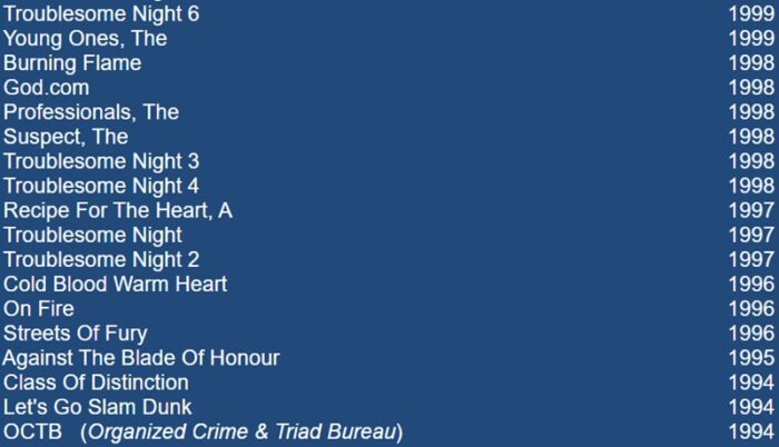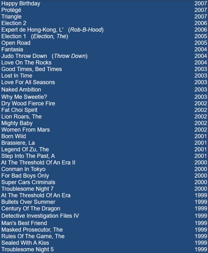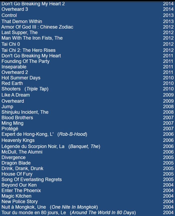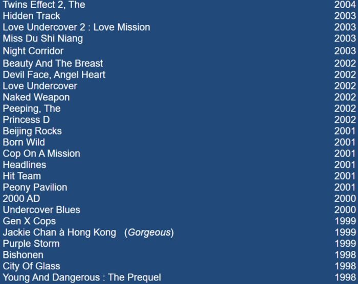 Puis, très remarqué par les producteurs en 99, il enchaîne donc album de canto pop (mener une carrière polyvalente est monnaie courante à HK), et des films plus ou moins réussis The Masked Prosecutor, Super Cars Criminals… En voila un qui devrait continuer à tourner encore pendant quelques années.