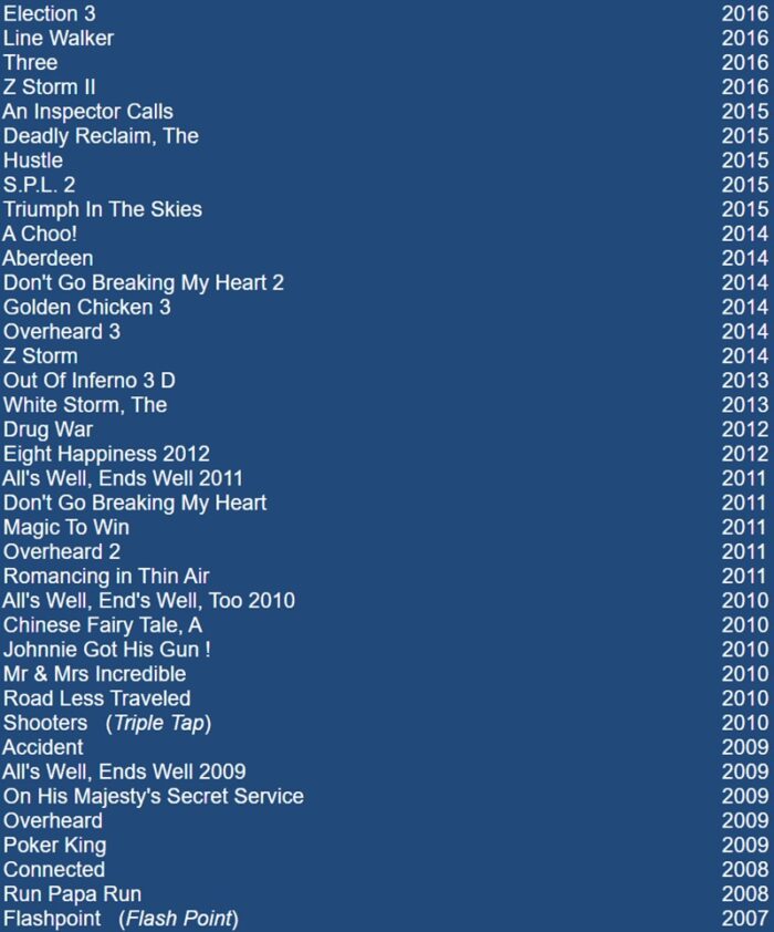 Felix Chong est notamment l’auteur des scénarii de Tokyo Raiders, Gen Y Cops, Cat And Mouse, ainsi que la trilogie Infernal Affairs dont le premier opus sera récompensé par le HK Awards du meilleur script.