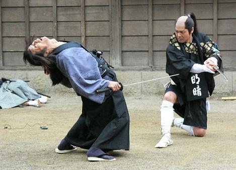 Concernant Fukumoto Seizô, un fan a donc écrit aux producteurs de KNIGHT SCOOP en 1992 afin de rencontrer un obscur figurant de séries télé (le plus souvent du jidai geki) dont il ne connaissait pas même le nom. L’émission se démène pour retrouver le figurant en question : Fukumoto Seizô…qui accède alors à une certaine popularité suite au succès du show télé, surtout que tout le monde loue son professionnalisme sur les plateaux de tournage (voir ce reportage postérieur de NHK dans lequel vous pouvez le voir en action : à un moment donné il tombe très près des flammes, mais ne bouge pas car il est censé être mort ! – lien youtube ). Après TANTEI KNIGHT SCOOP, c’est donc le rêve éveillé pour Seizô : s’il n’a aucun premier rôle, beaucoup de réalisateurs l’engagent pour jouer les seconds (voire même plutôt troisièmes) couteaux mais cette fois-ci dans de plus grandes productions : en gros, tout le monde aime le voir mourir à l’écran. Il sera même engagé dans le blockbuster hollywoodien THE LAST SAMURAI, pour le petit rôle du « silent samurai ». Une consécration…qui dure jusqu’à aujourd’hui, puisqu’on a pu le voir dans de très grosses productions japonaises récentes telles que 13 ASSASSINS, ZATOICHI THE LAST ou encore NINTAMA RANTARÔ (dans lequel il est une nouvelle fois battu, mais par un ninja rose qui maquille ses victimes : hilarant de voir ainsi Seizô quasiment travesti dans la défaite !).