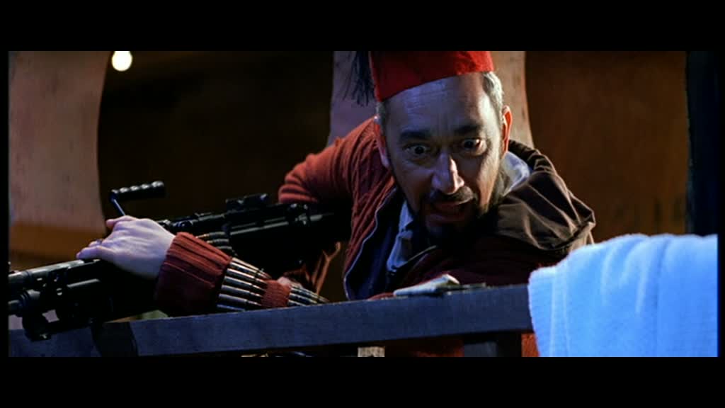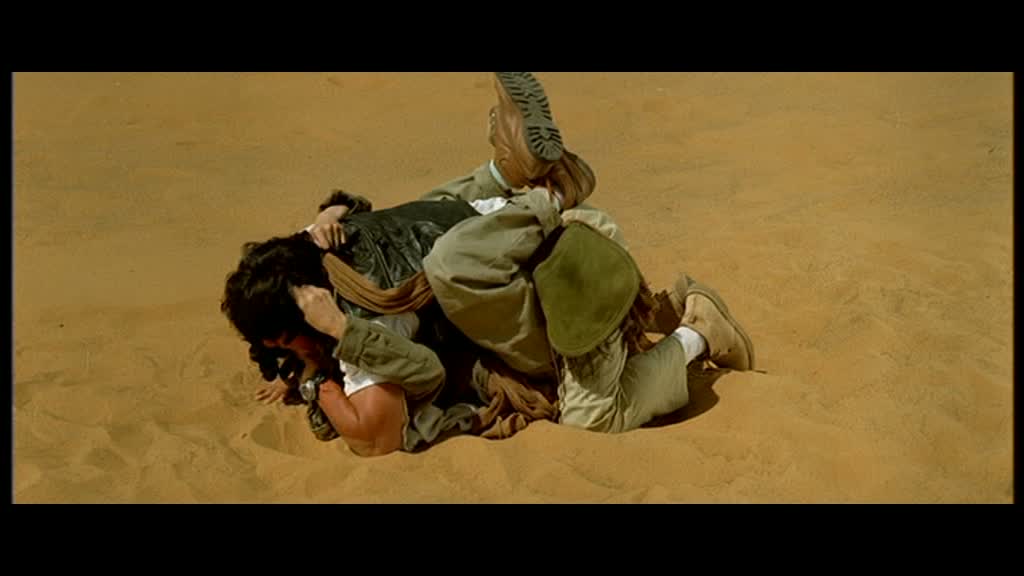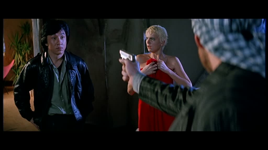 Suite donc de Mister Dynamite, le film ne garde que peu d’éléments. Jackie joue encore le Condor, un aventurier, et part pour une nouvelle mission. Après l’armure de Dieu dans le premier opus, on retrouve le comte du premier film qui envoie Jackie récupérer de l’or en plein milieu du Sahara, et à part ça, plus rien. On ne retrouvera pas le meilleur ami de Jackie, ni la fille du comte. Très rapidement, Jackie se retrouve avec une nouvelle équipe, constituée d’une historienne Chinoise, d’une touriste Japonaise et d’une jeune Allemande ayant un lien de parenté avec l’officier qui a dissimulée le trésor pendant la seconde guerre mondiale. Après une scène d’introduction exotique comme pour le premier opus histoire d’en mettre déjà plein la vue et une présentation des personnages éclair (oui, ici, on a vraiment pas le temps de s’ennuyer tant tout s’enchaîne), Jackie enchaîne déjà les séquences cultes. Une infiltration dans un appartement, un rapide combat, le gag de la serviette qui reviendra plusieurs fois, une poursuite en voiture et moto encore une fois signée Remy Julienne, déjà responsable de la magnifique poursuite du premier film. Ici, Remy fait encore mieux pour Jackie, avec une poursuite où les morceaux de bravoures s’enchaînent les uns après les autres pour le plus grand plaisir. Cela semble déjà beaucoup, et pourtant, cela ne s’avère être vraiment que l’introduction lors de la première demi-heure (oui oui !!), puisque le film commence véritablement après lorsque Jackie et son équipe partent dans le désert. Autant dire qu’en commençant comme ça, le film à intérêt à avoir de la ressource pour continuer pendant encore un peu plus d’une heure.