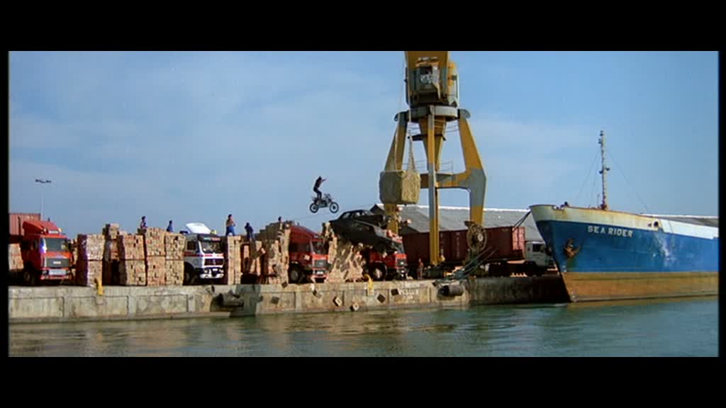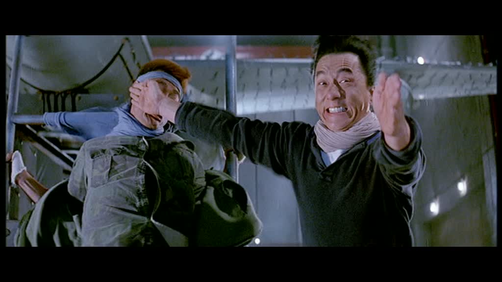 Au programme, aventure, humour et bastons, un cocktail qui a déjà fait ses preuves et qui fait ici des étincelles. Jackie ne fait pas les choses à moitié et c’est un festival de scènes vraiment comiques (le passage dans l’hôtel en plein désert par exemple) entrecoupées d’excellentes scènes de combats, parfois vraiment impressionnantes de part leurs cascades, mais toujours elles aussi remplies de passages comiques, pour finir en apothéose dans ce qui restera longtemps un des meilleurs moments de tous les films de Jackie Chan réunis, l’affrontement de ce dernier contre les excellents Ken Lo (Drunken Master 2, Thunderbolt) et Vincent Lyn (Outlaw Brothers, Tiger Cage) dans une immense soufflerie. L’action est donc bien présente, avec la traditionnelle course poursuite en voiture / moto typique de cette époque, mise en boîte par notre Rémi Julienne national, et ce tout le long du film. Pas le temps de s’ennuyer.