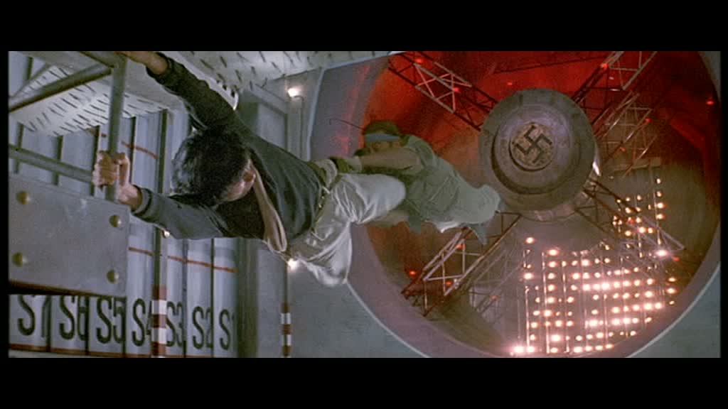 Et Jackie ne se moque pas de nous, puisqu’il nous livrera encore mieux par la suite, et qu’encore aujourd’hui, Opération Condor s’avère être un de ses meilleurs films, et au niveau du rythme, tout simplement son meilleur. Jackie balade ses personnages d’un endroit à un autre sans perdre de temps, en ne reculant devant rien, aidé par un budget qu’il explosa littéralement (ce qui fit que Jackie ne réalisa plus de films officiellement par la suite, même si l’on connaît ses aventures sur Crime Story, Niki Larson ou Drunken Master 2), et ça se voit à l’écran. Les décors sont nombreux, immenses, et Jackie n’hésite pas à le faire exploser dés qu’il le peut, souvent avec beaucoup d’humour, comme dans l’hôtel (scène en partie reprise dans son dernier film, Chinese Zodiac). Sans jamais ennuyer, et en nous faisant rire bien souvent (la scène de la gourde d’eau est tout simplement hilarante), Jackie nous emmène pour son final dans une base militaire Allemande de la seconde guerre mondiale, pour nous livrer un grand moment d’action. La scène dans la soufflerie restera en effet dans les mémoires bien longtemps, pour ses cascades de folies et ses délires abusés mais totalement réussis. Les mots ne suffisent pas à décrire le plaisir procuré par cette scène, où le métrage en général, tant il met de bonne humeur pour un long moment. Alors certes, on pourra bien dire que comme souvent, les personnages féminins ne servent pas à grand chose si ce n’est faire les potiches, que l’humour est souvent débile, mais Opération Condor est un pur plaisir ludique comme Jackie n’en a pas fait beaucoup par la suite malgré quelques excellentes productions.