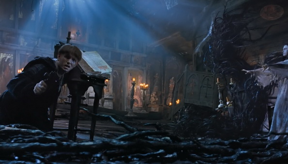 Après cette magnifique citation du génialissime philosophe Bruce Campbell (dans Evil Dead III, 1993), reprenons le fil de notre chronique. Oui, La Légende de Viy est un film clairement taillé pour l’international. Pourtant, chez nous et dans de nombreux autres pays, il ne sera qu’un Direct to Video parmi tant d’autres. Pourtant, une sortie dans les salles obscures aurait pu être envisagée sans aucun problème car visuellement, avec sa 3D native et avec ses très nombreux effets spéciaux, La Légende de Viy n’a pas à rougir de la comparaison avec certaines productions américaines. Car oui, La Légende de Viy est beau, La Légende de Viy est très beau même. Outre les paysages et les décors très baroques, un coté steampunk bienvenu même si pas assez poussé, le film ne lésine à aucun moment sur les effets spéciaux en images de synthèse, et ce jusque dans le générique qui fera le bonheur des possesseurs de matos 3D. D’autant plus que le bestiaire qui nous est proposé est des plus créatifs et à l’origine de la plupart des meilleures scènes du film visuellement parlant. La scène du repas nous propose des monstres tout bonnement hallucinants, que n’aurait pas renié un certain Guillermo Del toro, semblant sortis d’un esprit malade ou d’une soirée cuite / fumette magique qui serait partie sur un bad-trip. Multiples petits diablotins volants, racines vivantes à haut degré de prolifération, créatures étranges aux milles yeux ou tout simplement mix d’animaux improbables et surtout impossibles à décrire par écrit, l’imagination des scénaristes russes aura été plus que débordante et surtout bien plus originale que chez leurs meilleurs ennemis ricains.