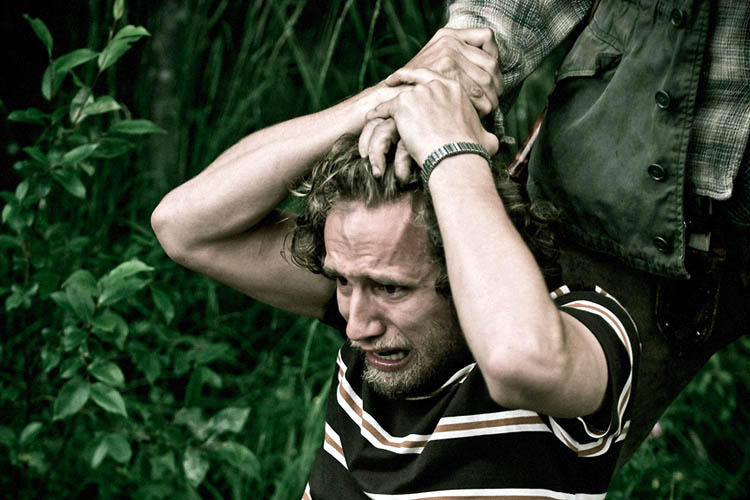 Le titre du film se justifie alors, puisque passées les 15 minutes d’exposition, l’heure restante n’est qu’une chasse à l’homme en forêt, ni plus ni moins. Si, dans le fond, cette heure ne réserve que peu de véritables surprise, avec son groupe qui va se séparer, certaines tensions présentes durant l’exposition qui vont ressurgir, quelques parties de cache-cache ou encore bien entendu un personnage qui va se rebeller pour survivre, elle demeure terriblement efficace et surtout à défaut d’être originale, bien filmée, bien photographiée et bien violente comme il faut. Le réalisateur sait ce qu’il fait semble-t-il et colle souvent au plus près de ses personnages pour nous faire ressentir cette traque dans toute sa tension, et nous surprendre lors de ses explosions de violence fort réussies. La mise en scène se fait donc efficace, le tout aidé par une photographie aux tons délavés (et un tournage avec la Red One 4K, permettant un résultat étonnant en lumière naturelle) et une musique de Simon Boswell (Bloody Bird, Le Maître des Illusions). Grâce à ces quelques atouts, ses excès de violence, et surtout sa durée courte ne permettant que peu d’égarements, Manhunt se fait efficace et tout à fait recommandable, bien qu’il ne réserve aucune surprise.