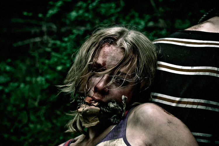 Personnages qui d’ailleurs énervent durant la mise en place, tant les stéréotypes sont forts et que forcément, voir le (faux) beau gosse du groupe traiter sa petite amie comme une moins que rien tape sur le système. Après quelques minutes, le groupe s’arrête dans une auberge et se heurte aux locaux peu amicaux, et finit par embarquer une jeune femme avec lui. Et comme pour l’auto-stoppeur de Massacre à la Tronçonneuse (encore et toujours), cela n’amènera que des soucis, et permettra au film de véritablement démarrer, et de nous permettre de laisser nos préjugés de côté pour savourer un film certes classique mais s’avérant terriblement violent et efficace. Car nos locaux un brin bouseux (décidément, peu importe le pays, il ne faut pas aller dans les coins paumés) n’y vont pas avec le dos de la cuillère, et n’hésitent pas à faire passer le message et leurs règles à coups de fusil à pompe ou de couteaux taille XXL, forçant ainsi nos quatre amis à se réfugier en pleine forêt avec pour seul et unique but de survivre.