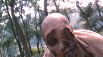 Puis arrive rapidement la scène dans l’auberge, sans doute la meilleure scène du film, où cette dernière, apparemment tranquille s’avère être un lieu hanté et petit à petit, tout ce qui se trouve dans cette auberge, aussi bien au niveau du décor que de ses occupants, va se transformer en un décor vieux, délabré, rempli de poussière, habité par des zombis, le tout grâce à de très jolis SFX vraiment bien intégrés, sorte de morphing de décor si on peut dire.