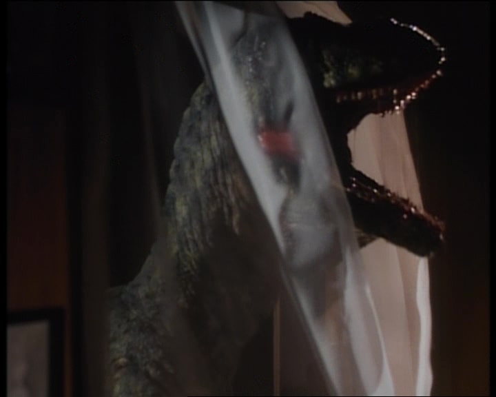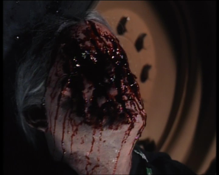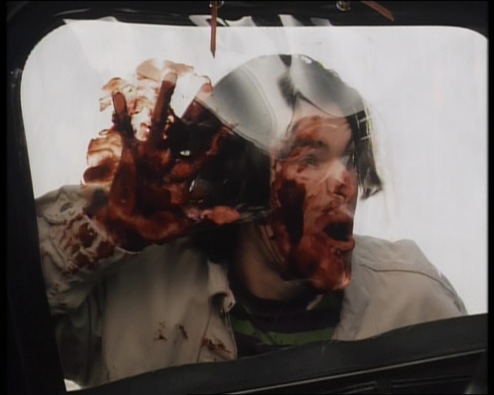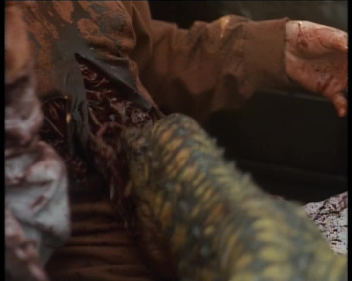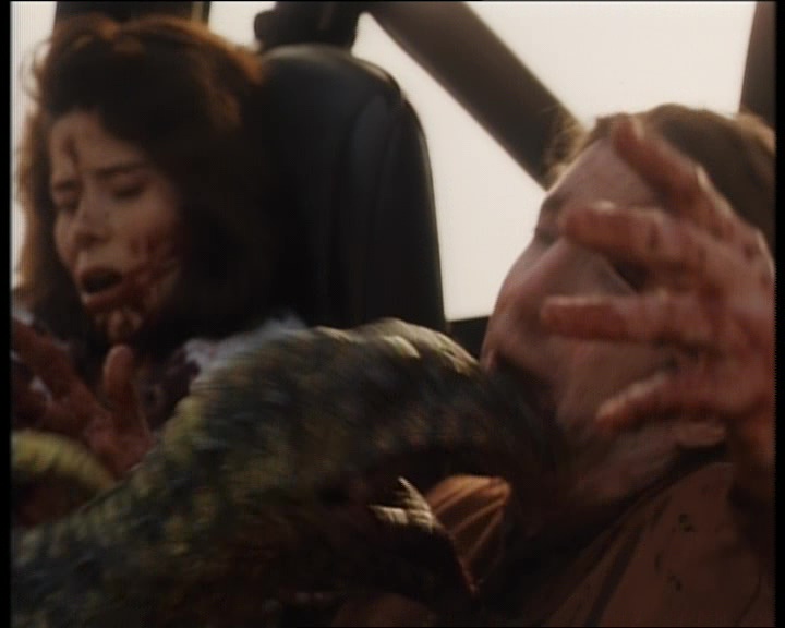 Bref on s’en fou. Carnosaur donc, c’est du dialogue 100% nanar, où des jeunes roulent à fond en voiture, et quand il s’arrête, l’un d’eux lance un « l’émotion moi ça me donne envie de pisser je reviens ». Du grand art on vous dit ! Lister tous les dialogues serait trop long, donc passons à ce qui nous intéresse tous, à savoir les dino. Mix entre des miniatures réduites, des marionnettes, des hommes en costumes et un modèle taille réelle qui n’a pas beaucoup servi car il ne marchait pas des masses (la classe ça, vu le prix que ça a du coûter), les attaques sont souvent hilarantes. Voir ce dinosaur au départ de la taille d’une peluche bouffer tout le monde, puis 2h après faire un mètre de plus, c’est brillant. Mais Adam Simon, le réalisateur, se lâche totalement dans ses attaques. Il faut contrebalancer Jurassic Park, et offrir au public ce qu’un blockbuster ne propose pas, à savoir, du gore. Super Deinonychus s’en donne à cœur joie justement. Décapitations, membres coupés, arrachés, mangés, tête griffées, corps transpercés. Un festival, surtout que les morts sont extrêmement nombreuses (pas loin de 30 je crois bien). Oui, Carnosaur n’ennuie pas, et aussi ridicule et con soit-il, on s’éclate.
