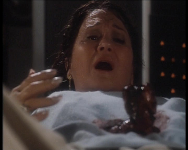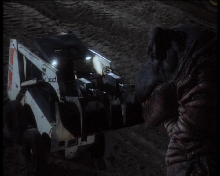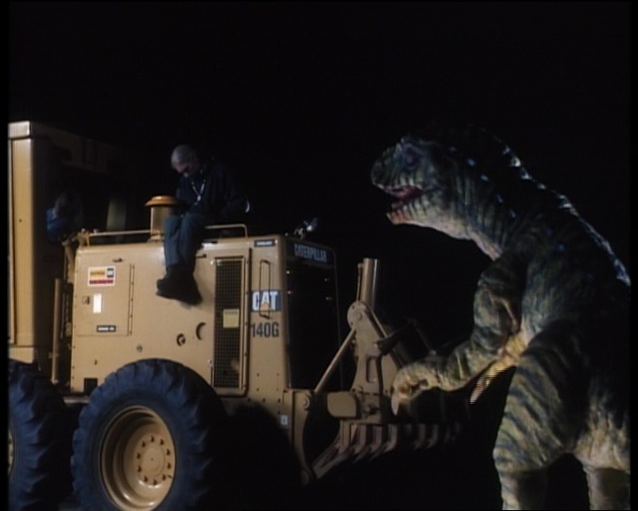 Mais ce n’est pas tout, car les nombreuses situations hors attaques valent de l’or aussi parfois. Voir des femmes accoucher d’œufs de dinosaures, c’est con, mais quand l’équipe décide que pour un des personnages, ben ce sera pas un œuf mais un hommage à Alien, wow quoi ! On pourra aussi citer la super VF du film, puisque tout le long, des informations arrivent à l’écran, nous tenant à jour sur l’heure et sur le taux de contamination de la zone, mais qu’au lieu de mettre un sous titre, on a une voix off, qui débarque quand elle veut, même si les personnages parlent, du coup on ne comprend rien. Et puis ce final, ah, ou quand un gros dino se décide à affronter un tractopelle, oui ça vaut de l’or. Et étrangement, à côté de tout ça, on a l’impression que le réalisateur a voulu faire son Romero, car oui, Carnosaur est un film extrêmement sombre, sans espoir, nihiliste. C’est simple, tout le monde meurt, il n’y a pas d’espoirs, les militaires tuent tout le monde, femmes hommes et enfants à coup de mitrailleuses car il ne faut pas que la contamination quitte la zone. Oui, Carnosaur c’est un gros nanar, mais avec ce petit truc en plus qui fait qu’on se dit qu’avec le même point de vu, mais un vrai budget, un vrai scénario et un bon réalisateur, ça aurait pu être bien. Mais non, ça reste un nanar. Un nanar recommandable, mais nanar.