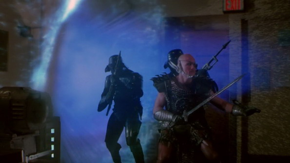 Tout ça est bien foireux, il faut l’admettre, pas un point ne rattrape l’autre et il faut avouer qu’on regarde Les Maîtres de l’Univers d’un œil amusé, rempli de second degré. Et ce ne sont pas les SFX qui vont arriver à rattraper la production design déjà bien catastrophique. Des effets spéciaux souvent très spéciaux, déjà complètement dépassés à l’époque où le film sort sur les écrans, ayant une forte tendance psychédélique / boule à facettes. Sans déconner, c’est quoi ce rose flashy !?! Ah, hey les gars, vous auriez pu faire attention de voir si les masques des acteurs étaient bien fixés… Voir des bouts de latex un peu branlants, c’est pas gégé hein… Puis c’est quoi ce look des sbires, Moebius est vraiment derrière le design ? Car là j’ai vraiment du mal à le croire… Et les scènes d’action, quelque part assez épiques soit dit en passant… Disons qu’elles sont à mi-chemin entre le ridicule et le ridicule, ce qui ne laisse pas une grosse possibilité de choix je vous l’accorde… Sorte de croisement entre les scènes d’action d’un mauvais épisode de X-Or et d’un film de Bud Spencer et Terence Hill. Oui, il y a du niveau… C’est mou du genou et les enchainements sont pachydermiques.