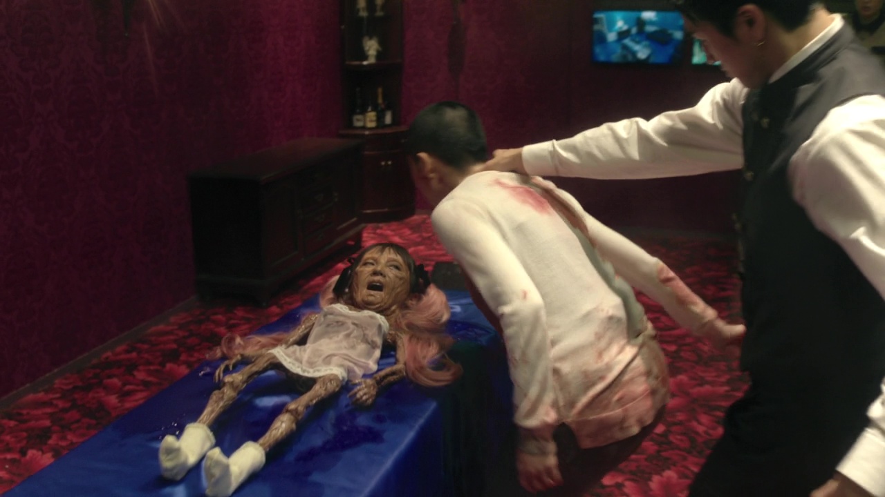 Vous vous en rendez sans doute compte si vous me lisez toujours, il est très difficile d’émettre un avis objectif et surtout constant sur la série, tant elle change parfois radicalement de visage, pour le pire et pour le meilleur. Il y en a certes pour tout le monde, mais sur l’ensemble des 10 épisodes, s’avère plus que déséquilibré. Les deux premiers épisodes plairont plus à certains, tandis que d’autres préféreront ce huis clos sanglant et baroque dans l’hôtel, tandis que d’autres préféreront l’aspect plus calme et social des trois derniers épisodes. Je n’en veux pas au réalisateur en tout cas. Je dois même avouer que de le voir avec une telle liberté et un budget confortable de la part d’Amazon (comme ce fut le cas après avec Netflix pour The Forest of Love, ou pour rester chez Amazon, comme Refn pour Too Old to Die Young), cela fait plaisir, et que c’est même important de laisser ces auteurs s’exprimer pleinement, sans ceinture de sécurité, sans personne pour les stopper, quitte à risquer l’overdose. Au milieu de toute cette folie, il reste bien évidemment des moments de grâce, et des ratés également. De la poésie, et du kitch. Du gore, du grotesque, et de l’amour, de la romance. Du dégoût et de l’attirance. Jamais pleinement convaincant, mais jamais détestable. Une série parfois fun, intéressante, amusante, et parfois qui laisse dubitatif. Mais elle a le mérite d’exister. Par contre, clairement dommage pour les quelques CGI, toujours ratés. Par contre, comme souvent avec Sono Sion, le casting est impeccable. Il retrouve Tomite Ami, qu’il avait dirigé sur Antiporno et qui rejoindra la série The Naked Director, et tourne pour la première fois avec Mitsushima Shinnosuke, qu’il retrouvera sur The Forest of Love.
