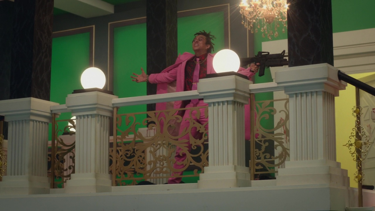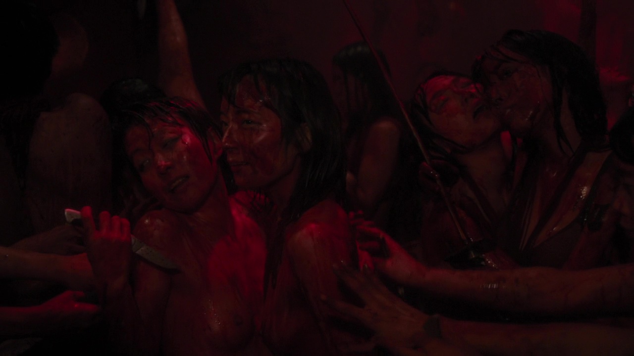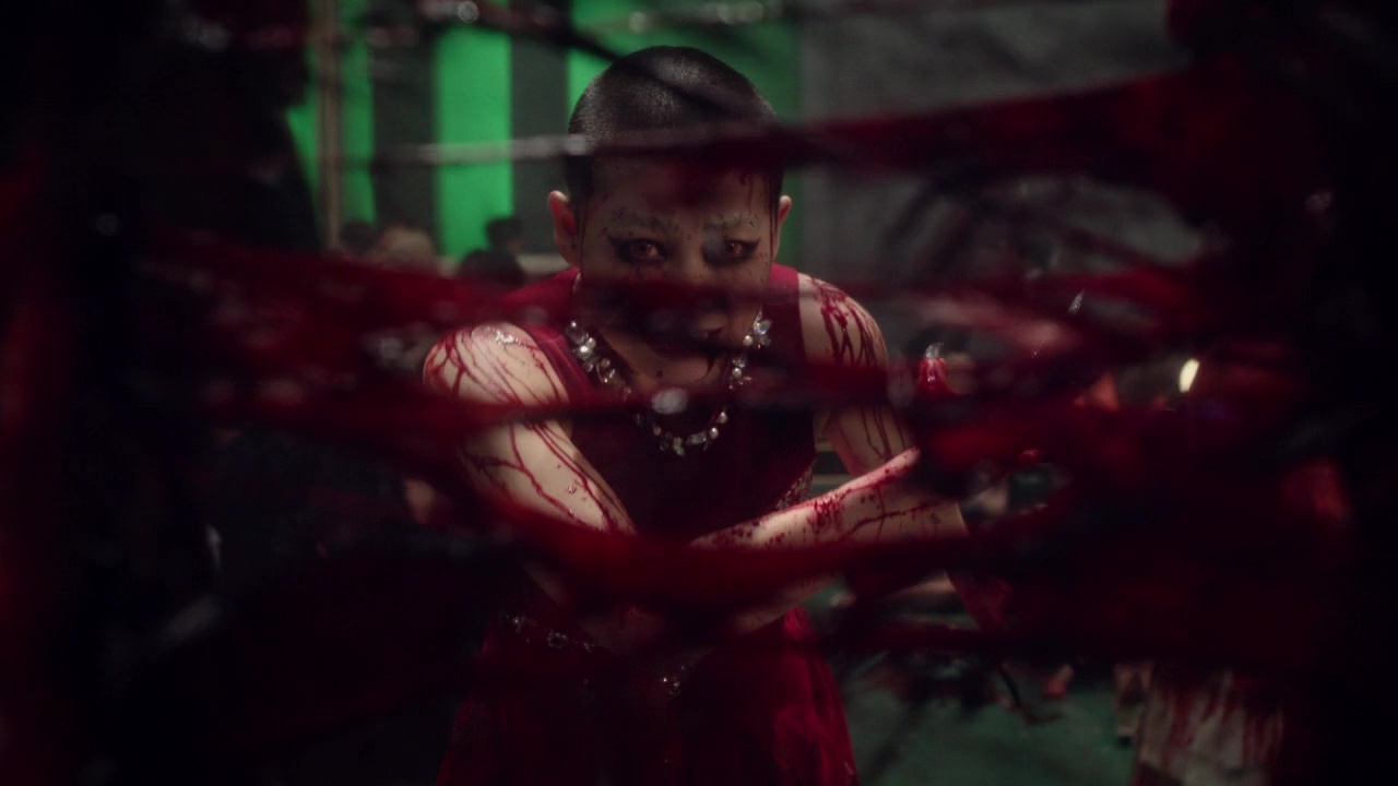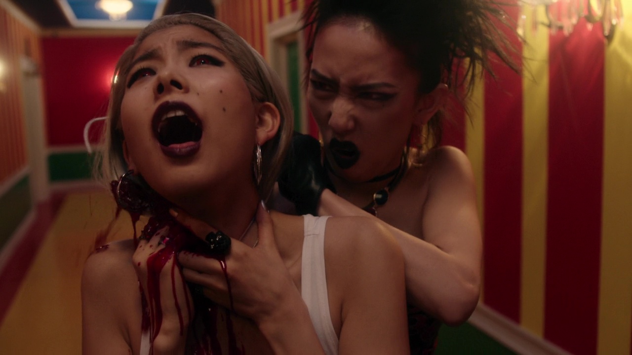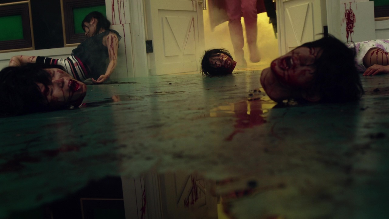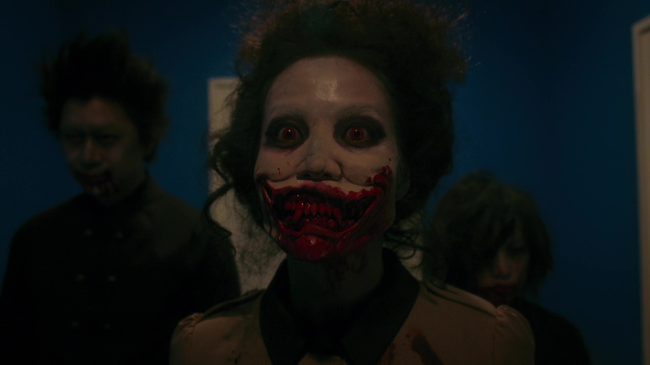 À savoir donc, des giclées de sang XXL, du gore, du kung-fu, des combats au sabre, de l’expressionisme Allemand, de l’humour, des culottes, du grotesque, des roumaines (fort charmantes), de la mythologie, de la musique classique, des lolitas, du Scarface, du cul, des fusillades, du néon, des couleurs pétantes, de la voix off, des idées par paquet de 30 à chaque plan. Et cela devient à la fois la force et la faiblesse de cette série. Une force car tous ces éléments, et bien moi, je les aime. Donc forcément, voir tout à coup un massacre tout kawaii mais hyper violent dans un restaurant, ou un combat plutôt sympa à l’arme blanche dans un couloir filmé en plan séquence qui se termine par une décapitation bien sanglante et sans effets numériques, je suis forcément client. Pareil lorsque Sono Sion se décide à rendre hommage de manière hyper appuyée certes à Scarface, hommage que l’on remarque dés l’arrivée à l’hôtel, dont le hall, en plus coloré, est une réplique exacte du manoir Montana, avec petite fontaine en bas. Et bien ça fonctionne, on attend la chute (dans tous les sens du terme) dans cette fontaine, et il en joue, puisque ces personnages, des vampires, ne tombent pas sous les balles. Parfois, il vire au gros grotesque qui peut rappeler Une Nuit en Enfer avec des vampires au look de démons bien crades. Et ça aussi, ça marche, ça fait plaisir. Le tout souvent sur du Bach (je vous ai déjà dit que j’étais un énorme fan de musique classique ?). C’est juste que souvent, on se dit « alors oui, c’est ultra fun, et ? ». À quoi tout cela mène ? Ça manque parfois de cohérence. De lien. Mais pas d’idées.