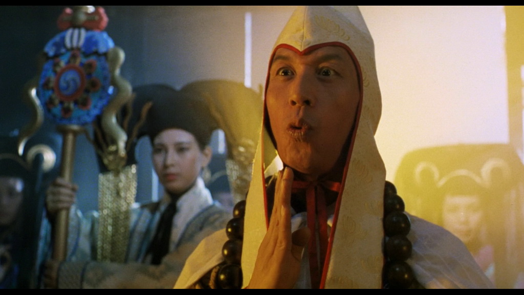 L’histoire suit de nouveau Ning (Leslie Cheung), qui, après ses mésaventures du premier film, se retrouve cette fois emprisonné par des brigands corrompus. Grâce à l’aide de son codétenu, il s’évade et se retrouve impliqué dans un conflit mêlant moines, pouvoirs magiques, démons et monstres géants, tout en intégrant un brin de romance pour faire le lien avec l’original. Là où le premier film trouvait un équilibre subtil entre les différents genres, cette suite multiplie les enjeux et les ingrédients : action débridée, humour omniprésent, créatures fantastiques et effets spéciaux à profusion. L’influence de Tsui Hark se ressent pleinement, avec combats spectaculaires, explosions, monstres géants et magies spectaculaires, parfois au détriment de la cohérence narrative. L’humour, plus poussé que dans le premier film, fonctionne parfois mais peut aussi tomber dans l’excès, tandis que la romance est reléguée au second plan et peine à retrouver l’alchimie du couple original. L’action domine largement, avec des combats au sabre, à mains nues et des pouvoirs surnaturels qui ajoutent à la démesure visuelle, mais rendent le récit parfois chaotique et inégal. Wu Ma, très présent dans le premier film, a un rôle plus secondaire, laissant Jacky Cheung endosser le rôle du moine pour les séquences d’action.