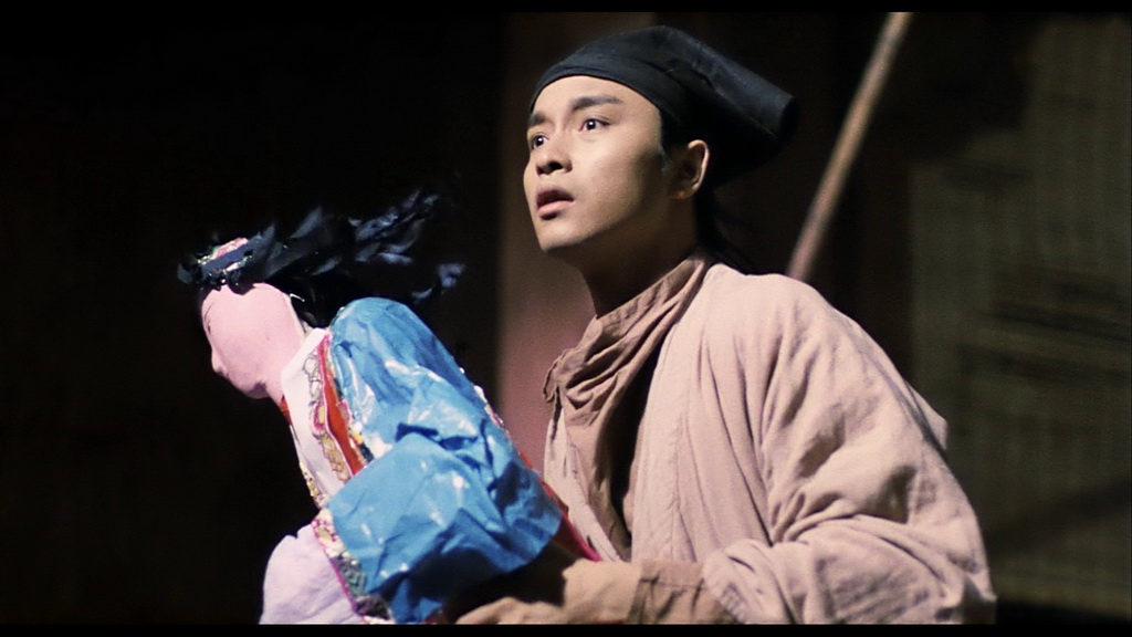 Derrière la caméra, l’équipe réunit des talents majeurs : Tsui Hark produit, tandis que Ching Siu-tung, alors presque débutant en tant que réalisateur, signe une mise en scène inventive. Chorégraphe reconnu, il a travaillé sur de nombreux films de la Shaw Brothers et sur des classiques comme Le Syndicat du Crime 2 ou The Killer. La musique, signée par Romeo Diaz et James Wong, contribue à l’atmosphère unique du film. Devant la caméra, Leslie Cheung incarne le naïf collecteur d’impôts Ning, Joey Wong joue le fantôme Hsiao-tsing, et Wu Ma le moine chasseur de fantômes, tandis que Wong Jing apparaît dans un petit rôle. Le récit suit Ning, maladroit et pauvre, qui doit passer la nuit dans un vieux temple hanté. C’est là qu’il rencontre le moine et Hsiao-tsing, ignorant que cette dernière est un fantôme esclave d’un démon millénaire. Le film mélange alors scènes de combat typiques du Wu Xia Pian, apparitions surnaturelles, humour léger et romance tragique. L’histoire explore l’amour impossible entre Ning et Hsiao-tsing, tout en maintenant un ton fataliste mais poétique, avec des scènes emblématiques comme le célèbre baiser dans le bain. Même après plus de 30 ans, le film conserve sa magie : la mise en scène dynamique, la photographie bleuâtre et surréaliste, les décors variés et les effets spéciaux, malgré certains aspects un peu datés, créent un univers fascinant. Le mélange de genres, les combats chorégraphiés, les monstres et zombies, et l’attention portée à l’histoire d’amour rendent le film généreux et équilibré, à la différence des suites plus exubérantes.