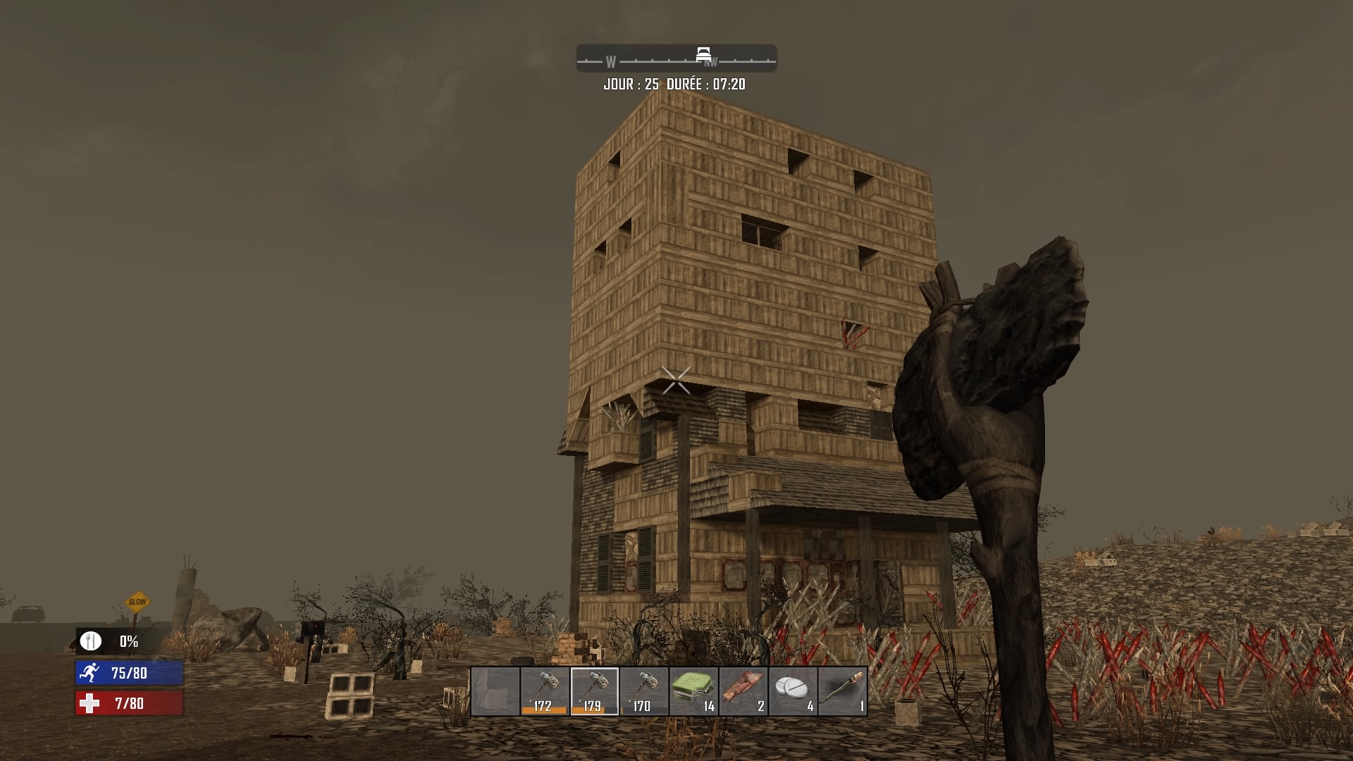 J’ai même un abri sur-protégé (un peu trop sans doute), avec une épaisseur de 5 murs de briques sur tous les côtés, plus un mur en fer forgé de chaque côté, 5 portes en fer forgé renforcé, et même… 7 étages, chacun protégé par une porte blindée et fermée à clé. Bien entendu, mon sac de couchage, mon feu de camp et ma forge, ainsi que divers coffre pour stocker mes affaires sont à l’intérieur, et j’ai une vue imprenable sur l’extérieur pour surveiller les alentours avec mon arc ! Oui, j’ai apprivoisé le jeu ! Bon de temps en temps, un faux pas est possible bien entendu, mais dans l’ensemble, je suis un vrai survivant maintenant, un warrior. Donc, après cette très longue introduction sur la différence entre mes premiers pas et mon niveau actuel, parlons peu mais parlons bien. 7 Days to Die est clairement un jeu surfant sur le succès de DayZ. On y retrouve beaucoup de mécaniques de gameplay que l’on m’avait expliqué à l’époque. Oui, on peut se vider de son sang, se casser la jambe, il faut se soigner, parfois ramper dans l’herbe pour ne pas être vu, faire attention aux autres joueurs qui deviennent une plus grande menace si l’on joue en ligne et tout et tout.